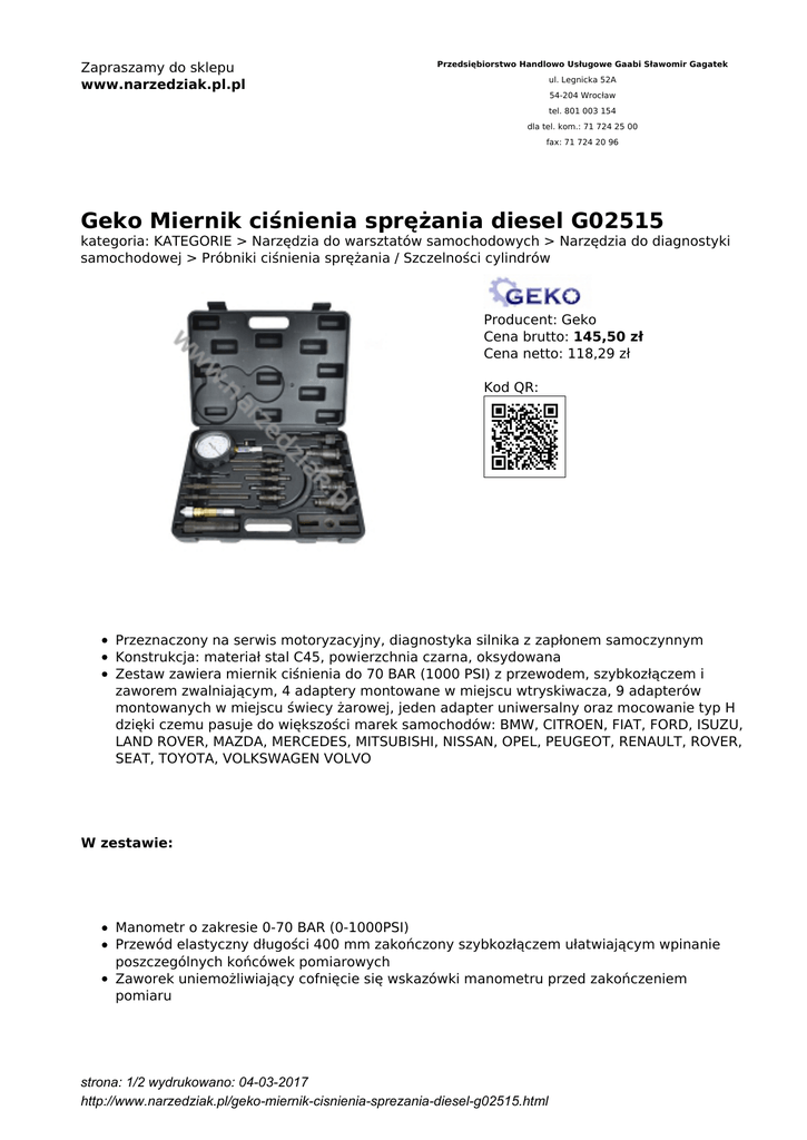 Zapraszamy do sklepu www.narzedziak.pl.pl Przedsiębiorstwo Handlowo Usługowe Gaabi Sławomir Gagatek ul. Legnicka 52A 54-204 Wrocław tel. 801 003 154 dla tel. kom.: 71 724 25 00 fax: 71 724 20 96 Geko Miernik ciśnienia sprężania diesel G02515 kategoria: KATEGORIE > Narzędzia do warsztatów samochodowych > Narzędzia do diagnostyki samochodowej > Próbniki ciśnienia sprężania / Szczelności cylindrów Producent: Geko Cena brutto: 145,50 zł Cena netto: 118,29 zł Kod QR: Przeznaczony na serwis motoryzacyjny, diagnostyka silnika z zapłonem samoczynnym Konstrukcja: materiał stal C45, powierzchnia czarna, oksydowana Zestaw zawiera miernik ciśnienia do 70 BAR (1000 PSI) z przewodem, szybkozłączem i zaworem zwalniającym, 4 adaptery montowane w miejscu wtryskiwacza, 9 adapterów montowanych w miejscu świecy żarowej, jeden adapter uniwersalny oraz mocowanie typ H dzięki czemu pasuje do większości marek samochodów: BMW, CITROEN, FIAT, FORD, ISUZU, LAND ROVER, MAZDA, MERCEDES, MITSUBISHI, NISSAN, OPEL, PEUGEOT, RENAULT, ROVER, SEAT, TOYOTA, VOLKSWAGEN VOLVO W zestawie: Manometr o zakresie 0-70 BAR (0-1000PSI) Przewód elastyczny długości 400 mm zakończony szybkozłączem ułatwiającym wpinanie poszczególnych końcówek pomiarowych Zaworek uniemożliwiający cofnięcie się wskazówki manometru przed zakończeniem pomiaru strona: 1/2 wydrukowano: 04-03-2017 http://www.narzedziak.pl/geko-miernik-cisnienia-sprezania-diesel-g02515.html Końcówki - adaptery pomiarowe 9 szt. 1. Końcówka gwint M10 x 1,25 - świeca żarowa 2. Końcówka gwint M12 x 1,25 - świeca żarowa (Opel, Peugeot, Mercedes, VW, Ford, Seat, Fiat, Renault, Citroen, Peugeot, Land Rover) 3. Końcówka gwint M24 x 2 - wtryskiwacz (VW, Audi, Mercedes, Opel, Peugeot) 4. Końcówka gwint M20 x 1,5 - wtryskiwacz 5. Końcówka gwint M1 x 1 - świeca żarowa LAND ROVER 6. Końcówka mocowania na jarzmo - świeca żarowa STANADYNE 7. Końcówka mocowania na jarzmo - wtryskiwacz DL 8. Końcówka gwint M10 x 1,25 - świeca żarowa długa 9. Końcówka pomiarowa M14 x 1,25 - świeca żarowa Belka pomocnicza do końcówek mocowanych przez jarzmo Adapter kolankowy z szybkozłączką strona: 2/2 wydrukowano: 04-03-2017 http://www.narzedziak.pl/geko-miernik-cisnienia-sprezania-diesel-g02515.html