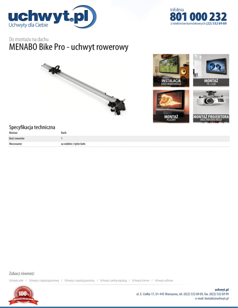 Do montażu na dachu MENABO Bike Pro - uchwyt rowerowy INSTALACJA MONTAŻ MONTAŻ MONTAŻ PROJEKTORA KINA DOMOWEGO PLAZMY TV / LCD MULTIMEDIALNEGO Specyfikacja techniczna Montaż Dach Ilość rowerów 1 Mocowanie za widelec i tylne koło Zobacz również: Uchwyty stałe / Uchwyty z regulacją pionową / Uchwyty z regulacją poziomą / Uchwyty z pełną regulacją / Uchwyty ścienne / Uchwyty sufitowe uchwyt.pl ul. E. Ciołka 17, 01-445 Warszawa, tel. (022) 532 69 69, fax. (022) 532 69 99 e-mail: [email protected]