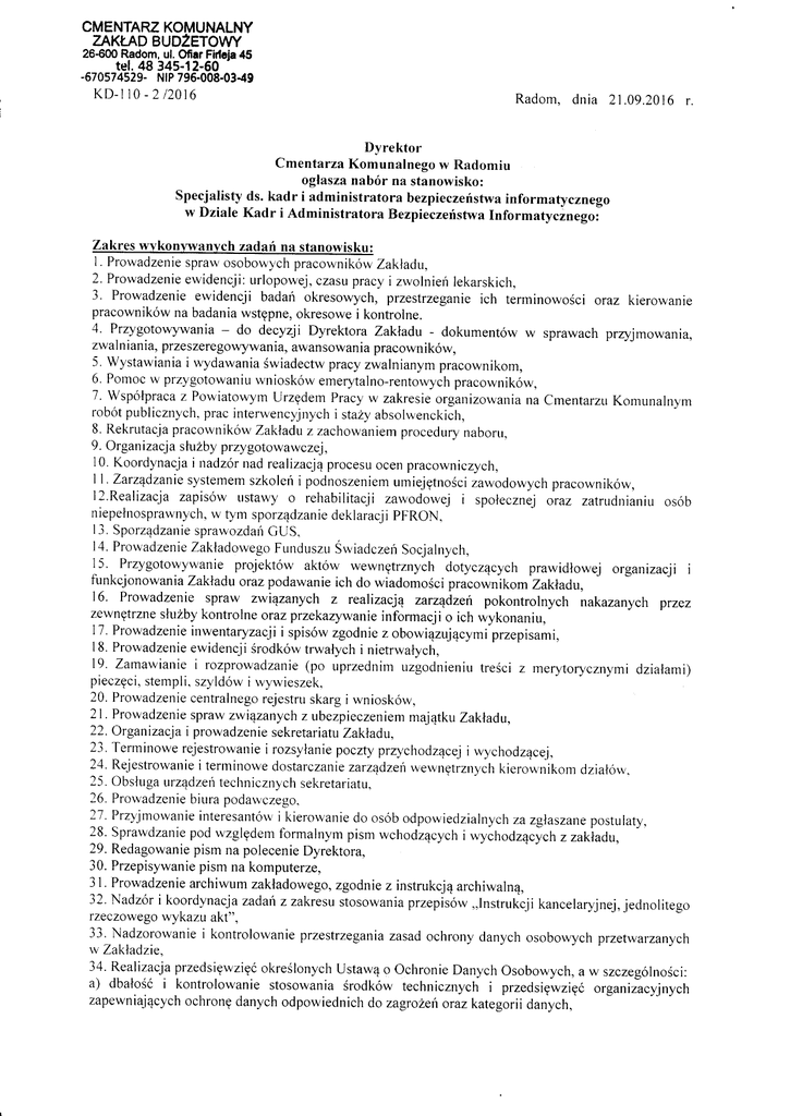 SPecjalisĘ ds. kadr i administratora bezpieczeństwa informatyc znego