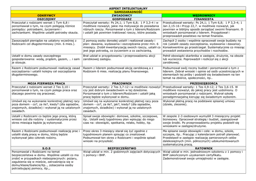 ODKRYWCY OSZCZĘDNY Przeczytał z rodzicami werset 1 Tym 6,8 i porozmawiał o tym, na czym polegają różnice pomiędzy: potrzebami, życzeniami i zachciankami. Wspólnie ustalili potrzeby skauta. ASPEKT INTELEKTUALNY SAMOZARADNOŚĆ ZWIADOWCY GOSPODARZ Przeczytał wersety: Ps 24,1; 1 Tym 6,8; 1 P 3,3-4 i w modlitwie rozważył, jakie ma motywacje do posiadania różnych rzeczy. Porozmawiał o tym z liderem/Rodzicem i ustalił jak powinien traktować rzeczy, które posiada. WĘDROWNICY FINANSISTA Przestudiował wersety: Ps 24,1; 1 Tym 6,8; 1 P 3,3-4; 1 Jan 2,15-16 i Przyp 22,7. w modlitwie rozważył, jak powinien w biblijny sposób zarządzać swoimi finansami. O wnioskach porozmawiał z liderem. Przygotował i przeprowadził poselstwo na temat finansów. Zaoszczędził pieniądze na ustalony wcześniej z Rodzicami cel długoterminowy (min. 6 mies.). Z pomocą osoby dorosłej ustalił i realizował zasady i plan: dawania, wydawania i oszczędzania przez min. 6 miesięcy. Zrobił inwentaryzację swoich rzeczy, ustalił co jest jego potrzebą, co życzeniem a co zachcianką. Zachęcił 2 osoby i wspólnie opracowali swoje budżety na rok (ustalili zasady oszczędzania, wydawania i dawania). Konsekwentnie go przestrzegał. Systematycznie co miesiąc prowadził zestawienia przychodów i rozchodów. Ustalił w domu zasady oszczędnego gospodarowania: wodą, prądem, gazem, … i sam je stosuje. Brał udział w przygotowaniu i przeprowadzeniu akcji zarobkowej zastępu. Pełnił obowiązki skarbnika w zastępie, drużynie, na obozie lub wycieczce. Poprowadził i rozliczył się z akcji zarobkowej. Razem z Rodzicami podsumowali realizację zasad oszczędzania i ustalili kolejny cel oszczędzania długoterminowego. Razem z liderem podsumował akcję zarobkową a z Rodzicem 6 mies. realizację planu finansowego. Podsumował swój roczny budżet i porozmawiał o tym z liderem. Zebrał wnioski i opinie od osób uczestniczących w elementach tej próby i podzielił się świadectwem na ten temat na zbiórce, społeczności, itp.. MOJA PIERWSZA PRACA Przeczytał z rodzicami werset 2 Tes 3,10 i porozmawiał o tym, na czym polega praca oraz dlaczego powinno się pracować. PRACOWNIK Przeczytał wersety: 2 Tes 3,7-12 i w modlitwie rozważył czy jest dobrym świadectwem w tej dziedzinie. Porozmawiał o tym z liderem/Rodzicem i ustalił jaką pracę będzie wykonywał w domu. PRZEDSIĘBIORCA Przestudiował wersety: 1 Tes 4,9-12; 2 Tes 3,6-15. W modlitwie rozważył, do jakiej pracy jest uzdolniony. O wnioskach porozmawiał z rodzicami. Wybrał szkołę ponadgimnazjalną kierując się świadomym wyborem. Umówił się na wykonanie konkretnej płatnej racy poza domem - co?, za ile?, kiedy? (dla sąsiadów, znajomych, dziadków) i wykonał ją na ustalonych zasadach. Umówił się na wykonanie konkretnej płatnej racy poza domem - co?, za ile?, jak?, kiedy? (dla sąsiadów, znajomych, dziadków) i wykonał ją na ustalonych zasadach. Wykonał płatną pracę na podstawie spisanej umowy (dzieło, zlecenie). Ustalił z Rodzicami co będzie jego pracą, którą wniesie coś dla rodziny i systematycznie przez okres miesiąca będzie ją wykonywał. Spisał swoje obowiązki: domowe, szkolne, szczepowe, itp.. Ustalił swój tygodniowy plan wpisując do niego czas na: obowiązki, spotkania, relaks, hobby, itp. W zespole 2-3 osobowym wymyślił 3 miesięczny projekt biznesowy. Opracował strategię i budżet, zaangażował swoje środki. Po przeprowadzeniu projektu podzielił się wnioskami w zastępie/drużynie. Razem z Rodzicami podsumowali realizację prac i ustalili stałą pracę w domu, którą będzie wykonywał jako członek rodziny. Przez okres 3 miesięcy starał się żyć zgodnie z tygodniowym planem spisując co zrealizował. Podsumował ten okres z Rodzicami i wspólnie spisali wnioski na przyszłość. S.O.S Porozmawiał z Rodzicami na temat bezpieczeństwa w domu. Wspólnie ustalili co ma zrobić w przypadkach niebezpiecznych: pożaru, zagubienia się w mieście, zatrzaśnięcia się w domu/klasie/toalecie/itp.., zobaczenia osoby potrzebującej pomocy, itp.,. Ma spisane swoje obowiązki i cele: w domu, szkole, szczepie, itp.. Pracując z kalendarzem potrafi planować. Przedstawił w zastępie realizację zamierzonych celów dalekosiężnych (min. półrocznych) udokumentowanych systematyczną pracą. BEZPIECZEŃSTWO RATOWNIK Wziął udział w min. 2 godzinnych zajęciach dotyczących Wziął udział w min. jednodniowym szkoleniu z 1 pomocy i 1 pomocy i BHP. BHP zakończonym uzyskaniem certyfikatu. Zademonstrował swoje umiejętności w zastępie. ODKRYWCY ZWIADOWCY Zna telefony alarmowe oraz wie kiedy i jak ich Wziął udział w zajęciach przeciwpożarowych. użyć. Zna swoje dane (imię, nazwisko, adres) oraz dane kontaktowe do Rodziców (telefony, miejsca pracy). Udowodnił to. Wie jak się zachować w przypadku zgubienia się Wie jak się zachować w przypadku pożaru budynku, na biwaku, wycieczce. Chodzi na biwaki, do lasu z lasu, szkoły, itp. Dowiedział się jak wygląda sprzęt gwizdkiem. przeciwpożarowy stosowany na biwaku/obozie i jak się go używa. Razem z zastępem porozmawiali na temat Razem z zastępem przeprowadził ćwiczenia, niebezpiecznych sytuacji na zbiórkach i ustalili jak zorganizował zawody przeciwpożarowe dla skautów. będą działać. Zrobili symulację niebezpiecznej sytuacji i działali zgodnie z planem. WĘDROWNICY Przeprowadził zajęcia dla młodszych z 1 pomocy i BHP na zbiórce lub biwaku/obozie. ZDROWE CIAŁO Przez miesiąc codziennie wykonywał cztery zadania: mycie zębów, zmienianie bielizny, mycie rąk przed posiłkami i czesanie włosów. DBAM O SIEBIE Ustalił z Rodzicami jakie i kiedy powinien jeść śniadania i przestrzega tych ustaleń. Sam robi sobie drugie śniadania do szkoły. LIDER ZDROWIA Wziął udział w szkoleniu dot. zdrowej żywności i zdrowego żywienia. Ustalił z Rodzicami zasady oglądania telewizji, korzystania z komputera i godz