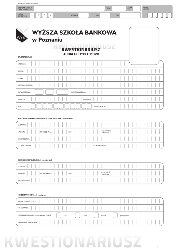 WYPEŁNIA WSB W POZNANIU NUMER ALBUMU LICZBA SEMESTRÓW 1 2 3 4 WPISOWE BON INNE KWESTIONARIUSZ STUDIA PODYPLOMOWE DANE PERSONALNE NAZWISKO: IMIONA: E-MAIL: NAZWISKO RODOWE: DATA URODZENIA: MIEJSCE URODZENIA: IMIĘ OJCA: IMIĘ MATKI: PESEL: OBYWATELSTWO: ADRES ZAMELDOWANIA LUB W PRZYPADKU JEGO BRAKU ADRES ZAMIESZKANIA ULICA/WIEŚ: NR DOMU: NR MIESZKANIA: KOD - MIEJSCOWOŚĆ KODOWA: WOJEWÓDZTWO: TEL. STACJONARNY: TEL. KOMÓRKOWY: ADRES DO KORESPONDENCJI (jeśli inny niż wyżej) ULICA/WIEŚ: NR DOMU: NR MIESZKANIA: KOD - MIEJSCOWOŚĆ KODOWA: WOJEWÓDZTWO: MIEJSCE ZATRUDNIENIA (dla pracujących) NAZWA ZAKŁADU PRACY: MIEJSCOWOŚĆ: LICZBA PRACOWNIKÓW (proszę wstawić znak X) 1-10 11-50 51-250 powyżej 250 ZAJMOWANE STANOWISKO: 1/3 UKOŃCZONA SZKOŁA WYŻSZA (proszę postawić znak x) NAZWA SZKOŁY WYŻSZEJ : MIEJSCOWOŚĆ: FORMA KSZTAŁCENIA STUDIA PIERWSZEGO STOPNIA (STUDIA LICENCJACKIE) STUDIA PIERWSZEGO STOPNIA (STUDIA INŻYNIERSKIE) JEDNOLITE STUDIA MAGISTERSKIE KIERUNEK/SPECJALNOŚĆ STUDIA DRUGIEGO STOPNIA (UZUPEŁNIAJĄCE STUDIA MAGISTERSKIE) ROK UKOŃCZENIA NR DYPLOMU: DATA WYDANIA DYPLOMU WYBRANA PRZEZ KANDYDATA FORMA STUDIÓW (proszę postawić znak x) STUDIA WEEKENDOWE STUDIA POPOŁUDNIOWE STUDIA ONLINE STUDIA BLENDED LEARNING WYBRANY PRZEZ KANDYDATA SYSTEM STUDIÓW (proszę postawić znak x) MODUŁOWY TRADYCYJNY JEDNOSEMESTRALNE STUDIA UZUPEŁNIAJĄCE DEKLARACJA WYBORU OPŁATY CZESNEGO WYBIERAM NASTĘPUJĄCY SPOSÓB OPŁATY CZESNEGO ZA STUDIA PODYPLOMOWE: w 1 racie w ratach semestralnych w 5 ratach (w przypadku studiów 1-semestralnych) w 10 ratach (w 11 ratach PSZN)* w 12 ratach w 15 ratach (w przypadku studiów 3-semestralnych w 18 ratach (w przypadku studiów 3-semestralnych) w 20 ratach (w przypadku studiów 3 -semestralnych) w 24 ratach (w przypadku studiów 4-semestralnych) w terminach zgodnych z harmonogramem opłat W przypadku studiów PSWN możliwość płatności w 1, 2 i 12 ratach ............................. PODPIS KANDYDATA OŚWIADCZENIA: Administratorem danych osobowych jest Wyższa Szkoła Bankowa w Poznaniu z siedzibą w Poznaniu, przy al. Niepodległości 2. Dane osobowe przetwarzane będą w celach rekrutacyjnych, w celu realizacji procesu dydaktycznego i monitoringu karier zawodowych absolwentów oraz w celach marketingowych i reklamowych. Dane mogą być udostępniane odbiorcom danych w rozumieniu art. 7 pkt. 6 ustawy o ochronie danych osobowych, tj. organom i podmiotom publicznym realizującym swoje zadania w obszarze szkolnictwa wyższego i wynikające z przepisów prawa. Podanie danych wynika z przepisów ustawy Prawo o szkolnictwie wyższym, odmowa ich podania jest równoważna z brakiem możliwości przystąpienia do rekrutacji na studia. Natomiast podanie danych osobowych, które przetwarzane będą w celach marketingowych i reklamowych jest dobrowolne. Każda osoba ma prawo dostępu do treści swoich danych oraz możliwość ich poprawiania w każdym czasie. Wyrażam zgodę na otrzymywanie materiałów koniecznych do realizacji umowy lub gdy jest to niezbędne do podjęcia działań przed zawarciem umowy na moje żądanie środkami komunikacji elektronicznej, w rozumieniu ustawy o świadczeniu usług drogą elektroniczną. Wyrażam zgodę na przetwarzanie moich danych osobowych przez administratora danych osobowych Wyższą Szkołę Bankową w Poznaniu w celach marketingowych i reklamowych, zgodnie z ustawą o ochronie danych osobowych. Wyrażam zgodę na przetwarzanie moich danych osobowych (imię i nazwisko, adres do korespondencji, adres e-mail, nr telefonu) przez administratora danych osobowych Wyższą Szkołę Bankową w Poznaniu w celach związanych z badaniem karier zawodowych absolwentów w dowolnym czasie, zgodnie z ustawą o ochronie danych osobowych. Wyrażam zgodę na otrzymywanie od Wyższej Szkoły Bankowej w Poznaniu informacji handlowej i materiałów promocyjnych środkami komunikacji elektronicznej w rozumieniu ustawy o świadczeniu usług drogą elektroniczną. Oświadczam, że zapoznałam /zapoznałem się z regulaminem studiów, regulaminem korzystania z systemu biblioteczno-informacyjnego oraz regulaminem promocji i zniżek. 2/3 PODPIS KANDYDATA WYBRANY KIERUNEK STUDIÓW PODYPLOMOWYCH Administracja – Prawo, Zarządzanie i Organizacja Organizacja i Zarządzanie Oświatą (1 semestr) Administrator Bezpieczeństwa Informacji Pedagogika Opiekuńczo - Wychowawcza (3 semestry) Akademia Trenera Pedagogika Opiekuńczo - Wychowawcza (1 semestr) Analityk Biznesowy Podatki Analityka Internetowa i Optymalizacja Konwersji Przygotowanie Kosztorysów i Ofert na Usługi Budowlane Analiza Finansowa Przygotowanie Pedagogiczne (3 semestry) Aplikacje internetowe i mobilne – stacjonarne Psychologia Zarządzania Aplikacje internetowe i mobilne – online Psychodietetyka Aplikacje internetowe i mobilne – blended Rachunkowość Arteterapia z elementami terapii pedagogicznej (3 semestry) Rachunkowość i Finanse Korporacyjne Audyt Podatkowy i Finansowy Bankowość Biznes w Internecie Budownictwo Niskoenergetyczne i Pasywne Coaching Controlling DNA Innowacyjnego Biznesu Doradca Bankowy Klienta Biznesowego Doradztwo Personalne z Elementami Coachingu Doradztwo Zawodowe i Edukacyjne Etyka dla Nauczycieli SAP - Zintegrowane Systemy Informatyczne Smart City- kreowanie przestrzeni publicznej Strategie i Zarządzanie Sieciami Handlowymi Strategie Sprzedaży Studia Menedżerskie Surdopedagogika (3 semestry) Terapia Pedagogiczna i Socjoterapia (3 semestry) Testowanie Oprogramowania Terapia Pedagogiczna (1 semestr) Tyflopedagogika (3 semestry) Windykacja i Zarządzanie Wierzytelnościami Ekspert ds. Cyberprzestępczości Wspomaganie Rozwoju Dziecka z Autyzmem i Zespołem Aspergera (3 semestry) Innowacyjny e marketing – stacjonarne Wycena Nieruchomości (3 semestry) Innowacyjny e marketing – blended Zakupy w Biznesie Innowacyjne Zarządzanie Marką Zamówienia Publiczne Język Angielski w Edukacji Wczesnoszkolnej i Przedszkolnej Zarządzanie i Inwest