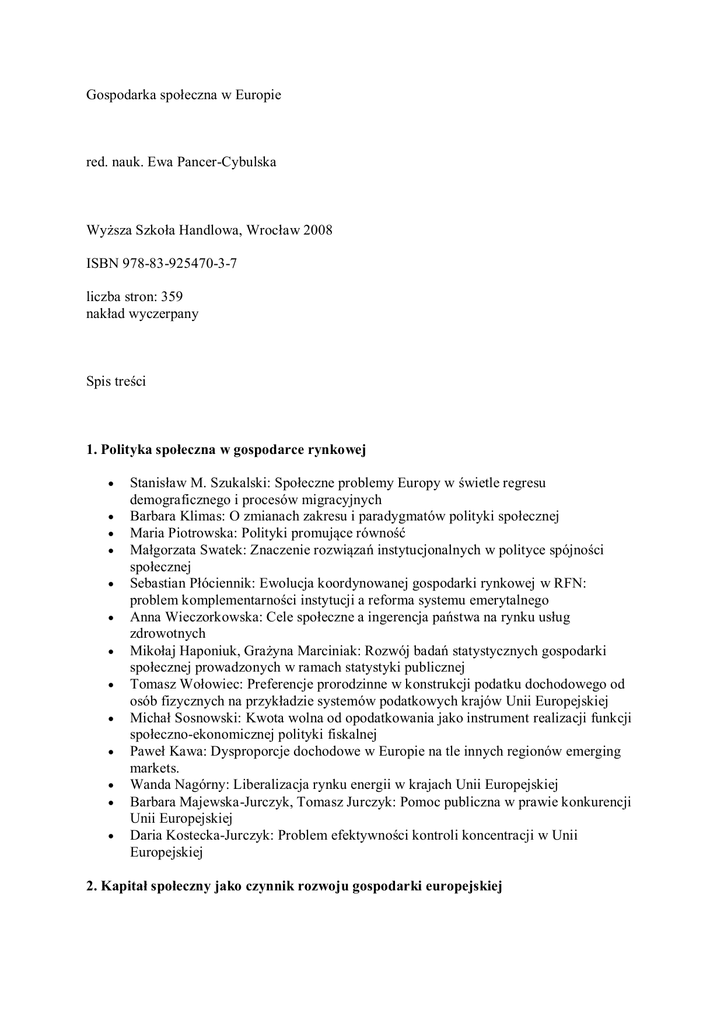 Gospodarka społeczna w Europie red. nauk. Ewa Pancer-Cybulska Wyższa Szkoła Handlowa, Wrocław 2008 ISBN 978-83-925470-3-7 liczba stron: 359 nakład wyczerpany Spis treści 1. Polityka społeczna w gospodarce rynkowej Stanisław M. Szukalski: Społeczne problemy Europy w świetle regresu demograficznego i procesów migracyjnych Barbara Klimas: O zmianach zakresu i paradygmatów polityki społecznej Maria Piotrowska: Polityki promujące równość Małgorzata Swatek: Znaczenie rozwiązań instytucjonalnych w polityce spójności społecznej Sebastian Płóciennik: Ewolucja koordynowanej gospodarki rynkowej w RFN: problem komplementarności instytucji a reforma systemu emerytalnego Anna Wieczorkowska: Cele społeczne a ingerencja państwa na rynku usług zdrowotnych Mikołaj Haponiuk, Grażyna Marciniak: Rozwój badań statystycznych gospodarki społecznej prowadzonych w ramach statystyki publicznej Tomasz Wołowiec: Preferencje prorodzinne w konstrukcji podatku dochodowego od osób fizycznych na przykładzie systemów podatkowych krajów Unii Europejskiej Michał Sosnowski: Kwota wolna od opodatkowania jako instrument realizacji funkcji społeczno-ekonomicznej polityki fiskalnej Paweł Kawa: Dysproporcje dochodowe w Europie na tle innych regionów emerging markets. Wanda Nagórny: Liberalizacja rynku energii w krajach Unii Europejskiej Barbara Majewska-Jurczyk, Tomasz Jurczyk: Pomoc publiczna w prawie konkurencji Unii Europejskiej Daria Kostecka-Jurczyk: Problem efektywności kontroli koncentracji w Unii Europejskiej 2. Kapitał społeczny jako czynnik rozwoju gospodarki europejskiej Paweł Turczyński: Kapitał społeczny w Polsce XXI w. – powstawanie, erozja, alokacja Ewa Polak, Waldemar Polak: Rola edukacji w kształtowaniu społeczeństwa informacyjnego Bartosz Scheuer: O kryzysie współczesnego społeczeństwa, czyli nasza wesoła apokalipsa wciąż na nowo przeżywana Monika Grabowska: Społeczeństwo obywatelskie wobec ochrony środowiska (w świetle Konwencji z Aarhus) Radosław Kupczyk: Rola kapitału ludzkiego w europejskiej gospodarce opartej na wiedzy Paweł Urgacz: Państwo a gospodarka w świetle nauczania Jana Pawła II Katarzyna Kozub-Kulik: Senior w wirtualnej przestrzeni informacyjnej Rafał Wiśniewski: Rozwój potencjału kulturowo-społecznego młodzieży: programy stypendialne organizacji kościelnych Joanna Nogieć: Polscy studenci przyszłością europejskiej gospodarki? Anna Drapińska: W jaki sposób szkoła wyższa powinna tworzyć miejsca na poszczególnych kierunkach studiów – determinanty 3. Samorząd terytorialny i inne podmioty gospodarki społecznej Krystyna Śliwińska, Michał Jaśniok: Polityka społeczna samorządu terytorialnego w aspekcie relacji z interesariuszami Sławomir Gawroński: Marketing gmin i regionów - orientacja marketingowa samorządów terytorialnych w świetle badań empirycznych Mariola Jaromin: Polityka informacyjna władz samorządowych w realizacji strategii rozwoju lokalnego Joanna Kenc: Problemy społeczne jako obszar działalności Eurocities Rafał Parvi: Podmioty gospodarki społecznej Magdalena Mróz: Fundacje jako podmioty gospodarki społecznej w Niemczech Barbara Trzaska: Rola i funkcje organizacji non-profit w gospodarce społecznej Barbara Słowińska: Znaczenie współpracy transgranicznej w kontekście integracji europejskiej w opinii mieszkańców województwa lubuskiego 4. Problemy rynku pracy w Unii Europejskiej Jerzy Kociszewski, Robert Krzemień: Ewolucja rynku pracy w Polsce w okresie transformacji gospodarczej ze szczególnym uwzględnieniem bezrobocia Elżbieta Rogalska, Adam P. Balcerzak: Efektywność europejskiego rynku pracy w świetle analizy taksonomicznej Magdalena Knapińska: Jednolity rynek pracy i migracje w Unii Europejskiej Anna Kozub: Wpływ migracji ludności na relacje społeczne we Włoszech Łukasz Kozub: Migracja zarobkowa Polaków. Wykluczenie społeczne czy szansa na lepsze życie? Teresa Kupczyk: Kobiety w zarządzaniu – równe prawa i kompetencje, nierówne szanse Tomasz Tadeusz Brzozowski: Etyczne implikacje nieuczestniczenia w życiu społecznym poprzez pracę Agnieszka Dejnaka: Telepraca – nowa i szybko rozwijająca się forma pracy Barbara Batko: Jakość informacji dotyczących rynku pracy upowszechnianych za pomocą Internetu przez instytucje publiczne