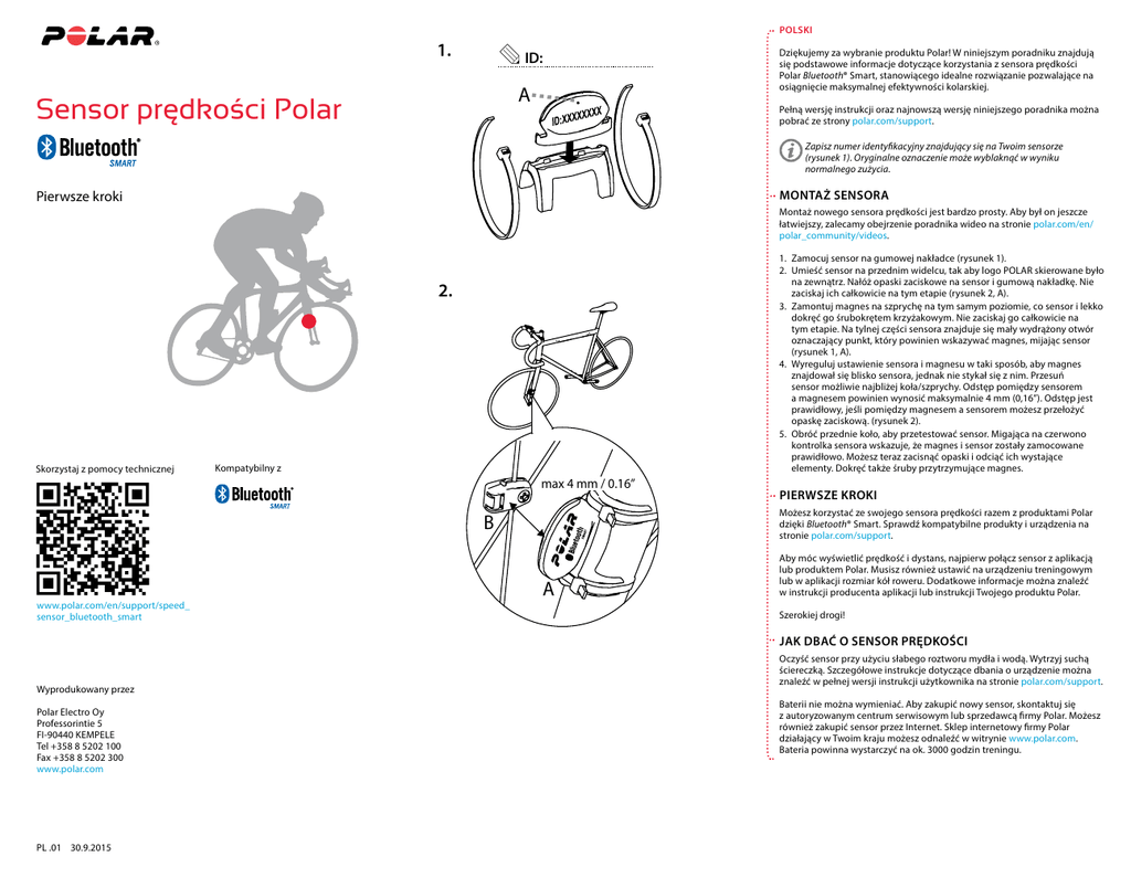 POLSKI 1. Id: A Sensor prędkości Polar Dziękujemy za wybranie produktu Polar! W niniejszym poradniku znajdują się podstawowe informacje dotyczące korzystania z sensora prędkości Polar Bluetooth® Smart, stanowiącego idealne rozwiązanie pozwalające na osiągnięcie maksymalnej efektywności kolarskiej. Pełną wersję instrukcji oraz najnowszą wersję niniejszego poradnika można pobrać ze strony polar.com/support. Zapisz numer identyfikacyjny znajdujący się na Twoim sensorze (rysunek 1). Oryginalne oznaczenie może wyblaknąć w wyniku normalnego zużycia. Montaż sensora Pierwsze kroki Montaż nowego sensora prędkości jest bardzo prosty. Aby był on jeszcze łatwiejszy, zalecamy obejrzenie poradnika wideo na stronie polar.com/en/ polar_community/videos. 1. Zamocuj sensor na gumowej nakładce (rysunek 1). 2. Umieść sensor na przednim widelcu, tak aby logo POLAR skierowane było na zewnątrz. Nałóż opaski zaciskowe na sensor i gumową nakładkę. Nie zaciskaj ich całkowicie na tym etapie (rysunek 2, A). 3. Zamontuj magnes na szprychę na tym samym poziomie, co sensor i lekko dokręć go śrubokrętem krzyżakowym. Nie zaciskaj go całkowicie na tym etapie. Na tylnej części sensora znajduje się mały wydrążony otwór oznaczający punkt, który powinien wskazywać magnes, mijając sensor (rysunek 1, A). 4. Wyreguluj ustawienie sensora i magnesu w taki sposób, aby magnes znajdował się blisko sensora, jednak nie stykał się z nim. Przesuń sensor możliwie najbliżej koła/szprychy. Odstęp pomiędzy sensorem a magnesem powinien wynosić maksymalnie 4 mm (0,16’’). Odstęp jest prawidłowy, jeśli pomiędzy magnesem a sensorem możesz przełożyć opaskę zaciskową. (rysunek 2). 5. Obróć przednie koło, aby przetestować sensor. Migająca na czerwono kontrolka sensora wskazuje, że magnes i sensor zostały zamocowane prawidłowo. Możesz teraz zacisnąć opaski i odciąć ich wystające elementy. Dokręć także śruby przytrzymujące magnes. 2. Skorzystaj z pomocy technicznej Kompatybilny z max 4 mm / 0.16” B www.polar.com/en/support/speed_ sensor_bluetooth_smart Pierwsze kroki Możesz korzystać ze swojego sensora prędkości razem z produktami Polar dzięki Bluetooth® Smart. Sprawdź kompatybilne produkty i urządzenia na stronie polar.com/support. A Aby móc wyświetlić prędkość i dystans, najpierw połącz sensor z aplikacją lub produktem Polar. Musisz również ustawić na urządzeniu treningowym lub w aplikacji rozmiar kół roweru. Dodatkowe informacje można znaleźć w instrukcji producenta aplikacji lub instrukcji Twojego produktu Polar. Szerokiej drogi! Jak dbać o sensor prędkości Wyprodukowany przez Polar Electro Oy Professorintie 5 FI-90440 KEMPELE Tel +358 8 5202 100 Fax +358 8 5202 300 www.polar.com PL .01 30.9.2015 Oczyść sensor przy użyciu słabego roztworu mydła i wodą. Wytrzyj suchą ściereczką. Szczegółowe instrukcje dotyczące dbania o urządzenie można znaleźć w pełnej wersji instrukcji użytkownika na stronie polar.com/support. Baterii nie można wymieniać. Aby zakupić nowy sensor, skontaktuj się z autoryzowanym centrum serwisowym lub sprzedawcą firmy Polar. Możesz również zakupić sensor przez Internet. Sklep internetowy firmy Polar działający w Twoim kraju możesz odnaleźć w witrynie www.polar.com. Bateria powinna wystarczyć na ok. 3000 godzin treningu.