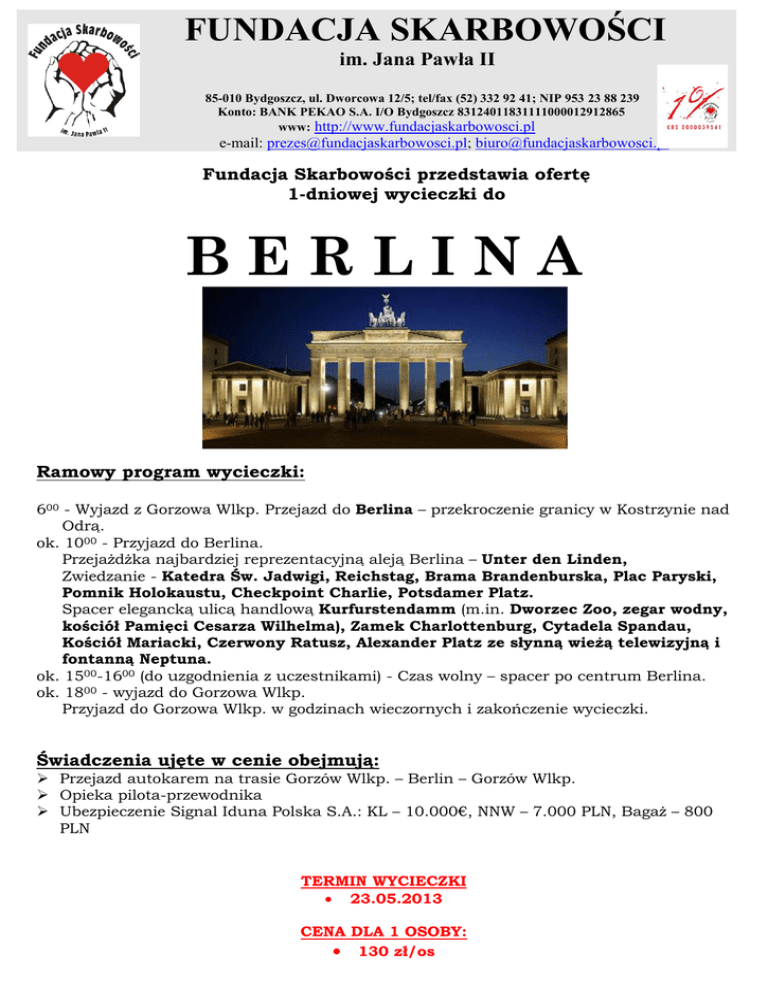 FUNDACJA SKARBOWOŚCI im. Jana Pawła II 85-010 Bydgoszcz, ul. Dworcowa 12/5; tel/fax (52) 332 92 41; NIP 953 23 88 239 Konto: BANK PEKAO S.A. I/O Bydgoszcz 83124011831111000012912865 www: http://www.fundacjaskarbowosci.pl e-mail: [email protected]; [email protected] Fundacja Skarbowości przedstawia ofertę 1-dniowej wycieczki do BERLINA Ramowy program wycieczki: 600 - Wyjazd z Gorzowa Wlkp. Przejazd do Berlina – przekroczenie granicy w Kostrzynie nad Odrą. ok. 1000 - Przyjazd do Berlina. Przejażdżka najbardziej reprezentacyjną aleją Berlina – Unter den Linden, Zwiedzanie - Katedra Św. Jadwigi, Reichstag, Brama Brandenburska, Plac Paryski, Pomnik Holokaustu, Checkpoint Charlie, Potsdamer Platz. Spacer elegancką ulicą handlową Kurfurstendamm (m.in. Dworzec Zoo, zegar wodny, kościół Pamięci Cesarza Wilhelma), Zamek Charlottenburg, Cytadela Spandau, Kościół Mariacki, Czerwony Ratusz, Alexander Platz ze słynną wieżą telewizyjną i fontanną Neptuna. ok. 1500-1600 (do uzgodnienia z uczestnikami) - Czas wolny – spacer po centrum Berlina. ok. 1800 - wyjazd do Gorzowa Wlkp. Przyjazd do Gorzowa Wlkp. w godzinach wieczornych i zakończenie wycieczki. Świadczenia ujęte w cenie obejmują: Przejazd autokarem na trasie Gorzów Wlkp. – Berlin – Gorzów Wlkp. Opieka pilota-przewodnika Ubezpieczenie Signal Iduna Polska S.A.: KL – 10.000€, NNW – 7.000 PLN, Bagaż – 800 PLN TERMIN WYCIECZKI 23.05.2013 CENA DLA 1 OSOBY: 130 zł/os ZGŁOSZENIA - za załączonym druku I WPŁATY – do dnia 28 lutego 2013 roku - przyjmuje: Fundacja Skarbowości im. Jana Pawła II 85-010 Bydgoszcz, ul. Dworcowa 12/5 tel./fax 52 332 92 41 mail: [email protected] Nr konta: Bank PeKaO SA I/O Bydgoszcz 83 1240 1183 1111 0000 1291 2865 Informacje dodatkowe: 1. Uczestnicy zobowiązani są posiadać ważny dokument uprawniający do przekroczenia granicy państwowej: waży paszport lub dowód osobisty. 2. Nie występują zniżki dla dzieci i młodzieży. 3. Na wstępy do zwiedzanych obiektów /fakultatywnie/ należy posiadać ok. 30€/osoba/: wieżą widokowa na Alexanderplatz, Katedra, muzeum Egipskie lub Pergramon…. / 4. W przypadku rezygnacji z wyjazdu do dnia 15 marca 2013 r. Fundacja zwróci 100 % dokonanej wpłaty. Po 15 marca 2013 roku nie będą dokonywane zwroty wniesionych opłat za udział w wycieczce. Istnieje jednak możliwość zamiany osób.