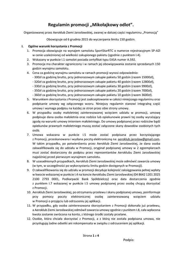 Regulamin promocji „Mikołajkowy odlot”. Organizowanej przez Aeroklub Ziemi Jarosławskiej, zwanej w dalszej części regulaminu „Promocją” Obowiązuje od 6 grudnia 2015 do wyczerpania limitu 150 godzin. I. Ogólne warunki korzystania z Promocji 1. Promocja obowiązuje na wynajem samolotu SportStarRTC o numerze rejestracyjnym SP-AZI w cenie uzależnionej od wielkości zakupionego pakietu (zgodnie z punktem I.4). 2. Wskazany w punkcie I.1 samolot posiada certyfikat typu EASA numer A.592. 3. Promocja ma charakter ograniczony i w ramach jej obowiązywania zostanie sprzedanych 150 godzin wynajmu samolotu. 4. Cena za godzinę wynajmu samolotu w ramach promocji wynosi odpowiednio: - 300zł za godzinę brutto, przy jednorazowym zakupie pakietu 50 godzin (razem 15000zł), - 320zł za godzinę brutto, przy jednorazowym zakupie pakietu 40 godzin (razem 12800zł), - 330zł za godzinę brutto, przy jednorazowym zakupie pakietu 30 godzin (razem 9900zł), - 350zł za godzinę brutto, przy jednorazowym zakupie pakietu 20 godzin (razem 7000zł), - 360zł za godzinę brutto, przy jednorazowym zakupie pakietu 10 godzin (razem 3600zł). 5. Warunkiem skorzystania z Promocji jest zaakceptowanie w całości niniejszego regulaminu oraz podpisanie umowy wg załączonego wzoru. Niniejszy regulamin stanowi integralną część umowy i wymaga podpisu na każdej ze stron przez obie strony umowy. 6. W przypadku osoby małoletniej zainteresowanej wzięciem udziału w promocji, umowę podpisuje dana osoba małoletnia oraz rodzice lub opiekunowie prawni tej osoby wyrażający zgodę na warunki umowy imieniem małoletniego. Do umowy podpisanej przez rodziców bądź opiekunów prawnych małoletniego muszą zostać załączone skany dowodów osobistych tych osób. 7. Umowa wskazana w punkcie I.5 może zostać podpisana przez korzystającego z Promocji, przeskanowana i wysłana pocztą elektroniczną na: [email protected]. W takim przypadku, po potwierdzeniu przez Aeroklub Ziemi Jarosławskiej, że dana osoba zakwalifikowała się do udziału w Promocji, oryginał podpisanej umowy w 2 egzemplarzach musi zostać dostarczony do podpisu przez reprezentantów Aeroklubu Ziemi Jarosławskiej najpóźniej przed pierwszym wynajmem samolotu. 8. W uzasadnionych przypadkach, Aeroklub Ziemi Jarosławskiej może odmówić zawarcia umowy (w tym, w szczególności po wykorzystaniu limitu godzin dostępnych w Promocji). 9. O zakwalifikowaniu się do udziału w promocji decyduje kolejność zaksięgowania pełnej wpłaty w kwocie wskazanej w punkcie I.4 na koncie Aeroklubu Ziemi Jarosławskiej (04 8642 1201 2025 2100 2793 0001, Podkarpacki Bank Spółdzielczy) oraz data dostarczenia zgodnie z punktem I.7 wskazanej w punkcie I.5 umowy podpisanej przez osobę chcącą skorzystać z Promocji. 10. Aeroklub Ziemi Jarosławskiej, po otrzymaniu przelewu i skanu podpisanej umowy, poinformuje przy pomocy poczty elektronicznej osobę zainteresowaną wzięciem udziału w Promocji o przyjęciu lub odrzuceniu jej aplikacji. 11. W przypadku, gdy osoba zainteresowana skorzystaniem z Promocji dokonała już przelewu, a Aeroklub Ziemi Jarosławskiej odmówił zawarcia umowy zgodnie z punktem I.8, cała wpłacona kwota zostanie zwrócona na konto, z którego środki zostały przelane. 12. Osobie, która chciała skorzystać z Promocji, a z którą nie została podpisana umowa, nie przysługują żadne odsetki ani rekompensata w związku z odrzuceniem jej aplikacji. Strona 1 z 4 Podpis: 13. Aeroklub Ziemi Jarosławskiej będzie publikował na swojej stronie internetowej pod adresem: www.aeroklub.jaroslaw.pl orientacyjną ilość pozostałych w promocji godzin, niemniej jednak nie ponosi żadnej odpowiedzialności za opóźnienie w aktualizacji tej treści. II. Szczegółowe warunki korzystania z samolotu SportStarRTC wynajmowanego w ramach Promocji przez pilotów posiadających co najmniej licencję LAPL(A) lub PPL(A). 1. Pierwsze dwie godziny z wykupionego pakietu zostaną wykorzystane na przeszkolenie na nowy typ samolotu (tzw. „laszowanie”) w lotach z przedstawicielem Aeroklubu Ziemi Jarosławskiej. 2. Jeśli po wykorzystaniu wskazanych w punkcie II.1 dwóch godzin, przedstawiciel Aeroklubu Ziemi Jarosławskiej stwierdzi, że osoba korzystająca z Promocji nie opanowała samolotu i wszystkich zamontowanych na nim systemów w sposób dający pewność, co do bezpiecznej dalszej eksploatacji samolotu, istnieje możliwość wykonania (na wniosek korzystającego z Promocji) dalszych lotów z przedstawicielem Aeroklubu Ziemi Jarosławskiej mających na celu pełne opanowanie samolotu. 3. Osoba korzystająca z Promocji może wycofać się z korzystania z Promocji po wykorzystaniu dwóch godzin przeznaczonych na przeszkolenie na nowy typ samolotu. W takim wypadku za dotychczas wykorzystane dwie godziny będzie się należała odpłatność regularna wynikająca z aktualnie obowiązującego cennika. Pozostała kwota zostanie korzystającemu z Promocji zwrócona na konto, a umowa zostanie rozwiązana za porozumieniem stron. 4. Osoba korzystająca z Promocji zobowiązuje się bezwzględnie przestrzegać prawa, przepisów oraz zasad użytkowania samolotu sprecyzowanych w Pilot’s Operating Handbook (POH) Standard Operating Procedures (SOP) oraz QuickRefferenceHandbook (QRH). 5. Wykupione w ramach Promocji pakiety mają okres ważności 12 miesięcy od dnia podpisania umowy lub zaksięgowania środków na koncie Aeroklubu Ziemi Jarosławskiej (co nastąpiło wcześniej). Po tym okresie niewykorzystane godziny przepadają, a osoba korzystająca z Promocji nie ma możliwości odzyskania wpłaconych środków. 6. Wykupiony pakiet można wykorzystać na budowanie nalotu, trening własny, bądź turystykę lotniczą. Udział w zawodach jest możliwy pod warunkiem opłacenia przez korzystającego z Promocji pełnej kwoty wymaganej do rozszerzenia zakresu ubezpieczenia. III. Szczegółowe warunki korzystania z samolotu SportStarRTCw celu szkolenia do licencji