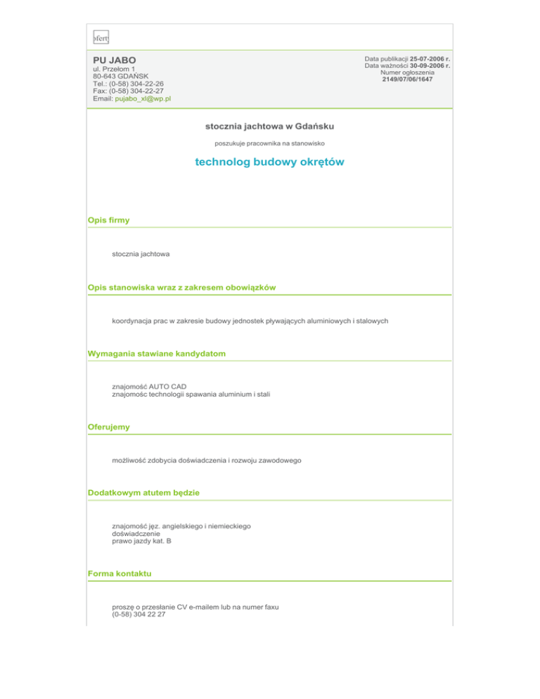 praca, oferty pracy Data publikacji 25-07-2006 r. Data ważności 30-09-2006 r. Numer ogłoszenia 2149/07/06/1647 PU JABO ul. Przełom 1 80-643 GDAŃSK Tel.: (0-58) 304-22-26 Fax: (0-58) 304-22-27 Email: [email protected] stocznia jachtowa w Gdańsku poszukuje pracownika na stanowisko technolog budowy okrętów Opis firmy stocznia jachtowa Opis stanowiska wraz z zakresem obowiązków koordynacja prac w zakresie budowy jednostek pływających aluminiowych i stalowych Wymagania stawiane kandydatom znajomość AUTO CAD znajomośc technologii spawania aluminium i stali Oferujemy możliwość zdobycia doświadczenia i rozwoju zawodowego Dodatkowym atutem będzie znajomość jęz. angielskiego i niemieckiego doświadczenie prawo jazdy kat. B Forma kontaktu proszę o przesłanie CV e-mailem lub na numer faxu (0-58) 304 22 27 Informacje dodatkowe Minimalne wykształcenie: średnie Branża: Przemysł Forma zatrudnienia: umowa o pracę Wymiar pracy: pełny etat Wynagrodzenie (netto): nie podano Lokalizacja: Polska Województwo: pomorskie, Miejsce pracy miasto(a) lub kraj(e): Gdańsk Prawo jazdy: Znajomość języka obcego: Ogłoszenie pochodzi z portalu www.i-praca.pl - Internetowy Portal Pracy ilość wyświetleń: 2270