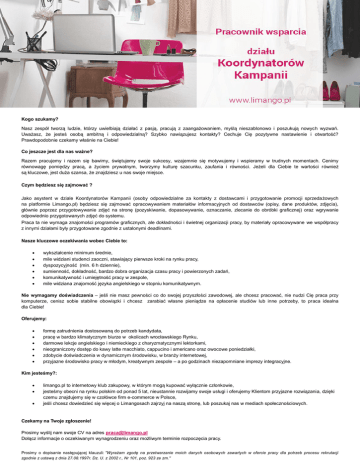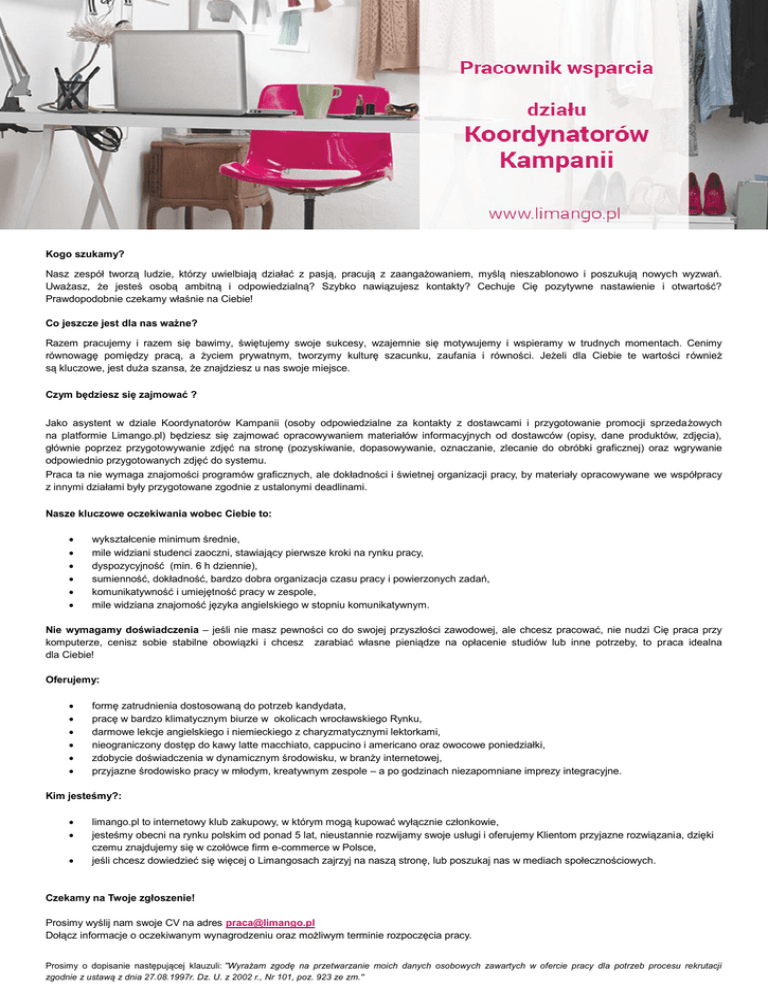 Kogo szukamy? Nasz zespół tworzą ludzie, którzy uwielbiają działać z pasją, pracują z zaangażowaniem, myślą nieszablonowo i poszukują nowych wyzwań. Uważasz, że jesteś osobą ambitną i odpowiedzialną? Szybko nawiązujesz kontakty? Cechuje Cię pozytywne nastawienie i otwartość? Prawdopodobnie czekamy właśnie na Ciebie! Co jeszcze jest dla nas ważne? Razem pracujemy i razem się bawimy, świętujemy swoje sukcesy, wzajemnie się motywujemy i wspieramy w trudnych momentach. Cenimy równowagę pomiędzy pracą, a życiem prywatnym, tworzymy kulturę szacunku, zaufania i równości. Jeżeli dla Ciebie te wartości również są kluczowe, jest duża szansa, że znajdziesz u nas swoje miejsce. Czym będziesz się zajmować ? Jako asystent w dziale Koordynatorów Kampanii (osoby odpowiedzialne za kontakty z dostawcami i przygotowanie promocji sprzedażowych na platformie Limango.pl) będziesz się zajmować opracowywaniem materiałów informacyjnych od dostawców (opisy, dane produktów, zdjęcia), głównie poprzez przygotowywanie zdjęć na stronę (pozyskiwanie, dopasowywanie, oznaczanie, zlecanie do obróbki graficznej) oraz wgrywanie odpowiednio przygotowanych zdjęć do systemu. Praca ta nie wymaga znajomości programów graficznych, ale dokładności i świetnej organizacji pracy, by materiały opracowywane we współpracy z innymi działami były przygotowane zgodnie z ustalonymi deadlinami. Nasze kluczowe oczekiwania wobec Ciebie to: wykształcenie minimum średnie, mile widziani studenci zaoczni, stawiający pierwsze kroki na rynku pracy, dyspozycyjność (min. 6 h dziennie), sumienność, dokładność, bardzo dobra organizacja czasu pracy i powierzonych zadań, komunikatywność i umiejętność pracy w zespole, mile widziana znajomość języka angielskiego w stopniu komunikatywnym. Nie wymagamy doświadczenia – jeśli nie masz pewności co do swojej przyszłości zawodowej, ale chcesz pracować, nie nudzi Cię praca przy komputerze, cenisz sobie stabilne obowiązki i chcesz zarabiać własne pieniądze na opłacenie studiów lub inne potrzeby, to praca idealna dla Ciebie! Oferujemy: formę zatrudnienia dostosowaną do potrzeb kandydata, pracę w bardzo klimatycznym biurze w okolicach wrocławskiego Rynku, darmowe lekcje angielskiego i niemieckiego z charyzmatycznymi lektorkami, nieograniczony dostęp do kawy latte macchiato, cappucino i americano oraz owocowe poniedziałki, zdobycie doświadczenia w dynamicznym środowisku, w branży internetowej, przyjazne środowisko pracy w młodym, kreatywnym zespole – a po godzinach niezapomniane imprezy integracyjne. Kim jesteśmy?: limango.pl to internetowy klub zakupowy, w którym mogą kupować wyłącznie członkowie, jesteśmy obecni na rynku polskim od ponad 5 lat, nieustannie rozwijamy swoje usługi i oferujemy Klientom przyjazne rozwiązania, dzięki czemu znajdujemy się w czołówce firm e-commerce w Polsce, jeśli chcesz dowiedzieć się więcej o Limangosach zajrzyj na naszą stronę, lub poszukaj nas w mediach społecznościowych. Czekamy na Twoje zgłoszenie! Prosimy wyślij nam swoje CV na adres [email protected] Dołącz informacje o oczekiwanym wynagrodzeniu oraz możliwym terminie rozpoczęcia pracy. Prosimy o dopisanie następującej klauzuli: "Wyrażam zgodę na przetwarzanie moich danych osobowych zawartych w ofercie pracy dla potrzeb procesu rekrutacji zgodnie z ustawą z dnia 27.08.1997r. Dz. U. z 2002 r., Nr 101, poz. 923 ze zm."