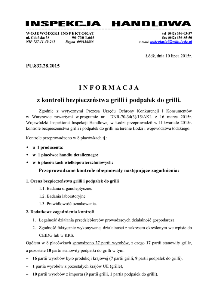 ---------------------------------------------------------------------------------------------------------------WOJEWÓDZKI INSPEKTORAT ul. Gdańska 38 90-730 Łódź NIP 727-11-49-261 Regon 000136886 tel (042) 636-03-57 fax (042) 636-85-50 e-mail: [email protected] Łódź, dnia 10 lipca 2015r. PU.832.28.2015 INFORMACJA z kontroli bezpieczeństwa grilli i podpałek do grilli. Zgodnie z wytycznymi Prezesa Urzędu Ochrony Konkurencji i Konsumentów w Warszawie zawartymi w programie nr DNR-70-34(3)/15/AKL z 16 marca 2015r. Wojewódzki Inspektorat Inspekcji Handlowej w Łodzi przeprowadził w II kwartale 2015r. kontrole bezpieczeństwa grilli i podpałek do grilli na terenie Łodzi i województwa łódzkiego. Kontrole przeprowadzono w 8 placówkach tj.: u 1 producenta: w 1 placówce handlu detalicznego: w 6 placówkach wielkopowierzchniowych: Przeprowadzone kontrole obejmowały następujące zagadnienia: 1. Ocena bezpieczeństwa grilli i podpałek do grilli 1.1. Badania organoleptyczne. 1.2. Badania laboratoryjne. 1.3. Prawidłowość oznakowania. 2. Dodatkowe zagadnienia kontroli 1. Legalność działania przedsiębiorców prowadzących działalność gospodarczą. 2. Zgodność faktycznie wykonywanej działalności z zakresem określonym we wpisie do CEIDG lub w KRS. Ogółem w 8 placówkach sprawdzono 27 partii wyrobów, z czego 17 partii stanowiły grille, a pozostałe 10 partii stanowiły podpałki do grilli w tym: 16 partii wyrobów było produkcji krajowej (7 partii grilli, 9 partii podpałek do grilli), 1 partia wyrobów z pozostałych krajów UE (grille), 10 partii wyrobów z importu (9 partii grilli, 1 partia podpałek do grilli). Ogółem zakwestionowano 2 partie wyrobów; 1 partię grilli w wyniku oceny organoleptycznej, 1 partię podpałek w wyniku badań laboratoryjnych. I. Ustalenia kontroli 1. Ocena bezpieczeństwa grilli i podpałek do grilli 1.1. Badania organoleptyczne 1.1.1. Badania organoleptyczne grilli. Badaniami objętych zostało 17 partii grilli, w tym: - 7 partii produkcji krajowej, - 1 partię z pozostałych krajów UE, - 9 partii z importu. Oceny bezpieczeństwa wyrobów dokonano w oparciu o art. 6 ustawy z dnia 12 grudnia 2003r. o ogólnym bezpieczeństwie produktów (Dz. U. Nr 229, poz.2275, z późn. zm.) tj. z uwzględnieniem wymagań normy: PN-EN 1860-1-2004 Urządzenia, paliwa stałe i podpałki do grilla – Część 1; Grille opalane paliwami stałymi –Wymagania i metody badań, oraz wzięto pod uwagę zasady dobrej praktyki, aktualny stan wiedzy i oczekiwania konsumentów. Przeprowadzone badania organoleptyczne grilli wykazały, iż 16 partii nie posiadało zarówno w zakresie wymagań ogólnych (montażu, demontażu i jakości wykonania elementów grilla) jak i wymagań dla poszczególnych części (rusztu na żywność, rożna, paleniska, stojaka, uchwytów lub rączek) cech mogących stwarzać zagrożenie dla użytkowników. Natomiast 1 partia grilli została zakwestionowana z powodu zbyt małej głębokości paleniska, Głębokość paleniska mierzona w trzech miejscach wynosiła: 29,94mm, 30,58mm, 30,61mm natomiast zgodnie z pkt 4.2.3.3. normy PN-EN 1860-1:2004/A1:2006 Urządzenia, paliwa stałe i podpałki do grilla. Część 1: Grille opalane paliwami stałymi. Wymagania i metody badań minimalna głębokość paleniska powinna wynosić 50 mm. Z uwagi na stwierdzoną nieprawidłowość dokonano szacowania ryzyka dla przedmiotowego grilla, w wyniku którego ustalono średnie ryzyko zagrożenia bezpieczeństwa użytkowników. W sprawie kwestionowanego grilla skierowano do Prezesa UOKiK wniosek wszczęcie postępowania administracyjnego w sprawie wyrobu, który może nie być bezpieczny. 1.1.2. Badania organoleptyczne podpałek do grilli. Badaniami objętych zostało 8 partii płynnych rozpałek do grilli i kominków, z czego 7 partii było pochodzenia krajowego a 1 partia była z importu. 2 Oceny bezpieczeństwa wyrobów dokonano w oparciu o wymagania określone w art. 6 ustawy z dnia 12 grudnia 2003r. o ogólnym bezpieczeństwie produktów (Dz U. Nr 229, poz.2275, z późn. zm.) z uwzględnieniem wymagań normy: PN-EN 1860-3:2005/A1:2006 Urządzenia, paliwa stałe i podpałki do grilla – Część 3: Podpałki do rozpalania paliw stałych stosowane w urządzeniach do grillowania.- Wymagania i metody badań. Przeprowadzono ocenę organoleptyczną podpałek do grilli w zakresie zaopatrzenia opakowań w zamknięcia uniemożliwiające otwarcie przez dzieci oraz szczelności przy zamkniętym opakowaniu i bez naruszania zamknięcia. Nieprawidłowości nie stwierdzono. 1.2. Badania laboratoryjne podpałek do grilli. Badaniom laboratoryjnym poddano próby z 2 partii podpałek do grilli i kominków. Przeprowadzone badania laboratoryjne wykazały, że badane podpałki odpowiadały wymaganiom jakościowym określonym w normie PN-EN 1860-3:2005/A1:2006 Urządzenia, paliwa stałe i podpałki do grilla – Część 3: Podpałki do rozpalania paliw stałych stosowane w urządzeniach do grillowania.- Wymagania i metody badań w zakresie: ilości wycieku, wytrzymałości opakowania i temperatury zapłonu w 0C oraz deklaracji producenta na opakowaniu jednostkowym dotyczącym napełnienia. Natomiast w zakresie trwałości zamocowania dozownika laboratorium kwestionowało próbkę z 1 partii podpałek do grilla i kominków. W związku ze stwierdzoną nieprawidłowością dokonano szacowania ryzyka przedmiotowej podpałki do grilla i kominków, w wyniku którego ustalono niski poziom ryzyka. Szacując ryzyko zagrożenia bezpieczeństwa konsumentów uwzględniono rzeczywiste warunki użytkowania podpałki do grilla oraz zalecenia i ostrzeżenia zamieszczone przez producenta na etykiecie wyrobu. Wyrobu nie kwestionowano, natomiast do producenta skierowano pismo pokontrolne z wnioskiem o podjęcie działań mających na celu wyeliminowanie ewentualnego zagrożenia. 1.3. Prawidłowość oznakowania w zakresie ogólnego bezpieczeństwa Ogółem w 8 jednostkach ocenie ozn