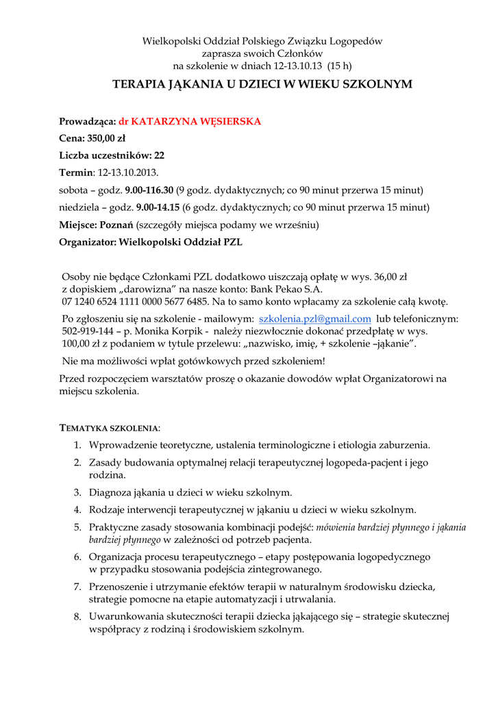 Wielkopolski Oddział Polskiego Związku Logopedów zaprasza swoich Członków na szkolenie w dniach 12-13.10.13 (15 h) TERAPIA JĄKANIA U DZIECI W WIEKU SZKOLNYM Prowadząca: dr KATARZYNA WĘSIERSKA Cena: 350,00 zł Liczba uczestników: 22 Termin: 12-13.10.2013. sobota – godz. 9.00-116.30 (9 godz. dydaktycznych; co 90 minut przerwa 15 minut) niedziela – godz. 9.00-14.15 (6 godz. dydaktycznych; co 90 minut przerwa 15 minut) Miejsce: Poznań (szczegóły miejsca podamy we wrześniu) Organizator: Wielkopolski Oddział PZL Osoby nie będące Członkami PZL dodatkowo uiszczają opłatę w wys. 36,00 zł z dopiskiem „darowizna” na nasze konto: Bank Pekao S.A. 07 1240 6524 1111 0000 5677 6485. Na to samo konto wpłacamy za szkolenie całą kwotę. Po zgłoszeniu się na szkolenie - mailowym: [email protected] lub telefonicznym: 502-919-144 – p. Monika Korpik - należy niezwłocznie dokonać przedpłatę w wys. 100,00 zł z podaniem w tytule przelewu: „nazwisko, imię, + szkolenie –jąkanie”. Nie ma możliwości wpłat gotówkowych przed szkoleniem! Przed rozpoczęciem warsztatów proszę o okazanie dowodów wpłat Organizatorowi na miejscu szkolenia. TEMATYKA SZKOLENIA: 1. Wprowadzenie teoretyczne, ustalenia terminologiczne i etiologia zaburzenia. 2. Zasady budowania optymalnej relacji terapeutycznej logopeda-pacjent i jego rodzina. 3. Diagnoza jąkania u dzieci w wieku szkolnym. 4. Rodzaje interwencji terapeutycznej w jąkaniu u dzieci w wieku szkolnym. 5. Praktyczne zasady stosowania kombinacji podejść: mówienia bardziej płynnego i jąkania bardziej płynnego w zależności od potrzeb pacjenta. 6. Organizacja procesu terapeutycznego – etapy postępowania logopedycznego w przypadku stosowania podejścia zintegrowanego. 7. Przenoszenie i utrzymanie efektów terapii w naturalnym środowisku dziecka, strategie pomocne na etapie automatyzacji i utrwalania. 8. Uwarunkowania skuteczności terapii dziecka jąkającego się – strategie skutecznej współpracy z rodziną i środowiskiem szkolnym. Dr n. hum. Katarzyna Węsierska, logopeda, oligofrenopedagog, trener emisji głosu, adiunkt w Instytucie Języka Polskiego Uniwersytetu Śląskiego, założycielka Centrum Logopedycznego w Katowicach. Zajmuje się profilaktyką i skutecznością terapii logopedycznej, zwłaszcza w przypadkach opóźnionego rozwoju mowy oraz zaburzeń płynności mowy. Jest współautorką i autorką książek z zakresu terapii logopedycznej oraz licznych publikacji z tej dziedziny – naukowych i popularnonaukowych, między innymi przewodnika dla rodziców: Czy moje dziecko się jąka? Przez wiele lat brała udział w Intensywnych programach terapeutycznych dla dzieci, młodzieży oraz dorosłych jąkających się, organizowanych przez twórcę autorskiej metody terapii jąkania – dra M. Chęćka. Uczestniczyła w licznych szkoleniach z zakresu jąkania, także w ośrodkach zagranicznych, m.in. w: The Michael Palin Centre for Stammering Children w Londynie (Palin Parent-Child Interaction Therapy. Practical Intervention for Early Childhood Stammering; Primary School Children Who Stammer – Realising their Potential; An Overview of Working with Children Who Stammer), w The Royal College of Speech and Language Therapists w Londynie (The Lidcombe Program of Early Stuttering Intervention; It Takes Two to Talk – The Hanen Program for Parents), a także w szkoleniu zorganizowanym przez The Stuttering Foundation i Portland State University w Stanach Zjednoczonych (Diagnosis and Treatment of Children Who Stutter).