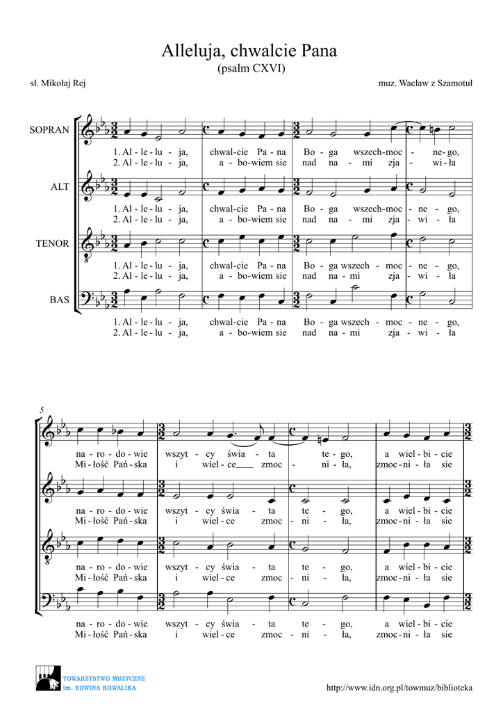 Alleluja, chwalcie Pana (psalm CXVI) sł. Mikołaj Rej SOPRAN muz. Wacław z Szamotuł ° b3 & b b 2 œ œ ˙ ˙ c œ œ œ œ 23 ˙ ˙ 1. Al - le - lu - ja, 2. Al - le - lu - ja, ALT chwal - cie Pa - na a - bo - wiem sie Bo - ga nad na b3 3 c œ & b b2 œ œ œ œ 2 œ ˙ ˙ ˙ ˙ 1. Al - le - lu - ja, 2. Al - le - lu - ja, chwal - cie Pa - na a - bo - wiem sie Bo - ga nad na œ œ c œ nœ ˙ œ œ c˙ wszech- moc - mi zja - - 1. Al - le - lu - ja, 2. Al - le - lu - ja, ° b œ œ bœ œ 23 ˙ &b b 5 na - ro - do - wie Mi - łość Pań - ska b œ œ œ &b b œ ‹ na - ro - do - wie Mi - łość Pań - ska œ œ œ ?b œ b b ¢ na - ro - do - wie Mi - łość Pań - ska œ ˙ wszyt - cy świa i wiel - ce 23 ˙ œ ˙ 32 ˙ œ ˙ - ta zmoc - wszyt - cy świa i wiel - ce - wszyt - cy świa i wiel - ce - œ œ c˙ ˙ - moc - ne - go, zja - wi - ła œ c˙ ˙ Bo - ga wszech - moc - ne - go, nad na - mi zja - wi - ła œ œ ™ œj œ c œ nœ ˙ wszyt - cy świa i wiel - ce b 3 &b b œ œ œ œ 2 ˙ na - ro - do - wie Mi - łość Pań - ska chwal - cie Pa - na a - bo - wiem sie ˙ wszech- moc - ne - go, mi zja - wi - ła b3 œ œ œ 3˙ œ ˙ & b b2 œ œ ˙ ˙ c œ 2 ‹ 1. Al - le - lu - ja, chwal-cie Pa - na Bo - ga wszech 2. Al - le - lu - ja, a - bo - wiem sie nad na - mi ˙ œ œ ˙ ˙ ? 3 œ œ 3 ˙ b œ c œ 2 œ BAS ¢ b b2 TENOR ne- go, wi - ła te - go, ni - ła, - c ˙ ta te zmoc - ni œ c˙ - ˙ go, ła, ˙ œ œ œ œ 23 a wiel - bi - cie zmoc - ni - ła sie 3 2 œ œ œ œ a wiel - bi - cie zmoc - ni - ła sie 3 œ œ œ œ 2 ta te zmoc - ni - go, ła, a wiel - bi - cie zmoc - ni - ła sie ta te zmoc - ni - go, ła, a wiel - bi - cie zmoc - ni - ła sie œ c˙ ˙ œ œ œ 3 œ 2 http://www.idn.org.pl/towmuz/biblioteka ° b3 & b b2 ˙ 2 9 i praw b3 & b b2 ˙ i praw b3˙ b & b2 ‹ i - - œ ˙ - - mię świę - te da świę - ta Je - go, lu - dzie wszyt - cy Je - go, a bę - dzie trwać j c œ™ œ œ œœ ˙ œ œ œ œ œ mię świę - te da świę - ta œ ˙ œc˙ ? b 3 œ œœ œ œ ˙ ¢ b b2 œc˙ praw - - mię świę - te da świę - ta i mię świę - te praw - da świę - ta ° b & b bc œ nœ ˙ 13 b & b bc - - kie - go. ne - go. ˙ Al ˙ 23 ˙ ˙ 23 ˙ ˙ 23 ˙ go. go. b & b bc ˙ ‹ kie ne - go. go. kie ne - go. go. ?bc˙ ¢ bb 23 ˙ Al Al Al ˙ Je - go, lu - dzie wszyt - cy Je - go, a bę - dzie trwać ˙ œ œ œ œ Je - go, lu - dzie wszyt - cy Je - go, a bę - dzie trwać œ b˙ - ˙ - - - œ ˙ - - œ ˙ - œ - œ œ œ œ - c 23 œ œ œ œ œ œ c 23 ˙ c sta - nu wsze - la do cza - su wiecz - Je - go, lu - dzie wszyt - cy Je - go, a bę - dzie trwać œ œ œ œ œ œ ™ œj œ 23 ˙ ˙ œ œ œ œ œc˙ sta - nu wsze - la - kie do cza - su wiecz- ne - sta - nu wsze do cza - su 23 ˙ le - lu cœ œ ˙ le - lu œ œ cœ œ ˙ - - - - - la wiecz - œ œ œ œ le - lu nœ - - - œ œ cœ œ ˙ - œ c sta - nu wsze - la do cza - su - wiecz - cœ ˙ - œ ˙ le - lu w ja. w ja. w ja. w - ja. http://www.idn.org.pl/towmuz/biblioteka