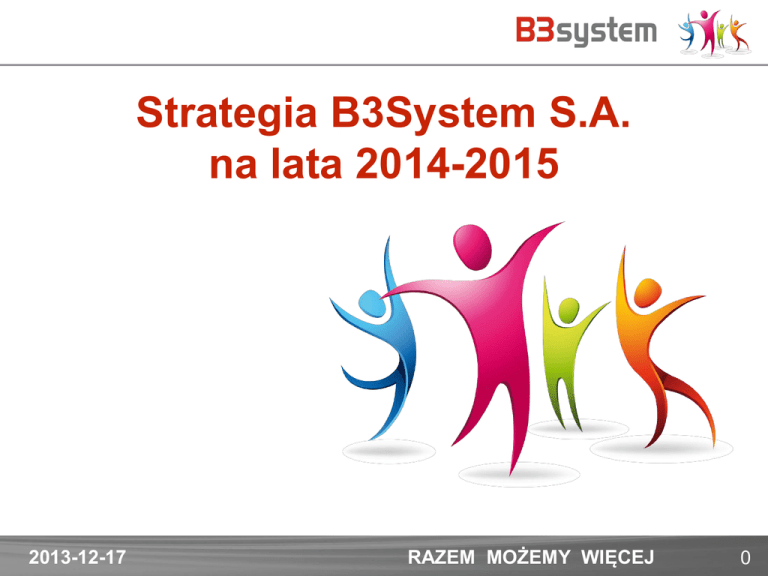 Strategia B3System S.A. na lata 2014-2015 2013-12-17 RAZEM MOŻEMY WIĘCEJ 0 OPIS DZIAŁALNOŚCI B3SYSTEM S.A. Główne obszary kompetencyjne: • Usługi z zakresu utrzymania infrastruktury: wirtualizacja serwerów i pamięci masowych, obsługa serwerów, macierzy i sieci; • Usługi z zakresu bezpieczeństwa i ochrony danych (wysoka dostępność): archiwizacja, backup; • System monitorowania i utrzymania wydruku. • System uwierzytelniania użytkowników: podpis telemetryczny. Struktura przychodów za III kwartały 2013 • 67% sprzedaż sprzętu i oprogramowania • 33% usługi własne i zewnętrzne w zakresie konsultacji, wdrożenia i utrzymania dostarczanych rozwiązań IT. RAZEM MOŻEMY WIĘCEJ 1 ZNACZĄCY KLIENCI • • • • • • • • • • • • • Agora S.A Bank BPH S.A. Bank BPS S.A. Euro Bank S.A. Generali Finance sp. z o.o. Netia S.A. Najwyższa Izba Kontroli PKO BP S.A. Pekao S.A. Polkomtel sp. z o.o. T-Mobile Polska S.A. Toyota Bank Polska S.A. UPC Polska sp. z o.o. RAZEM MOŻEMY WIĘCEJ 2 MISJA • Zbudowanie pozycji znaczącego dostawcy usług informatycznych na rynku krajowym w zakresie utrzymania infrastruktury informatycznej, ze szczególnym uwzględnieniem obszaru przetwarzania i ochrony danych, poprzez budowę unikalnych kompetencji technicznych oraz pozyskiwanie długookresowych kontraktów usługowych. • Wzrost przychodów i rentowności działalności gospodarczej prowadzonej przez Spółkę – budowanie wartości dla inwestorów. RAZEM MOŻEMY WIĘCEJ 3 CELE STRATEGICZNE • Rozszerzenie oferty merytorycznej o rozwiązania z zakresu przetwarzania i integracji danych w środowiskach wirtualnych, zarządzania środowiskami dla pracy mobilnej (Bring Your Own Device) oraz bezpieczeństwa i monitorowania środowisk wirtualnych (ze szczególnym uwzględnieniem End-User Computing); • Zmiana strategii sprzedaży, premiująca usługi własne i kontrakty długoterminowe, charakteryzujące się wyższym stopniem marżowości; • Budowanie pozycji lidera w zakresie doradztwa w procesie transformacji biznesu w środowiskach wirtualnych; • Dywersyfikacja odbiorców w aspekcie branżowym oraz potencjału zakupowego (intensyfikacja sprzedaży do sektora energetycznego, publicznego oraz do średnich firm). RAZEM MOŻEMY WIĘCEJ 4 CELE NA LATA 2014-15 • Osiągnięcie 100 mln PLN przychodów ogółem, wzrost udziału usług własnych i zleconych do 50% oraz zwiększenie liczby aktywnych kontraktów utrzymaniowych o 100%; • Dywersyfikacja kontrahentów - pozyskanie nowych klientów spoza sektorów bankowego i telekomunikacyjnego, wzrost udziału w obrotach do poziomu około 50% z dotychczasowych 30%; • Rozpoczęcie sprzedaży rozwiązań z zakresu nowych kompetencji i osiągnięcie 20 mln PLN przychodów z tego obszaru; • Pozyskanie kolejnego kontraktu na monitorowanie i utrzymanie systemu wydruków o podobnej skali do obecnie realizowanego; • Przeprowadzenie dalszej restrukturyzacji kosztów działalności Spółki oraz utrzymywanie skrupulatnej kwalifikacji wydatków. RAZEM MOŻEMY WIĘCEJ 5 ZAŁOŻENIA REALIZACJI STRATEGII W dniu 02 grudnia 2013r. zwołane z inicjatywy Zarządu Nadzwyczajne Walne Zgromadzenie Spółki B3System podjęło uchwały w sprawie : 1. Upoważnienia Zarządu Spółki do podwyższenia kapitału zakładowego Spółki w granicach kapitału docelowego o kwotę nominalną nie większą niż 1.061.694,00 zł, z wyłączeniem prawa poboru w całości lub w części za zgodą Rady Nadzorczej. 2. Warunkowego podwyższenia kapitału zakładowego Spółki o kwotę nominalną nie wyższą niż 2.831.187 zł, z wyłączeniem w całości prawa poboru. Określenie ceny emisyjnej akcji: • w ramach docelowego kapitału zakładowego pozostawione do kompetencji Zarządu, za zgodą Rady Nadzorczej; • w ramach warunkowego kapitału zakładowego zgodnie z wytycznymi zawartymi w uchwale NWZ, nie niższa jednakże niż 0,24 zł oraz nie wyższa niż 1,00 zł. RAZEM MOŻEMY WIĘCEJ 6 Zarząd rozważa następujące scenariusze dokapitalizowania Spółki: • dotychczasowy akcjonariusz; • inwestor zewnętrzny branżowy i/lub finansowy; • łącznie dotychczasowy akcjonariusz i inwestor zewnętrzny. Środki finansowe uzyskane z podwyższenia kapitału zakładowego oraz emisji akcji, zgodnie z uchwałą NWZ, zostaną przeznaczone na: • sfinansowanie i rozwój bieżącej działalności B3System S.A.; • inwestycje w nowe kompetencje uzupełniającą ofertę produktową Spółki; • spłatę zadłużenia względem wierzycieli. RAZEM MOŻEMY WIĘCEJ 7 B3System S.A. DANE KONTAKTOWE Karol Smęt Specjalista ds. korporacyjnych Tel. +48 663 842 288 Łopuszańska 32, 02-220 Warszawa tel. +48 (22) 480 89 00 fax. +48 (22) 480 89 01 www.b3system.pl RAZEM MOŻEMY WIĘCEJ