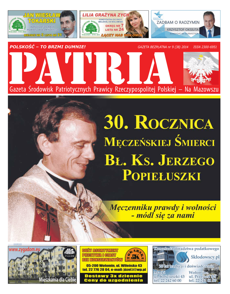 „PATRIA” POLSKOŚĆ – TO BRZMI DUMNIE! 1 Numer 9 (38) 2014 GAZETA BEZPŁATNA nr 9 (38) 2014 PATRIA ISSN 2300-6951 Gazeta Środowisk Patriotycznych Prawicy Rzeczypospolitej Polskiej – Na Mazowszu REKLAMA [email protected] www.gazetapatria.pl 2 Numer 9 (38) 2014 „PATRIA” 30 Rocznica śmierci bł. ks. Jerzego Popiełuszki Choć, od tej tragicznej zbrodni komunistycznych służb bezpieki PRL-u minęło 30 lat, dalej brutalna śmierć kapelana NSZZ Solidarność - Księdza Jerzego Popiełuszki kryje wiele tajemnic. Komu na tym zależy? Czy ta zbrodnia nie wpisuje się przypadkiem w powstanie III RP, przez wielu nazywana PRL-bis? W świetle nowych dowodów historia tego mordu powinna być napisana od nowa. Kazimierz Andrzej Zych Urodzony na Białostocczyźnie Ks. Jerzy nie miał łatwego życia. Rodzice Jerzego Popiełuszki – Władysław i Marianna z Gniedziejków, prowadzili gospodarstwo rolne. Mieli łącznie pięcioro dzieci: Teresę, Józefa, Alka i Stanisława. Była jeszcze Jadwisia, ale żyła niecałe dwa lata. Rodzina była wielopokoleniowa, mieszkali z nimi dziadkowie. W domu kultywowano pamięć o wuju Alfonsie Gniedziejce, członku partyzantki akowskiej, który w wieku dwudziestu jeden lat zginął po wojnie z rąk sowieckich. Po maturze, Jerzy Popiełuszko – 24 czerwca 1965 r. wstąpił do Wyższego Metropolitalnego Seminarium Duchownego w Warszawie. Po pierwszym roku studiów został skierowany do obowiązkowej zasadniczej służby wojskowej, którą odbywał w latach 1966-1968 w specjalnej jednostce dla kleryków o zaostrzonym rygorze w Bartoszycach. Pobór kleryków był elementem represji wobec Kościoła w Polsce. Popiełuszko nie dał się złamać, inicjował opór, podtrzymywał na duchu kolegów, choć spotykały go za to bezwzględne kary: wyśmiewanie, wielogodzinne ćwiczenia, czołganie się na mrozie, czyszczenie toalety w masce przeciwgazowej. Wojsko wyniszczyło go fizycznie. Na początku 1970 roku, już po powrocie do seminarium, ciężko zachorował i niemal cudem udało się go uratować. Kłopoty zdrowotne towarzyszyły mu już do końca życia. 28 maja 1972 r. otrzymał święcenia kapłańskie z rąk prymasa kardynała Stefana Wyszyńskiego, a 11 czerwca 1972 r. odprawił prymicyjną mszę świętą w kościele w Działoszynie. Następnie pracował w parafiach w Ząbkach (1972-1975) i Aninie (1975-1978). Później był księdzem w warszawskich kościołach: Dzieciątka Jezus, św. Anny, a od czerwca 1980 św. Stanisława Kostki. To tu w stanie wojennym zaczął odprawiać słynne Msze za Ojczyznę, na które przychodziło tysiące wiernych. Zaplanowana z precyzją zbrodnia. Służbom bezpieczeństwa działalność Księdza zaczęła wyraźnie przeszkadzać do tego stopnia, że swoimi kanałami sugerowano Kościołowi przeniesienie Ks. Jerzego do Rzymu na studia. Ksiądz Jerzy cierpiał nawet z tego, że jego przełożeni Go nie rozumieją. Przyjaciel księdza Jerzego, ks. Jan Sikorski, w wywiadzie udzielonym Biuletynowi IPN wspomina: „Jerzy płakał u mnie po spotkaniu z księdzem prymasem. Byłem przypadkowym świadkiem tego spotkania. Wychodziłem z nim z seminarium, kiedy z przeciwka szedł ksiądz prymas, i natknęliśmy się na siebie. I powiedział: „a to chodź, to porozmawiamy”, i wziął go ksiądz prymas do rozmównicy. Jerzy potem przyszedł do mnie do mieszkania, był bardzo przejęty tym, że nie został zrozumiany. Prymas zarzucił mu zaniedbywanie pracy duszpasterskiej i niesubordynację oraz trudny charakter. „Zarzuty zwaliły mnie z nóg. SB na przesłuchaniu szanowało mnie bardziej – powiedział Jerzy”. Gdy próby wysłania na studia nie pomagały – Ksiądz Jerzy wyraźnie odmówił – SB użyła innych wyrafinowanych sposobów włącznie z różnymi prowo- fot. Archiwum IPN kacjami, a gdy i to nie poskutkowało – zapadła decyzja eksterminacji czyli zamordowania Księdza Jerzego. Wcześniej jednak – 12 września 1984 r. rozpoczęła się nowa faza ataków na księdza Popiełuszkę. Sygnał dała radziecka „Izwiestija”. Leonid Toporkow napisał wtedy między innymi: „(...) przekształcił swoje mieszkanie w składnicę literatury nielegalnej i ściśle współpracuje z zaciekłymi kontrrewolucjonistami. Ma się wrażenie, że nie czyta z ambony kazań, lecz ulotki napisane przez Bujaka. Zieje z nich nienawiść do socjalizmu.” 13 września odbyło się spotkanie Wojciecha Jaruzelskiego z Czesławem Kiszczakiem i innymi wysokimi urzędnikami, podczas którego Jaruzelski miał powiedzieć do Kiszczaka: „Załatw to, niech on nie szczeka”. Wkrótce potem Jerzy Urban, piszący pod pseudonimem Jan Rem, nazwał kazania Popiełuszki „seansami nienawiści”. 17 września Urząd do Spraw Wyznań wystosował ostre pismo do Episkopatu, w którym naciskał na zaprzestanie tolerowania przez bisku- pów wystąpień niektórych duchownych. Wymieniono w nim nazwisko księdza Popiełuszki. Wzmogły się anonimy kierowane do księdza (np. „Zostaniesz bohaterem narodowym numer dwa – po Przemyku”. Trzydziestego października 1984 roku z zalewu na Wiśle koło Włocławka wyłowiono Jego mocno ztorturowane zwłoki. Ręce skrępowano tak, by próby poruszania nimi zaciskały pętlę na szyi. Ciało obciążone było workiem wypełnionym kamieniami. Tak miały wyglądać fakty dotyczące jednej z najgłośniejszych zbrodni PRL-u – miały? Dziś wiemy, że było inaczej, świadczą o tym choćby dokumenty IPN czy dowody kilkukrotnie przerwanego, odbieranego śledztwa prokuratorowi Andrzejowi Witkowskiemu. Testament Papieża Jana Pawła II, w którym nakazywał polskiemu Kościołowi wyjaśnienie tej zbrodni do dziś dnia – nie został wypełniony. Jak można wytłumaczyć zachowanie ówczesnego Prymasa Polski śp. Józefa Glempa w świetle dokumentów IPN, oraz niechęć do przystąpienia do procesu beatyfikacyjnego? Tymcza- sem z dokumentu wywiadu cywilnego MSW wynika, że już w 1986 roku prymas ostro op