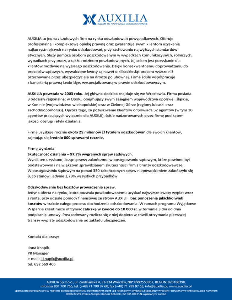 AUXILIA to jedna z czołowych firm na rynku odszkodowań powypadkowych. Oferuje profesjonalną i kompleksową opiekę prawną oraz gwarantuje swym klientom uzyskanie najkorzystniejszych na rynku odszkodowań, przy zachowaniu najwyższych standardów etycznych. Służy pomocą osobom poszkodowanym w wypadkach komunikacyjnych, rolniczych, wypadkach przy pracy, a także rodzinom poszkodowanych. Jej celem jest pozyskanie dla klientów możliwie najwyższego odszkodowania. Dzięki konsekwentnemu doprowadzaniu do procesów sądowych, wywalczone kwoty są nawet o kilkadziesiąt procent wyższe niż przyznawane przez ubezpieczyciela na drodze polubownej. Firma ściśle współpracuje z kancelarią prawną Lexbridge, wyspecjalizowaną w prawie odszkodowawczym. AUXILIA powstała w 2003 roku. Jej główna siedziba znajduje się we Wrocławiu. Firma posiada 3 oddziały regionalne: w Opolu, obejmujący swym zasięgiem województwa opolskie i śląskie, w Koninie (województwo wielkopolskie) oraz w Zielonej Górze (regiony lubuski oraz zachodniopomorski). Oprócz tego, za pozyskiwanie klientów odpowiada 52 agentów (w tym 10 agentów pracujących wyłącznie dla AUXILII), ściśle nadzorowanych przez firmę pod kątem jakości obsługi i etyki działania. Firma uzyskuje rocznie około 25 milionów zł tytułem odszkodowań dla swoich klientów, zajmując się średnio 800 sprawami rocznie. Firmę wyróżnia: Skuteczność działania – 97,7% wygranych spraw sądowych. Wynik ten uzyskano, licząc sprawy zakończone w postępowaniu sądowym, które powinno być podstawowym i największym sprawdzianem skuteczności firm z branży odszkodowawczej. W postępowaniu sądowym na ponad 350 zakończonych spraw niepowodzeniem zakończyło się 8, co stanowi jedynie 2,28% wszystkich przypadków. Odszkodowanie bez kosztów prowadzenia spraw. Jedyna oferta na rynku, która pozwala poszkodowanemu uzyskać najwyższe kwoty wypłat wraz z rentą, przy udziale pomocy finansowej ze strony AUXILII i bez ponoszenia jakichkolwiek kosztów w trakcie całego procesu dochodzenia odszkodowania. W ramach programu Wyjątkowe Wsparcie klient może otrzymać zaliczkę w kwocie do 10 000 zł, w terminie 3 dni od dnia podpisania umowy. Poszkodowany rozlicza się z niej dopiero w chwili otrzymania pierwszej transzy wypłaty odszkodowania od zakładu ubezpieczeń. Kontakt dla prasy: Ilona Knapik PR Manager e-mail: [email protected] tel. 692 569 405