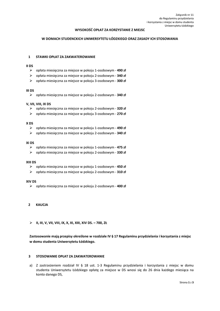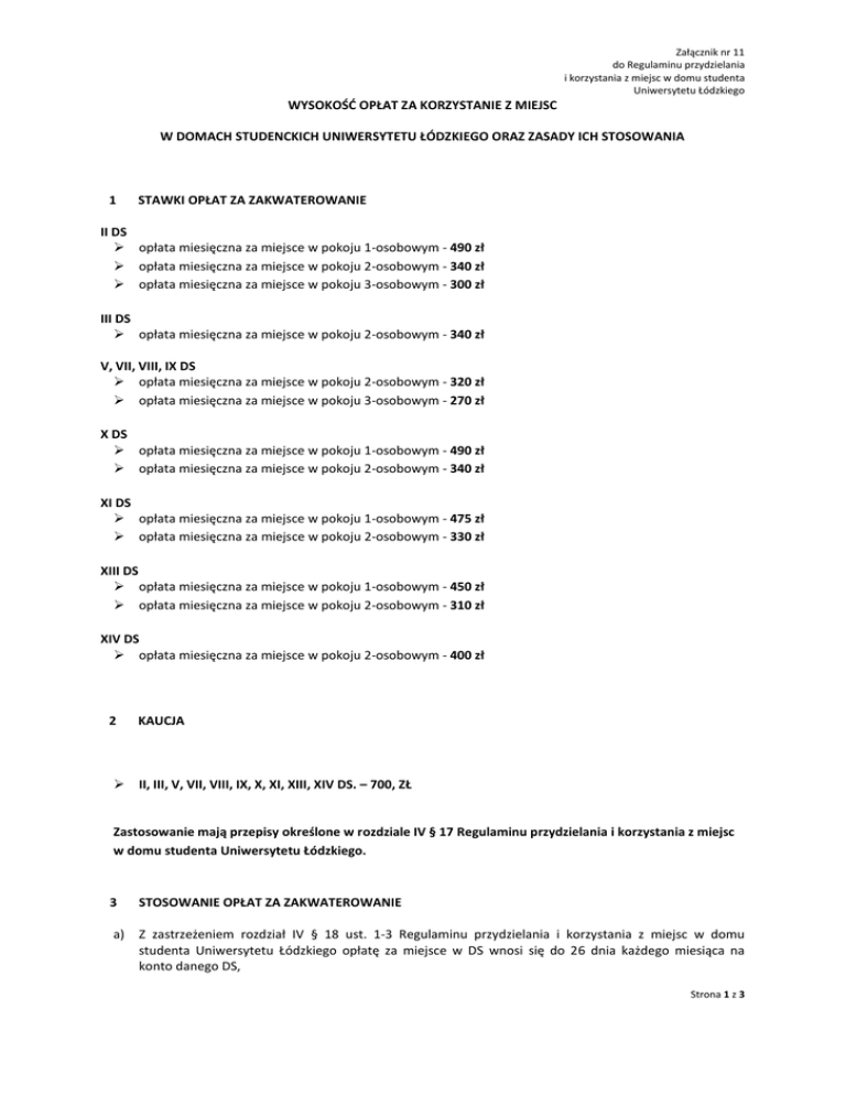Załącznik nr 11 do Regulaminu przydzielania i korzystania z miejsc w domu studenta Uniwersytetu Łódzkiego WYSOKOŚĆ OPŁAT ZA KORZYSTANIE Z MIEJSC W DOMACH STUDENCKICH UNIWERSYTETU ŁÓDZKIEGO ORAZ ZASADY ICH STOSOWANIA 1 STAWKI OPŁAT ZA ZAKWATEROWANIE II DS opłata miesięczna za miejsce w pokoju 1-osobowym - 490 zł opłata miesięczna za miejsce w pokoju 2-osobowym - 340 zł opłata miesięczna za miejsce w pokoju 3-osobowym - 300 zł III DS opłata miesięczna za miejsce w pokoju 2-osobowym - 340 zł V, VII, VIII, IX DS opłata miesięczna za miejsce w pokoju 2-osobowym - 320 zł opłata miesięczna za miejsce w pokoju 3-osobowym - 270 zł X DS opłata miesięczna za miejsce w pokoju 1-osobowym - 490 zł opłata miesięczna za miejsce w pokoju 2-osobowym - 340 zł XI DS opłata miesięczna za miejsce w pokoju 1-osobowym - 475 zł opłata miesięczna za miejsce w pokoju 2-osobowym - 330 zł XIII DS opłata miesięczna za miejsce w pokoju 1-osobowym - 450 zł opłata miesięczna za miejsce w pokoju 2-osobowym - 310 zł XIV DS opłata miesięczna za miejsce w pokoju 2-osobowym - 400 zł 2 KAUCJA II, III, V, VII, VIII, IX, X, XI, XIII, XIV DS. – 700, ZŁ Zastosowanie mają przepisy określone w rozdziale IV § 17 Regulaminu przydzielania i korzystania z miejsc w domu studenta Uniwersytetu Łódzkiego. 3 STOSOWANIE OPŁAT ZA ZAKWATEROWANIE a) Z zastrzeżeniem rozdział IV § 18 ust. 1-3 Regulaminu przydzielania i korzystania z miejsc w domu studenta Uniwersytetu Łódzkiego opłatę za miejsce w DS wnosi się do 26 dnia każdego miesiąca na konto danego DS, Strona 1 z 3 Załącznik nr 11 do Regulaminu przydzielania i korzystania z miejsc w domu studenta Uniwersytetu Łódzkiego b) Od pierwszego dnia po zakończeniu letniej sesji egzaminacyjnej do 31 maja obowiązują następujące zasady odpłatności za miejsce w DS: c) Przy zakwaterowaniu na okres nie krótszy niż od 4 do 10 dni w danym miesiącu obowiązuje ⅓ stawki podstawowej, Przy zakwaterowaniu na okres od 11 do 20 dni w danym miesiącu obowiązują ⅔ stawki podstawowej, Przy zakwaterowaniu na okres od 21 do 31 dni w danym miesiącu obowiązuje stawka podstawowa, Przy zakwaterowaniu na okres krótszy niż 4 dni w danym miesiącu, obowiązuje stawka jak za pokój gościnny w danym DS. Wysokość opłat za najem pokoi gościnnych w domach studenckich UŁ została określona w odrębnym zarządzeniu. Od dnia 1 czerwca do dnia zakończenia letniej sesji egzaminacyjnej obowiązuje przelicznik dobowy. Ostatni dzień letniej sesji egzaminacyjnej został określony w zarządzeniu o podziale roku akademickiego, STAWKI OPŁAT ZA ZAKWATEROWANIE W SYSTEMIE DOBOWYM II DS opłata dobowa za miejsce w pokoju 1-osobowym opłata dobowa za miejsce w pokoju 2-osobowym opłata dobowa za miejsce w pokoju 3-osobowym - 16 zł - 11 zł - 10 zł III DS opłata dobowa za miejsce w pokoju 2-osobowym - 11 zł V, VII, VIII, IX DS opłata dobowa za miejsce w pokoju 2-osobowym opłata dobowa za miejsce w pokoju 3-osobowym - 10,50 zł - 9 zł X DS opłata dobowa za miejsce w pokoju 1-osobowym opłata dobowa za miejsce w pokoju 2-osobowym - 16 zł - 11 zł XI DS opłata dobowa za miejsce w pokoju 1-osobowym opłata dobowa za miejsce w pokoju 2-osobowym - 15,50 zł - 11 zł XIII DS opłata dobowa za miejsce w pokoju 1-osobowym opłata dobowa za miejsce w pokoju 2-osobowym - 14,50 zł - 10 zł XIV DS opłata dobowa za miejsce w pokoju 2-osobowym - 13 zł d) Niewniesienie opłaty w terminie skutkuje naliczeniem kary w wysokości 10,- zł za każdy miesiąc opóźnienia. e) Czasowa nieobecność mieszkańca w DS nie zwalnia go z obowiązku wniesienia opłaty, f) Zasady określone w punkcie a, b, c, d, e dotyczą również niepracującego małżonka studenta UŁ, doktoranta UŁ i ich wspólnych dzieci, g) W odniesieniu do pracującego małżonka studenta/doktoranta UŁ obowiązują zasady określone w pkt. f z zastrzeżeniem, że małżonek za zakwaterowanie w DS UŁ wnosi opłatę zwiększoną o 50 zł + VAT, Strona 2 z 3 Załącznik nr 11 do Regulaminu przydzielania i korzystania z miejsc w domu studenta Uniwersytetu Łódzkiego h) Osoby, mieszkające w pokoju 2, 3-osobowym samotnie, decyzją kierownika DS zobowiązane są do przekwaterowania się do pokoju, w którym miejsca nie są w pełni wykorzystane, i) W sytuacji odmowy wypełnienia postanowienia lit. h osoby, zamieszkujące samodzielnie w pokoju dwuosobowym lub trzyosobowym zobowiązane są do wnoszenia opłaty w wysokości określonej odpowiednio w lit. j-k. j) Student / Słuchacz SJPdC, który chce zamieszkać samodzielnie w pokoju 2-osobowym zobowiązany jest do złożenia podania skierowanego do Prorektora ds. studenckich i toku studiów, z prośbą o wyrażenie zgody na samodzielne zamieszkanie w pokoju. Podanie musi zawierać opinię kierownika DS oraz UKS-S. Student / Słuchacz SJPdC w podaniu wyraża zgodę na ponoszenie innej odpłatności za zamieszkany pokój. Stawka za samodzielne zamieszkanie w pokoju 2-osobowym wynosi 150 % stawki podstawowej. Zgodę na samodzielne użytkowanie pokoju 2-osobowego uzyskuje się jedynie w chwili, gdy o miejsce w danym DS nie ubiega się żaden student lub słuchacz SJPdC. k) Student / Słuchacz SJPdC, który chce zamieszkać samodzielnie w pokoju 3-osobowym zobowiązany jest do złożenia podania skierowanego do Prorektora ds. studenckich i toku studiów, z prośbą o wyrażenie zgody na samodzielne zamieszkanie w pokoju. Podanie musi zawierać opinię kierownika DS oraz UKS-S. Student / Słuchacz SJPdC w podaniu wyraża zgodę na ponoszenie innej odpłatności za zamieszkany pokój. Stawka za samodzielne zamieszkanie w pokoju 3-osobowym wynosi 200 % stawki podstawowej. Zgodę na samodzielne użytkowanie pokoju 3-osobowego uzyskuje się jedynie w chwili, gdy o miejsce w danym DS nie ubiega się żaden Student lub Słuchacz SJPdC. 4 POSTANOWIENIA KOŃCOWE a) Wysokość stawek za korzystanie z miejsca w DS ustala Rektor w porozumieniu z URS, b) Wysokoś