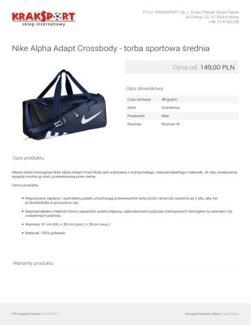 P.H.U. KRAKSPORT Sp.J. Zenon Piętak, Alicja Piętak Al.Pokoju 32, 31-564 Kraków +48 12 4140108 Nike Alpha Adapt Crossbody - torba sportowa średnia Cena od: 149,00 PLN Opis słownikowy Czas dostawy 48 godzin Kolor Granatowy Producent Nike Rozmiar Rozmiar M Opis produktu Męska torba treningowa Nike Alpha Adapt Cross Body jest wykonana z wytrzymałego, nieprzemakalnego materiału. W celu zwiększenia wygody można ją nosić przewieszoną przez ramię. Cechy produktu: Regulowane zapięcie i wyściełany pasek umożliwiają przewieszenie torby przez ramię lub noszenie jej z tyłu, aby nie przeszkadzała w poruszaniu się. Nieprzemakalny materiał chroni zawartość przed wilgocią i zabrudzeniami podczas intensywnych treningów na zewnątrz lub codziennych podróży. Wymiary: 61 cm (dł.) × 28 cm (szer.) × 28 cm (wys.) Materiał: 100% poliester. Warianty produktu Plik wygenerowano: 04-03-2017 Oprogramowanie sklepu: AptusShop P.H.U. KRAKSPORT Sp.J. Zenon Piętak, Alicja Piętak Al.Pokoju 32, 31-564 Kraków +48 12 4140108 M 149,00 PLN Galeria Plik wygenerowano: 04-03-2017 Powered by TCPDF (www.tcpdf.org) Oprogramowanie sklepu: AptusShop