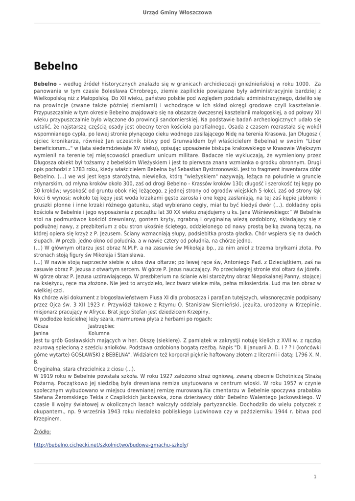 Urząd Gminy Włoszczowa Bebelno Bebelno – według źródeł historycznych znalazło się w granicach archidiecezji gnieźnieńskiej w roku 1000. Za panowania w tym czasie Bolesława Chrobrego, ziemie zapilickie powiązane były administracyjnie bardziej z Wielkopolską niż z Małopolską. Do XII wieku, państwo polskie pod względem podziału administracyjnego, dzieliło się na prowincje (zwane także później ziemiami) i wchodzące w ich skład okręgi grodowe czyli kasztelanie. Przypuszczalnie w tym okresie Bebelno znajdowało się na obszarze ówczesnej kasztelanii małogoskiej, a od połowy XII wieku przypuszczalnie było włączone do prowincji sandomierskiej. Na podstawie badań archeologicznych udało się ustalić, że najstarszą częścią osady jest obecny teren kościoła parafialnego. Osada z czasem rozrastała się wokół wspomnianego cypla, po lewej stronie płynącego cieku wodnego zasilającego Nidę na terenia Krasowa. Jan Długosz ( ojciec kronikarza, również Jan uczestnik bitwy pod Grunwaldem był właścicielem Bebelna) w swoim "Liber beneficiorum..." w (lata siedemdziesiąte XV wieku), opisując uposażenie biskupa krakowskiego w Krasowie Większym wymienił na terenie tej miejscowości praedium unicum militare. Badacze nie wykluczają, że wymieniony przez Długosza obiekt był tożsamy z bebelskim Wieżyskiem i jest to pierwsza znana wzmianka o grodku obronnym. Drugi opis pochodzi z 1783 roku, kiedy właścicielem Bebelna był Sebastian Bystrzonowski. Jest to fragment inwentarza dóbr Bebelno. (...) we wsi jest kępa starożytna, niewielka, którą "wieżyskiem" nazywają, leżąca na południe w gruncie młynarskim, od młyna kroków około 300, zaś od drogi Bebelno - Krassów kroków 130; długość i szerokość tej kępy po 30 kroków; wysokość od gruntu obok niej leżącego, z jednej strony od ogrodów wiejskich 5 łokci, zaś od strony łąk łokci 6 wynosi; wokoło tej kępy jest woda krzakami gęsto zarosła i one kępę zasłaniają, na tej zaś kępie jabłonki i gruszki płonne i inne krzaki różnego gatunku, stąd wybierano cegły, miał tu być kiedyś dwór (...). dokładny opis kościoła w Bebelnie i jego wyposażenia z początku lat 30 XX wieku znajdujemy u ks. Jana Wiśniewskiego:” W Bebelnie stoi na podmurówce kościół drewniany, gontem kryty, zgrabną i oryginalną wieżą ozdobiony, składający się z podłużnej nawy, z prezbiterium z obu stron ukośnie ściętego, oddzielonego od nawy prostą belką zwaną tęczą, na której opiera się krzyż z P. Jezusem. Ściany wzmacniają słupy, podsiebitka prosta gładka. Chór wspiera się na dwóch słupach. W prezb. jedno okno od południa, a w nawie cztery od południa, na chórze jedno. (...) W głównym ołtarzu jest obraz N.M.P. a na zasuwie św Mikołaja bp., za nim anioł z trzema bryłkami złota. Po stronach stoją figury św Mikołaja i Stanisława. (...) W nawie stoją naprzeciw siebie w ukos dwa ołtarze; po lewej ręce św, Antoniego Pad. z Dzieciątkiem, zaś na zasuwie obraz P. Jezusa z otwartym sercem. W górze P. Jezus nauczający. Po przeciwległej stronie stoi ołtarz św Józefa. W górze obraz P. Jezusa uzdrawiającego. W prezbiterium na ścianie wisi starożytny obraz Niepokalanej Panny, stojącej na księżycu, ręce ma złożone. Nie jest to arcydzieło, lecz twarz wielce miła, pełna miłosierdzia. Lud ma ten obraz w wielkiej czci. Na chórze wisi dokument z błogosławieństwem Piusa XI dla proboszcza i parafjan tutejszych, własnoręcznie podpisany przez Ojca św. 3 XII 1923 r. Przywiózł takowe z Rzymu O. Stanisław Siemieński, jezuita, urodzony w Krzepinie, misjonarz pracujący w Afryce. Brat jego Stefan jest dziedzicem Krzepiny. W podłodze kościelnej leży szara, marmurowa płyta z herbami po rogach: Oksza Jastrzębiec Janina Kolumna Jest tu grób Gosławskich mających w her. Okszę (siekierę). Z pamiątek w zakrystji notuję kielich z XVII w. z rączką ażurową splecioną z sześciu aniołków. Podstawa ozdobiona bogatą rzeźbą. Napis "D. II januarii A. D. I ? ? I (końcówki górne wytarte) GOSŁAWSKI z BEBELNA". Widziałem też korporał pięknie haftowany złotem z literami i datą: 1796 X. M. B. Oryginalna, stara chrzcielnica z ciosu (...). W 1919 roku w Bebelnie powstała szkoła. W roku 1927 założono straż ogniową, zwaną obecnie Ochotniczą Strażą Pożarną. Początkowo jej siedzibą była drewniana remiza usytuowana w centrum wioski. W roku 1957 w czynie społecznym wybudowano w miejscu drewnianej remizę murowaną.Na cmentarzu w Bebelnie spoczywa prababka Stefana Żeromskiego Tekla z Czaplickich Jackowska, żona dzierżawcy dóbr Bebelno Walentego Jackowskiego. W czasie II wojny światowej w okolicznych lasach walczyły oddziały partyzanckie. Dochodziło do wielu potyczek z okupantem., np. 9 września 1943 roku niedaleko pobliskiego Ludwinowa czy w październiku 1944 r. bitwa pod Krzepinem. Źródło: http://bebelno.cichecki.net/szkolnictwo/budowa-gmachu-szkoly/ 1 Urząd Gminy Włoszczowa http://bebelno.cichecki.net/okolica/bebelno/okres-miedzywojenny/ Opracowania dr Stanisława Janaczka 2