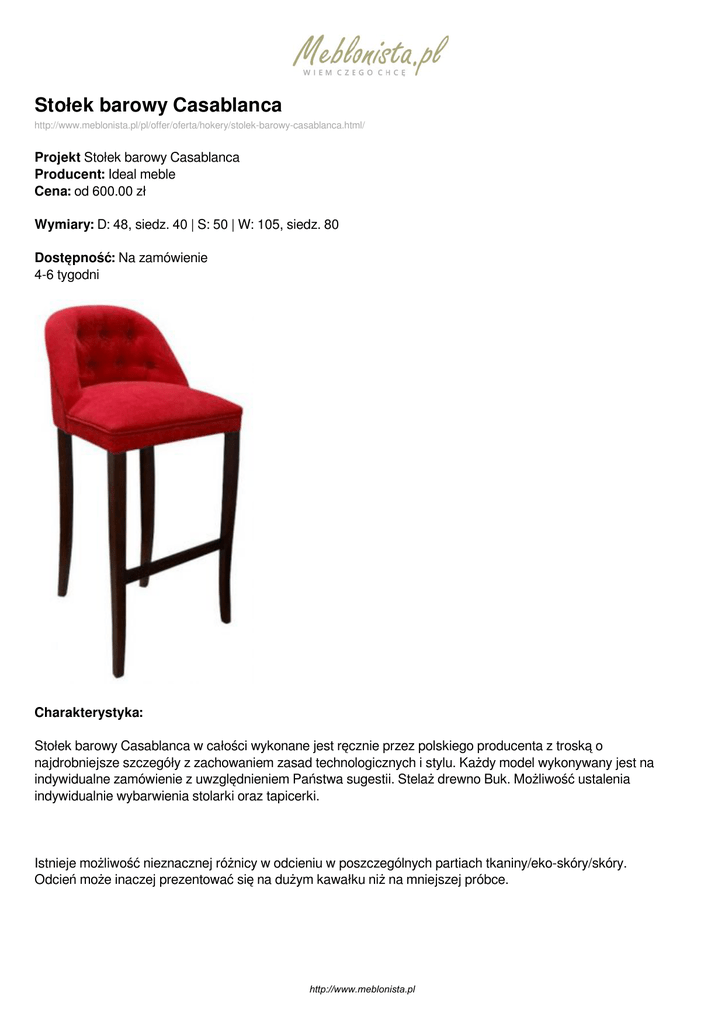 Stołek barowy Casablanca http://www.meblonista.pl/pl/offer/oferta/hokery/stolek-barowy-casablanca.html/ Projekt Stołek barowy Casablanca Producent: Ideal meble Cena: od 600.00 zł Wymiary: D: 48, siedz. 40 | S: 50 | W: 105, siedz. 80 Dostępność: Na zamówienie 4-6 tygodni Charakterystyka: Stołek barowy Casablanca w całości wykonane jest ręcznie przez polskiego producenta z troską o najdrobniejsze szczegóły z zachowaniem zasad technologicznych i stylu. Każdy model wykonywany jest na indywidualne zamówienie z uwzględnieniem Państwa sugestii. Stelaż drewno Buk. Możliwość ustalenia indywidualnie wybarwienia stolarki oraz tapicerki. Istnieje możliwość nieznacznej różnicy w odcieniu w poszczególnych partiach tkaniny/eko-skóry/skóry. Odcień może inaczej prezentować się na dużym kawałku niż na mniejszej próbce. http://www.meblonista.pl Podana cena dotyczy tapicerki z grupy I W przypadku tapicerki skórzanej prosimy o kontakt. http://www.meblonista.pl Dostępne wersje produktu: nazwa produktu Stołek barowy Casablanca warianty Tapicerka gr I materiał, tkanina, plusz cena 600.00zł dostępne 4-6 tygodni Stołek barowy Casablanca Tapicerka gr II materiał, tkanina, plusz 770.00zł 4-6 tygodni Stołek barowy Casablanca Tapicerka gr III materiał, tkanina, plusz 880.00zł 4-6 tygodni http://www.meblonista.pl Zdjęcia produktu: http://www.meblonista.pl Powered by TCPDF (www.tcpdf.org)