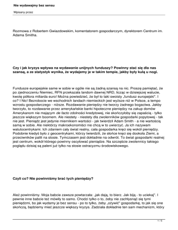 Nie wydawajmy bez sensu Wpisany przez Rozmowa z Robertem Gwiazdowskim, komentatorem gospodarczym, dyrektorem Centrum im. Adama Smitha. Czy i jak kryzys wpływa na wydawanie unijnych funduszy? Powinny stać się dla nas szansą, a ze statystyk wynika, że wydajemy je w takim tempie, jakby były kulą u nogi. Fundusze europejskie same w sobie w ogóle nie są żadną szansą na nic. Proszę pamiętać, że po zjednoczeniu Niemiec, RFN przekazała landom dawnej NRD, licząc w dzisiejszej walucie, kwotę półtora miliarda euro! Można powiedzieć, że był to taki swoisty „fundusz europejski". I co? I Nic! Bezrobocie we wschodnich landach niemieckich jest wyższe niż w Polsce, a tempo wzrostu gospodarczego - niższe. Rozdawanie pieniędzy nie tworzy żadnego bogactwa. Jakby tworzyło, to rozdawanie przez amerykańskie banki hipoteczne pieniędzy na zakup domów Amerykanom nie mającym de facto zdolności kredytowej, nie skończyłoby się zapaścią - tylko jeszcze większym boomem. Ale niestety - niestety dla zwolenników gospodarki popytowej - tak nie jest. Pieniądz jest jedynie miernikiem wartości - jak twierdził Adam Smith - a nie wartością samą w sobie. Ale niektórzy makroekonomiści nie chcą w to uwierzyć. Ja ich nazywam walutocentrykami. Ich zdaniem cały świat realny, cała gospodarka kręci się wokół pieniędzy. Podobnie kiedyś było z geocentrykami, którzy twierdzili, że słońce kręci się dookoła Ziemi, a przeciwników palili na stosie. Tymczasem jest dokładnie na odwrót. To świat gospodarki realnej jest centrum, wokół którego powinny oscylować pieniądze. Na szczęście zwolennicy takiego poglądu dzisiaj są paleni już tylko na stosie ostracyzmu środowiskowego. Czyli co? Nie powinniśmy brać tych pieniędzy? Ależ powinniśmy. Moja babcie zawsze powtarzała: „jak dają, to bierz. Jak biją - to uciekaj". I pewnie inne babcie też mówiły to samo. Chodzi tylko o to, żeby nie zachłysnąć się tymi pieniędzmi, bo jak wydamy je bez sensu - po to tylko, żeby „ożywić" gospodarkę, to jak się one skończą, będziemy mieć jeszcze większy kryzys. Zadziała dokładnie ten sam mechanizm, który 1/5 Nie wydawajmy bez sensu Wpisany przez działa obecnie. Wydawanie przez kilka lat „łatwych" pieniędzy, które mógł w Ameryce dostać „każdy głupi" spowodowało, że mamy odczuwalny kryzys - bo pieniądze te nie ożywiały przedsiębiorczości, tylko konsumpcję, przez co producentom wydawało się, że zawsze będą wszystko na pniu sprzedawać, bez względu na to, za ile i jak produkują - exemplum: amerykański przemysł samochodowy. To jak wobec tego ocenia Pan skuteczność działań antykryzysowych rządu? Jakich działań? Rząd tradycyjnie nie robi nic - tylko podpuszcza pana prezydenta, żeby ten coś zrobił, albo powiedział. Wzrost poparcia dla rządu od razu jest murowany. Ale tym razem to dobrze. Rządowi należy się jednak pochwała, że nic nie robi. Oczywiście podejrzewam, że rząd nic nie robi nie dlatego, że ma taką strategię, ale dlatego, że nie za bardzo wie, co powinien zrobić i obawiam się, że jak już zacznie robić pod wpływem walutocentryków, to dopiero będzie nieszczęście. Tym którzy namawiają rząd do zwiększania deficytu czy drukowania pieniędzy, żeby „wesprzeć" sektor finansowy i „ożywić" gospodarkę chciałbym przypomnieć, że w stanie wojennym stałem przez 13 dni i nocy w kolejce po lodówkę. Generowałem popyt jak jasna cholera, a podaży jak nie było, tak nie było. W końcu 14. dnia kupiłem pralkę, bo właśnie „rzucili", której nie potrzebowałem, i wymieniłem ją z kolegą, który chciał właśnie pralkę, a kupił lodówkę - bo w sklepie, w którym on stał po pralkę, akurat była dostawa lodówek. Transakcja odbyła się w barterze - bez udziału pieniędzy, które nie były do niczego potrzebne. Podstawowym działaniem antykryzysowym powinno być wyeliminowanie głównej przyczyny kryzysu, czyli barbarzyńskiego opodatkowania pracy. Jak mówił nieodżałowany Kisiel o kryzysie w socjalizmie - „to nie kryzys. To rezultat". Dziś jest tak samo. Mamy rezultat opodatkowania pracy akcyzą w wysokości 80 procent. Jak młody człowiek idzie do pracy, której wartość pracodawca wycenia na 3600 zł - to on dostaje 2000. Reszta - czyli 1600 złotych - idzie do urzędu skarbowego na zaliczkę na PIT i na składki ubezpieczeniowe do ZUS. Zgodnie z prawem Saya zdolność popytowa takiego człowieka mierzona wartością jego podaży wynosi 3600. Ale po opodatkowaniu maleje do 2000. Reszta idzie między innymi na dotacje budżetowe dla partii politycznych, które płacą za spoty telewizyjne wychwalające własne dokonania i wyszydzające przeciwników politycznych. A od tego wzrostu gospodarczego nie ma i nie będzie. 2/5 Nie wydawajmy bez sensu Wpisany przez Rząd założył, że w tym roku wyda 16,8 mld zł unijnych pieniędzy, co zważywszy na dotychczasowe tempo, w jakim je wydajemy, jest chyba zadaniem nierealnym. Co według Pana przeszkadza nam w szybkim korzystaniu z tych pieniędzy? Po pierwsze: biurokracja. Po drugie: nepotyzm. Nie wiem co bardziej. Fundusze są dzielone źle, bez strategicznego pomysłu na co je wydawać. Wydamy więc po trochu na różne rzeczy i nie będzie w żadnej sferze widocznego rezultatu. Jedni urzędnicy starają się nikomu nie podpaść, więc celebrują wydawanie decyzji, a inni wręcz przeciwnie - starają się niektórym przysłużyć. I dzieje się tak czasami niekoniecznie dlatego, że są jakieś polityczne naciski, tylko dlatego, że się urzędnicy owych nacisków spodziewają. Kolejne rządy zapowiadały uproszczenia - dlaczego dotychczas nie powstało coś w rodzaju komisji Palikota dla funduszy europejskich, która pomogłaby systemowo uprościć korzystanie z unijnych dotacji? A o to proszę zapytać pana posła Palikota. Ale może lepiej, że nie powstała - jeśli rezultat jej prac miałby być taki sam, to szkoda en