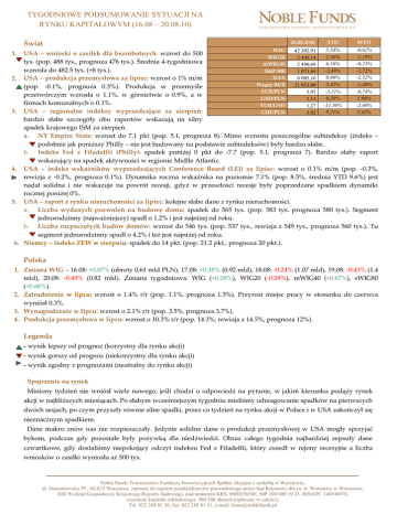 TYGODNIOWE PODSUMOWANIE SYTUACJI NA RYNKU KAPITAŁOWYM (16.08 – 20.08.10) 20.08.2010 Świat WIG WIG20 mWIG40 S&P 500 DAX Węgry BUX EUR/PLN USD/PLN EUR/USD CHF/PLN 1. 42 202,91 2 445,14 2 490,69 1 071,69 6 005,16 21 953,89 3,97 3,13 1,27 3,02 YTD MTD 5,54% 2,36% 6,16% -3,89% 0,80% 3,42% -3,11% 9,28% -11,30% 9,21% -0,62% -1,19% -0,23% -2,72% -2,32% -1,40% -0,74% 1,90% -2,60% 2,42% USA – wnioski o zasiłek dla bezrobotnych: wzrost do 500 tys. (pop. 488 tys., prognoza 476 tys.). Średnia 4-tygodniowa wzrosła do 482.5 tys. (+8 tys.). 2. USA – produkcja przemysłowa za lipiec: wzrost o 1% m/m (pop. -0.1%, prognoza 0.5%). Produkcja w przemyśle przetwórczym wzrosła o 1.1%, w górnictwie o 0.9%, a w firmach komunalnych o 0.1%. 3. USA – regionalne indeksy wyprzedzające za sierpień: bardzo słabe szczegóły obu raportów wskazują na silny spadek krajowego ISM za sierpień. a. NY Empire State: wzrost do 7.1 pkt (pop. 5.1, prognoza 8). Mimo wzrostu poszczególne subindeksy (indeks – podobnie jak poniższy Philly – nie jest budowany na podstawie subindeksów) były bardzo słabe. b. Indeks Fed z Filadelfii (Philly): spadek poniżej 0 pkt do -7.7 (pop. 5.1, prognoza 7). Bardzo słaby raport wskazujący na spadek aktywności w regionie Midlle Atlantic. 4. USA – indeks wskaźników wyprzedzających Conference Board (LEI) za lipiec: wzrost o 0.1% m/m (pop. -0.3%, rewizja z -0.2%, prognoza 0.1%). Dynamika roczna wskaźnika na poziomie 7.1% (pop. 8.5%, średnia YTD 9.6%) jest nadal solidna i nie wskazuje na powrót recesji, gdyż w przeszłości recesje były poprzedzane spadkiem dynamiki rocznej poniżej 0%. 5. USA – raport z rynku nieruchomości za lipiec: kolejne słabe dane z rynku nieruchomości. a. Liczba wydanych pozwoleń na budowę domu: spadek do 565 tys. (pop. 583 tys. prognoza 580 tys.). Segment jednorodzinny (najważniejszy) spadł o 1.2% i jest najniżej od roku. b. Liczba rozpoczętych budów domów: wzrost do 546 tys. (pop. 537 tys., rewizja z 549 tys., prognoza 560 tys.). Tu segment jednorodzinny spadł o 4.2% i też jest najniżej od roku. 6. Niemcy – indeks ZEW w sierpniu: spadek do 14 pkt. (pop. 21.2 pkt., prognoza 20 pkt.). Polska 1. Zmiana WIG – 16.08: +0.87% (obroty 0,61 mld PLN), 17.08: +0.38% (0.92 mld), 18.08: -0.24% (1.07 mld), 19.08: -0.43% (1.4 mld), 20.08: -0.49% (0.82 mld). Zmiana tygodniowa: WIG (+0.08%), WIG20 (-0.28%), mWIG40 (+0.67%), sWIG80 (+0.68%). 2. Zatrudnienie w lipcu: wzrost o 1.4% r/r (pop. 1.1%, prognoza 1.3%). Przyrost miejsc pracy w stosunku do czerwca wyniósł 0.3%. 3. Wynagrodzenie w lipcu: wzrost o 2.1% r/r (pop. 3.5%, prognoza 3.7%). 4. Produkcja przemysłowa w lipcu: wzrost o 10.3% r/r (pop. 14.3%, rewizja z 14.5%, prognoza 12%). Legenda - wynik lepszy od prognoz (korzystny dla rynku akcji) - wynik gorszy od prognoz (niekorzystny dla rynku akcji) - wynik zgodny z prognozami (neutralny do rynku akcji) Spojrzenie na rynek Miniony tydzień nie wniósł wiele nowego, jeśli chodzi o odpowiedź na pytanie, w jakim kierunku podąży rynek akcji w najbliższych miesiącach. Po słabym wcześniejszym tygodniu mieliśmy odreagowanie spadków na pierwszych dwóch sesjach, po czym przyszły równie silne spadki, przez co tydzień na rynku akcji w Polsce i w USA zakończył się nieznacznym spadkiem. Dane makro znów nas nie rozpieszczały. Jedynie solidne dane o produkcji przemysłowej w USA mogły sprzyjać bykom, podczas gdy pozostałe były pożywką dla niedźwiedzi. Obraz całego tygodnia najbardziej zepsuły dane czwartkowe, gdy dostaliśmy niepokojący odczyt indeksu Fed z Filadelfii, który zszedł w rejony recesyjne a liczba wniosków o zasiłki wyniosła aż 500 tys. Noble Funds Towarzystwo Funduszy Inwestycyjnych Spółka Akcyjna z siedzibą w Warszawie, ul. Domaniewska 39 , 02-672 Warszawa, wpisana do rejestru przedsiębiorców prowadzonego przez Sąd Rejonowy dla m. st. Warszawy w Warszawie, XIII Wydział Gospodarczy Krajowego Rejestru Sądowego, pod numerem KRS: 0000256540, NIP 108 000 19 23, REGON 140546970, wysokość kapitału zakładowego: 500 200 złotych (opłacony w całości). Tel. 022 288 81 30, fax. 022 288 81 31, e-mail: [email protected] TYGODNIOWE PODSUMOWANIE SYTUACJI NA RYNKU KAPITAŁOWYM (16.08 – 20.08.10) Bardzo ważne, naszym zdaniem, dane napłynęły z kwartalnego badania Fed dotyczącego polityki kredytowej w bankach. Raport pokazał luzowanie standardów kredytowych przez banki w niemal wszystkich kategoriach pożyczek. Co ważne w kategorii pożyczek C&I (commercial and industrial) luzowanie objęło już nie tylko duże korporacje, ale przeniosło się też na tak ważny dla amerykańskiej gospodarki mały biznes. Popyt na kredyt nadal jest słaby, przy czym raport pokazuje, że tempo spadku popytu jest coraz wolniejsze, a w kategorii C&I dla dużych firm popyt rośnie (dobrze wróży dla kontynuacji ożywienia w inwestycjach firm). Jest to istotny sygnał sugerujący, że system finansowy może w końcu zacząć powoli wspierać ożywienie w gospodarce. Nie należy tu oczekiwać istotnego przyspieszenia w kredytach (wciąż trwa delewarowanie się konsumentów, przez co popyt na kredyty pozostanie w tej kategorii słaby przez długi czas). Kolejnym sygnałem pokazującym lepszą kondycję sektora finansowego w USA był raport Fed z Nowego Jorku pokazujący, że w minionym kwartale w końcu nastąpiła poprawa jakości portfela kredytowego, po kilku latach pogarszania się. Poprawa kondycji w sektorze finansowym nie rozwiązuje problemów gospodarki USA, tracącej impet w ostatnich miesiącach, ale jest to ważny sygnał łagodzący tezę, że gospodarka USA znajdzie się niebawem w kolejnej recesji. Na uwagę w ubiegłym tygodniu i na początku rozpoczętego zasługuje wzrost aktywności firm w zakresie fuzji i przejęć (M&A). Jest to niewątpliwie byczy sygnał, gdy firmy chcą przejmować inne spółki płacąc – tak jak w ostatnich ofertach – kilkadziesiąt procent powyżej ceny rynkowej. 