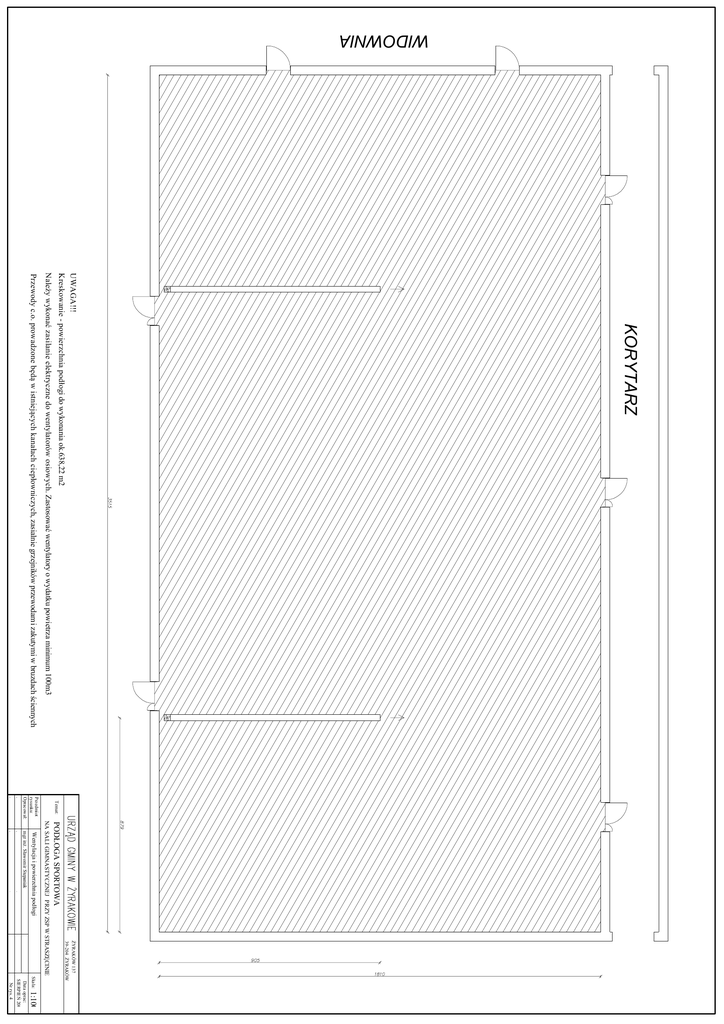 KORYTARZ UWAGA!!! Kreskowanie - powierzchnia podłogi do wykonania ok.638,22 m2 Należy wykonać zasilanie elektryczne do wentylatorów osiowych. Zastosować wentylatory o wydatku powietrza minimum 100m3 Przewody c.o. prowadzone będą w istniejących kanałach ciepłowniczych, zasialnie grzejników przewodami zakutymi w bruzdach ściennych Temat: Przedmiot rysunku: Opracował: . . PODŁOGA SPORTOWA 1:100 Nr rys. 4 Data oprac: SIERPIEŃ 2008 Skala: ŻYRAKÓW 137 39-204 ŻYRAKÓW NA SALI GIMNASTYCZNEJ PRZY ZSP W STRASZĘCINIE . . Wentylacja i powierzchnia podłogi mgr inż. Sławomir Stepaniak . . WIDOWNIA
