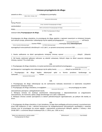 Umowa przystąpienia do długu zawarta w dniu ……………………………………. w Bydgoszczy pomiędzy: (data: dzieo, miesiąc, rok) ……………………………................................................................................................................................... (oznaczenie Wierzyciela) a Panią /Panem ……………………………………………………………………………………………………………………………………… (Imię i nazwisko Przystępującego do długu) zamieszkałym: ………………………………………………………………………………………………………………………………… (Adres zamieszkania Przystępującego do długu) PESEL: …………………………………………………………………………………………………………………………………………………. (nr PESEL Przystępującego do długu) zwanym dalej Przystępującym do długu. § 1. Przystępujący do długu oświadcza, że przystępuje do długu zgodnie z zapisami zawartymi w niniejszej Umowie, tym samym uznaje, potwierdza i zobowiązuje się do zapłaty przysługujących …………………………………….. od Pani/a (oznaczenie Wierzyciela) …………………………………………. (numer PESEL …………………………………..., zwanej/go dalej Zobowiązanym) (Imię i nazwisko Zobowiązanego) (nr PESEL Zobowiązanego) wymagalnych wierzytelności określonych w § 2 pkt 1, w sprawie oznaczonej numerem EGB …………………………… § 2. 1. Kwota zadłużenia na dzieo sporządzenia niniejszej Umowy wynosi …………………………. złotych (słownie: ……………………………………………………………………………………………………………………………………………). 2. Od kwoty należności głównej naliczane są odsetki ustawowe, których stopa na dzieo zawarcia niniejszej Umowy, wynosi 7 % w skali roku. § 3. 1. Przystępujący do długu oświadcza, że wyżej wymieniona wierzytelnośd przysługująca ……………………………………… (oznaczenie Wierzyciela) jest bezsporna i wymagalna oraz zobowiązuje się do spłaty kwoty ……………….. złotych w terminie do ……………….r. 2. Przystępujący do długu będzie dokonywał spłat w formie przelewu bankowego na rachunek……………………………………………… numer …………………………………………………………………………………………………. (oznaczenie Wierzyciela) § 4. 1. Przystępujący do długu zobowiązuje się do zachowania należytej staranności w wykonaniu wszystkich postanowieo niniejszej Umowy. 2. Przystępujący do długu oświadcza, że względem ………………………………………………. nie przysługują mu żadne (oznaczenie Wierzyciela) wierzytelności pieniężne z jakiegokolwiek tytułu. 3. Niniejsza Umowa nie skutkuje zwolnieniem Zobowiązanego z odpowiedzialności za uregulowanie wierzytelności, do momentu spłaty całego określonego w § 2 pkt.1 zadłużenia. 4. Niniejsza Umowa została sporządzona w dwóch jednobrzmiących egzemplarzach, po jednym dla każdej ze Stron. § 5. 1. Przystępujący do długu oświadcza, iż jest świadomy, że jego dane podlegają ochronie prawnej i są przetwarzane przez EGB wyłącznie w celu i zakresie koniecznym do wyegzekwowania wierzytelności wynikającej z zawartej Umowy oraz że przysługuje mu prawo wglądu i poprawiania przekazanych danych, zgodnie z Ustawą z dnia 29.08.1997 r. o ochronie danych osobowych (Dz. U. 2014, poz. 1182 ze zm.). ….…….….............................................................. (Data oraz własnoręczny czytelny podpis Przystępującego do długu) ….…….….............................................................. (Pełnomocnik ……………………………- Ewa Kubiak)