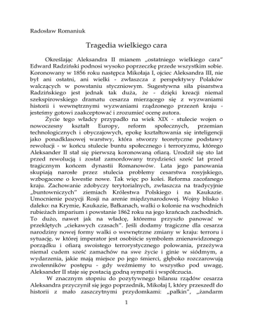 Radosław Romaniuk Tragedia wielkiego cara Określając Aleksandra II mianem „ostatniego wielkiego cara” Edward Radziński podnosi wysoko poprzeczkę przede wszystkim sobie. Koronowany w 1856 roku następca Mikołaja I, ojciec Aleksandra III, nie był ani ostatni, ani wielki - zwłaszcza z perspektywy Polaków walczących w powstaniu styczniowym. Sugestywna siła pisarstwa Radzińskiego jest jednak tak duża, że - dzięki kreacji niemal szekspirowskiego dramatu cesarza mierzącego się z wyzwaniami historii i wewnętrznymi wyzwaniami rządzonego przezeń kraju jesteśmy gotowi zaakceptować i zrozumieć ocenę autora. Życie tego władcy przypadło na wiek XIX - stulecie wojen o nowoczesny kształt Europy, reform społecznych, przemian technologicznych i obyczajowych, epokę kształtowania się inteligencji jako ponadklasowej warstwy, która stworzy teoretyczne podstawy rewolucji - w końcu stulecie buntu społecznego i terroryzmu, którego Aleksander II stał się pierwszą koronowaną ofiarą. Urodził się sto lat przed rewolucją i został zamordowany trzydzieści sześć lat przed tragicznym końcem dynastii Romanowów. Lata jego panowania skupiają narosłe przez stulecia problemy cesarstwa rosyjskiego, wzbogacone o kwestie nowe. Tak więc po kolei. Reforma zacofanego kraju. Zachowanie zdobyczy terytorialnych, zwłaszcza na tradycyjnie „buntowniczych” ziemiach Królestwa Polskiego i na Kaukazie. Umocnienie pozycji Rosji na arenie międzynarodowej. Wojny blisko i daleko: na Krymie, Kaukazie, Bałkanach, walki o kolonie na wschodnich rubieżach imparium i powstanie 1862 roku na jego krańcach zachodnich. To dużo, nawet jak na władcę, któremu przyszło panować w przeklętych „ciekawych czasach”. Jeśli dodamy tragiczne dla cesarza narodziny nowej formy walki o wewnętrzne zmiany w kraju: terroru i sytuację, w której imperator jest osobiście symbolem znienawidzonego porządku i ofiarą swoistego terrorystycznego polowania, przeżywa niemal cudem sześć zamachów na swe życie i ginie w siódmym, a wydarzenia, jakie mają miejsce po jego śmierci, głęboko rozczarowują zwolenników postępu - gdy weźmiemy to wszystko pod uwagę, Aleksander II staje się postacią godną sympatii i współczucia. W znacznym stopniu do pozytywnego bilansu rządów cesarza Aleksandra przyczynił się jego poprzednik, Mikołaj I, który przeszedł do historii z mało zaszczytnymi przydomkami: „pałkin”, „żandarm 1 Europy”. Za jego panowania stworzono nowoczesny wzór przyszłych totalitarnych rządów Rosją. Tajna policja po raz pierwszy odegrała ważną rolę w wewnętrznym życiu kraju. Stłumione krwawo powstanie dekabrystów przyniosło represje uczestników, które także po raz pierwszy systemowo dotykały również ich rodzin, pozbawianych szlachectwa i praw obywatelskich. Dla absolutnej władzy cesarza utworzono ideologiczny fundament - trójcę: „samodzierżawie prawosławie - narodowość”. „Rosja jest państwem militarnym i jej przeznaczeniem jest być postrachem świata” - taki polityczny testament pozostawił Mikołaj I swemu następcy. Radziński przedstawia Aleksandra II jako patrona pieriestrojki, rozpoczętej efektownie zniesieniem poddaństwa chłopów, zakończonej niezrealizowanymi planami Konstytucji i demokratyzacji życia politycznego. Nie przypadkiem słynna metafora „odwilży”, zanim użyto jej dla przemian dwudziestowiecznych, została przez Fiodora Tiutczewa uknuta właśnie dla rządów Aleksandra. Cesarz na własnej skórze poznaje paradoks wolności. Zniesienie poddaństwa i liberalizacja polityki wewnętrznej nie wywołała wbrew pozorom ogólnego zadowolenia. „[...] Dość triumfowania/ Czas naprzód iść. Lud wolny,/ ale czy szczęśliwy?” - pytał poeta Mikołaj Niekrasow. Gdy lud nie był wolny, nie pojawiało się pytanie o szczęście. Wolność wywołała poczucie niedosytu i niezadowolenia, była zerwaniem owocu z drzewa poznania, które wznieciło bunt przeciw podporządkowaniu imperatorskiej władzy. Liberalizacja życia społecznego sprawiła, że „czymś najbardziej odstręczającym” w państwie stało się samodzierżawie. Wola społecznych ustępstw władcy dość szybko dotarła więc do nieprzekraczalnych granic, zaś próby zakonserwowania przeszłości przypominały pragnienie ułożenia życia na beczce prochu. (Bomby, podkładane na trasach przejazdu cesarza, a nawet w Pałacu Zimowym, stanowią swoją drogą leitmotiv książki). Opisana sytuacja jest w monografii Radzińskiego okazją do zadania pytań wkraczających już w dziedzinę historiozofii i rozważań na temat miejsca jednostki wśród ścierających się grup interesów. Zmieniając Rosję, Aleksander II zmierzał do oddania władzy i narażał się gotowym na wszystko konserwatystom; starając się utrwalić samodzierżawie, wystawiał się na niebezpieczeństwo tragicznej śmierci z rąk terrorystów. Nie trudno w jego przypadku wspomnieć legendę przypisaną jego dziadkowi i imiennikowi - Aleksandrowi I - opowieść o imperatorze, który przestaje pragnąć być carem i aranżując swoją śmierć, zamyka się w którymś z odludnych klasztorów. Byłoby to, 2 paradoksalnie, jedyne wyjście, które mogłoby gwarantować pogodną starość cesarza. Radziński skłania się ku jeszcze jednej możliwości zejścia z tragicznych dróg historii. Proponowali ją Włodzimierz Sołowjow i (choć autor z niewiadomych przyczyn nie wymienia go) Lew Tołstoj. Było to zaprzestanie odpowiadania przemocą na przemoc terroryzmu, w duchu przebaczenia Chrystusowego, zawartego w formule „idź i nie grzesz więcej”. Pomysł to nie mniej oryginalny niż zniknięcie cesarza, lecz nie można go zdecydowanie odrzucić, dopóki nikt go nie sprawdził, nie sprawdził siły utopii, która może mieć moc przemieniającą ludzkie serca. Na kreślony przez monografistę dramat Aleksandra II składają się omawiane przez autora działania pałacowej opozycji