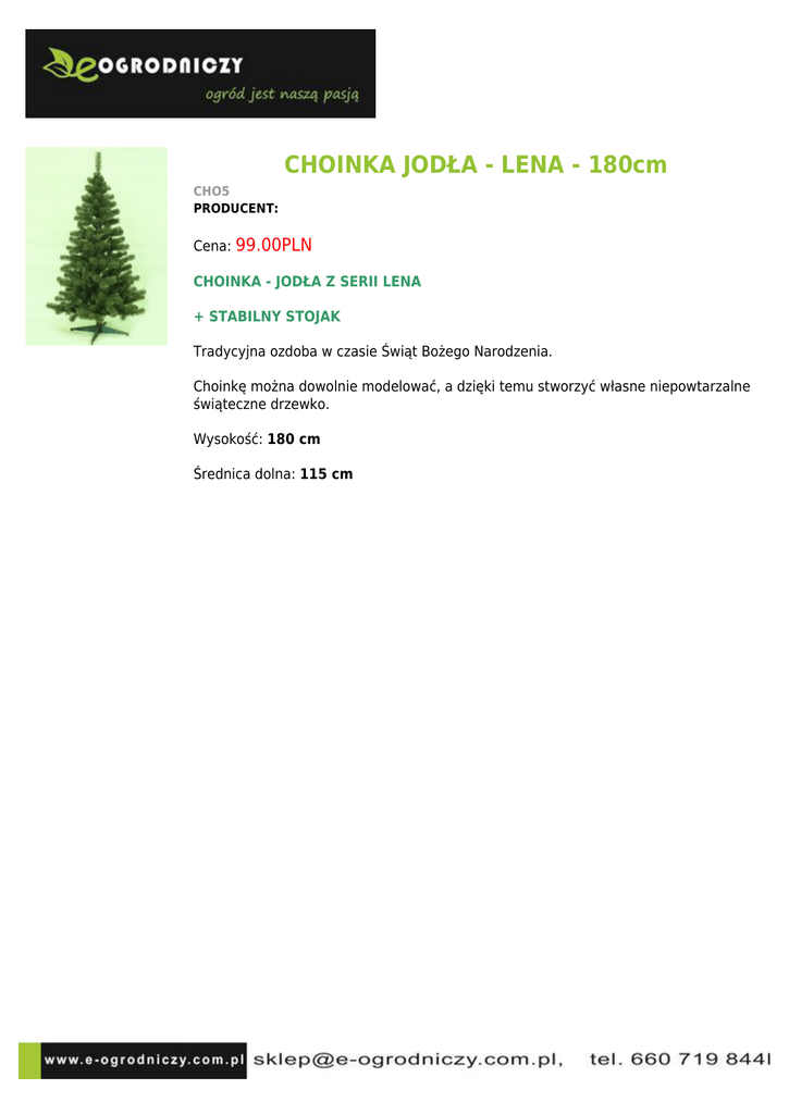 CHOINKA JODŁA - LENA - 180cm CHO5 PRODUCENT: Cena: 99.00PLN CHOINKA - JODŁA Z SERII LENA + STABILNY STOJAK Tradycyjna ozdoba w czasie Świąt Bożego Narodzenia. Choinkę można dowolnie modelować, a dzięki temu stworzyć własne niepowtarzalne świąteczne drzewko. Wysokość: 180 cm Średnica dolna: 115 cm