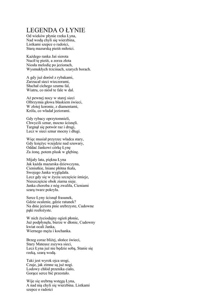 LEGENDA O ŁYNIE Od wieków płynie rzeka Łyna, Nad wodą chyli się wierzbina, Listkami szepce o radości, Starą mazurską pieśń miłości. Każdego ranka Jaś sierota Nucił tę pieśń, a zorza złota Niosła melodię po jeziorach, Wysmukłych trzcinach, szarych borach. A gdy już dorósł z rybakami, Zarzucał sieci wieczorami, Słuchał cichego szumu fal, Wiatru, co niósł te fale w dal. Aż pewnej nocy w starej sieci Olbrzymia głowa blaskiem świeci, W złotej koronie, z diamentami, Króla, co władał jeziorami. Gdy rybacy oprzytomnieli, Chwycili sznur, mocno ścisnęli. Targnął się potwór raz i drugi, Lecz w sieci sznur mocny i długi. Więc musiał przyrzec władca stary, Gdy księżyc wzejdzie nad szuwary, Oddać Jankowi córkę Łynę Za żonę, potem plusk w głębinę. Mijały lata, piękna Łyna Jak każda mazurska dziewczyna, Cieniutkie, lniane płótna tkała, Swojego Janka wyglądała. Lecz gdy się w życiu szczęście śmieje, Nieszczęście obok ziarna sieje. Janka choroba z nóg zwaliła, Cieniami szarą twarz pokryła. Serce Łyny ścisnął frasunek, Gdzie ocalenie, gdzie ratunek? Na dnie jeziora pnie srebrzyste, Cudowne pąki rozłożyste. W nich życiodajny ogień płonie, Już podpłynęła, bierze w dłonie, Cudowny kwiat ocali Janka, Wiernego męża i kochanka. Brzeg coraz bliżej, słońce świeci, Stary Mateusz zszywa sieci, Lecz Łyna już nie będzie sobą, Stanie się rzeką, szarą wodą. Taki jest wyrok ojca srogi, Czuje, jak zimne są już nogi. Lodowy chłód przenika ciało, Gorące serce bić przestało. Wije się srebrną wstęgą Łyna, A nad nią chyli się wierzbina. Listkami szepce o radości Starą mazurską pieśń miłości. Legendy mają to do siebie, Czy było tak, czy nie, nikt nie wie. Nie szukaj prawdy szkoda czasu, Chcesz prawdę znać, posłuchaj lasu.