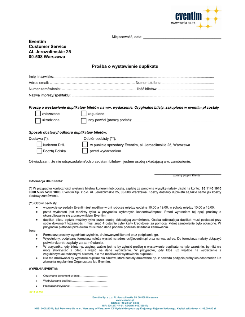Miejscowość, data: ___________________________________ Eventim Customer Service Al. Jerozolimskie 25 00-508 Warszawa Prośba o wystawienie duplikatu Imię i nazwisko: .............................................................................................................................................................. Adres email: …………………………………………………………….. Numer telefonu:.................................................... Numer zamówienia: ………………………………………………..…… Ilość biletów:........................................................ Nazwa imprezy/spektaklu: ............................................................................................................................................. Proszę o wystawienie duplikatów biletów na ww. wydarzenie. Oryginalne bilety, zakupione w eventim.pl zostały zniszczone zagubione ukradzione inny powód (proszę podać): ................................................................................. Sposób dostawy/ odbioru duplikatów biletów: Dostawa (*): Odbiór osobisty (**): kurierem DHL w punkcie sprzedaży Eventim, al. Jerozolimskie 25, Warszawa Pocztą Polska przed wydarzeniem Oświadczam, że nie odsprzedałem/odsprzedałam biletów i jestem osobą składającą ww. zamówienie. ______________________________ czytelny podpis Klienta Informacja dla Klienta: (*) W przypadku konieczności wysłania biletów kurierem lub pocztą, zapłatę za ponowną wysyłkę należy uiścić na konto: 85 1140 1010 0000 5325 5200 1003; Eventim Sp. z o.o. Al. Jerozolimskie 25, 00-508 Warszawa. Koszty dostawy duplikatu są takie same jak koszty dostawy zamówienia. (**) Odbiór osobisty w punkcie sprzedaży Eventim jest możliwy w dni robocze między godziną 10:00 a 19:00, w soboty między 10:00 a 15:00. przed wydarzeń jest możliwy tylko w przypadku wybranych koncertów/imprez. Przed wybraniem tej opcji prosimy o skonsultowanie się z pracownikiem Eventim. duplikat biletu będzie możliwy tylko przez osobę składającą zamówienie. Osoba odbierająca duplikat musi posiadać przy sobie dokument tożsamości i musi znać 4 ostatnie cyfry karty kredytowej za pomocą, której zamówienie było opłacone. W przypadku płatności przelewem musi znać dane podane podczas składania zamówienia. Inne: Formularz prosimy wypełniać czytelnie, drukowanymi literami oraz podpisanie go. Wypełniony, podpisany formularz należy wysłać na adres [email protected] oraz na ww. adres. Do formularza należy dołączyć potwierdzenie zapłaty za zamówienie. W przypadku, gdy bilety np. zaginą, ważne jest to by zgłosić prośbę o wystawienie duplikatu na tyle wcześnie, by nikt nie mógł skorzystać z biletu i wejść na dane wydarzenie. W przypadku, gdy ktoś już wejdzie na wydarzenie z zagubionymi/ukradzionymi biletami, nie ma możliwości wystawienia duplikatu. Nie ma możliwości by wystawić duplikat dla biletów, które zostały anulowane np. z powodu podjęcia próby ich odsprzedaż lub złamania regulaminu Organizatora lub Eventim. 1. WYPEŁNIA EVENTIM: Otrzymano dokument w dniu:………………………… Wydrukowano duplikat:……………………………….. Przekazano/wysłano:………………………………….. (2014-05-05) _____________________________________________________________________________________________________________________________ _______________ Eventim Sp. z o.o. Al. Jerozolimskie 25, 00-508 Warszawa www.eventim.pl telefon: +48 22 591 83 83 NIP: 526-277-47-51; REGON: 015765917; KRS: 000021354; Sąd Rejonowy dla m. st. Warszawy w Warszawie, XII Wydział Gospodarczy Krajowego Rejestru Sądowego; Kapitał zakładowy: 4.106.000,00 zł
