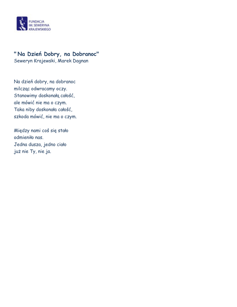 " Na Dzień Dobry, na Dobranoc" Seweryn Krajewski, Marek Dagnan Na dzień dobry, na dobranoc milcząc odwracamy oczy. Stanowimy doskonałą całość, ale mówić nie ma o czym. Taka niby doskonała całość, szkoda mówić, nie ma o czym. Między nami coś się stało odmieniło nas. Jedna dusza, jedno ciało już nie Ty, nie ja.