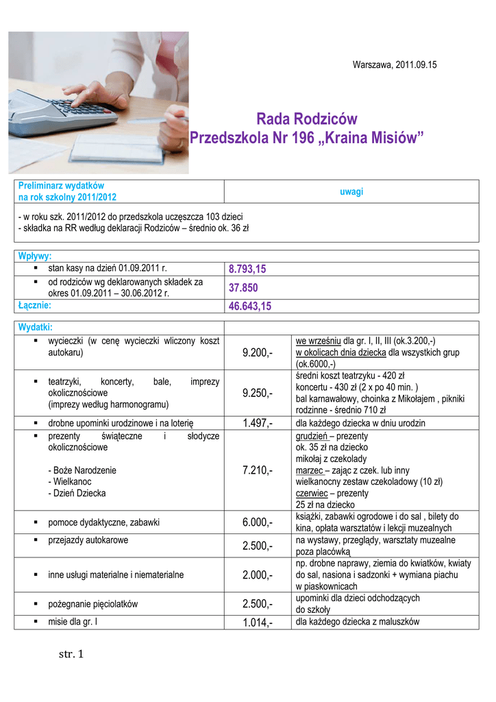 Warszawa, 2011.09.15 Rada Rodziców Przedszkola Nr 196 „Kraina Misiów” Preliminarz wydatków na rok szkolny 2011/2012 uwagi - w roku szk. 2011/2012 do przedszkola uczęszcza 103 dzieci - składka na RR według deklaracji Rodziców – średnio ok. 36 zł Wpływy: stan kasy na dzień 01.09.2011 r. od rodziców wg deklarowanych składek za okres 01.09.2011 – 30.06.2012 r. Łącznie: Wydatki: wycieczki (w cenę wycieczki wliczony koszt autokaru) teatrzyki, koncerty, bale, okolicznościowe (imprezy według harmonogramu) 8.793,15 37.850 46.643,15 9.200,- imprezy 9.250,- drobne upominki urodzinowe i na loterię prezenty świąteczne i słodycze okolicznościowe 1.497,- - Boże Narodzenie - Wielkanoc - Dzień Dziecka 7.210,- pomoce dydaktyczne, zabawki 6.000,- przejazdy autokarowe inne usługi materialne i niematerialne 2.000,- pożegnanie pięciolatków 2.500,- misie dla gr. I 1.014,- str. 1 2.500,- we wrześniu dla gr. I, II, III (ok.3.200,-) w okolicach dnia dziecka dla wszystkich grup (ok.6000,-) średni koszt teatrzyku - 420 zł koncertu - 430 zł (2 x po 40 min. ) bal karnawałowy, choinka z Mikołajem , pikniki rodzinne - średnio 710 zł dla każdego dziecka w dniu urodzin grudzień – prezenty ok. 35 zł na dziecko mikołaj z czekolady marzec – zając z czek. lub inny wielkanocny zestaw czekoladowy (10 zł) czerwiec – prezenty 25 zł na dziecko książki, zabawki ogrodowe i do sal , bilety do kina, opłata warsztatów i lekcji muzealnych na wystawy, przeglądy, warsztaty muzealne poza placówką np. drobne naprawy, ziemia do kwiatków, kwiaty do sal, nasiona i sadzonki + wymiana piachu w piaskownicach upominki dla dzieci odchodzących do szkoły dla każdego dziecka z maluszków tusze do drukarek artykuły papiernicze, materiały do dekoracji okolicznościowych transport zakupionych artykułów serwis internetowy ubezpieczenie OC przedszkola porto paliwo do kosiarki fundusz rezerwowy Łącznie: 500,4.000,100,150,50,70,100,502,15,46.643,15,- wykorzystywane w grupach materiały wykorzystywane do dekoracji okolicznościowych sali gimnastycznej i ogrodu na imprezy integracyjne, materiał na stroje, gotowe elementy strojów na występy dzieci opłata za domenę i obsługę strony przedszkola nieprzewidziane wydatki Rada Rodziców zastrzega sobie prawo dokonywania w miarę potrzeb przesunięć środków między poszczególnymi wydatkami. str. 2