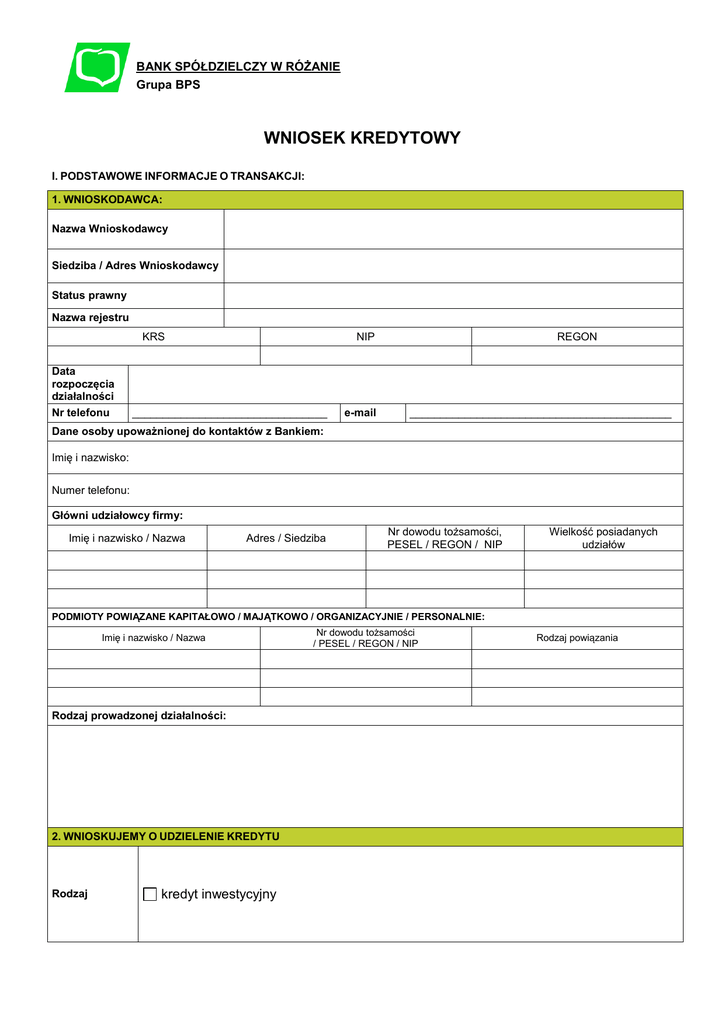 BANK SPÓŁDZIELCZY W RÓŻANIE Grupa BPS WNIOSEK KREDYTOWY I. PODSTAWOWE INFORMACJE O TRANSAKCJI: 1. WNIOSKODAWCA: Nazwa Wnioskodawcy Siedziba / Adres Wnioskodawcy Status prawny Nazwa rejestru KRS Data rozpoczęcia działalności Nr telefonu NIP ________________________________ e-mail REGON ___________________________________________ Dane osoby upoważnionej do kontaktów z Bankiem: Imię i nazwisko: Numer telefonu: Główni udziałowcy firmy: Imię i nazwisko / Nazwa Adres / Siedziba Nr dowodu tożsamości, PESEL / REGON / NIP Wielkość posiadanych udziałów PODMIOTY POWIĄZANE KAPITAŁOWO / MAJĄTKOWO / ORGANIZACYJNIE / PERSONALNIE: Imię i nazwisko / Nazwa Rodzaj prowadzonej działalności: 2. WNIOSKUJEMY O UDZIELENIE KREDYTU Rodzaj kredyt inwestycyjny Nr dowodu tożsamości / PESEL / REGON / NIP Rodzaj powiązania Kwota Waluta PLN Słownie Okres kredytowania od ______________________________ do _____________________________ Karencja* _____________________ miesięcy /dzień/miesiąc/rok/ /dzień/miesiąc/rok/ Kwota Przeznaczenie kredytu Całkowity koszt przedsięwzięcia: w walucie inwestycji ________________________________________________________________________________________ w PLN ________________________________________________________________________________________ (kwota i waluta) ( wg kursu średniego NBP z ostatniego dnia miesiąca poprzedzającego złożenie wniosku) Dotychczas poniesione nakłady Krótka charakterystyka przedsięwzięcia: (np. cykl realizacji, termin rozpoczęcia i zakończenia, rodzaje zakupów, itp.) TERMIN ROZPOCZĘCIA INWESTYCJI (MIESIĄC/ROK) TERMIN ZAKOŃCZENIA INWESTYCJI (MIESIĄC/ROK) TERMIN ODDANIA DO EKSPLOATACJI (MIESIĄC/ROK) TERMIN OSIĄGNIĘCIA PLANOWANEJ ZDOLNOŚCI PRODUKCYJNEJ (MIESIĄC/ROK) Środki własne: Kredyty bankowe Pozostałe środki Strona 2 z 6 3. TERMINY URUCHOMIENIA TRANSZ KREDYTU: w dniu/od dnia* kwota w dniu/od dnia* kwota w dniu/od dnia* kwota 4. SPŁATA KREDYTU: Okres spłaty od ______________________________ do _____________________________ Spłata kredytu następować będzie z /dzień/miesiąc/rok/ /dzień/miesiąc/rok/ rachunku bieżącego rachunku pomocniczego płatność przelewem lub gotówkową na rachunek kredytu Terminy spłaty: 1. w dniu/od dnia* do kwoty 2. w dniu/od dnia* do kwoty 3. w dniu/od dnia* do kwoty 4. w dniu/od dnia* do kwoty 5. SPŁATA ODSETEK: Termin spłaty ___________________________________________________________ 6. PROPONOWANE ZABEZPIECZENIE: Rodzaj zabezpieczenia Właściciel przedmiotu zabezpieczenia Wartość zabezpieczenia Oszacowanie wartości na podstawie: (polisa, wycena, faktura) III. Oświadczenia Wnioskodawcy 1) Oświadczam/y, że posiadam/y nie posiadam/y* zaległości wobec Zakładu Ubezpieczeń Społecznych i Urzędu Skarbowego objętych / nie objętych ugodą*. 2) Oświadczam/y, że posiadamy/ nie posiadamy* zaległości wobec innych banków lub towarzystw leasingowych. 3) Oświadczam/y, że wobec nas toczą się/ nie toczą się* lub grożą / nie grożą* nam postępowania sądowe, administracyjne i inne mogące mieć wpływ na prowadzoną działalność lub zdolność do spłaty zaciągniętych zobowiązań. 4) Oświadczam/y, że została/ nie została* ogłoszona upadłość lub został / nie został* rozpoczęty proces likwidacji lub naprawczego lub zawieszenia działalności firmy. 5) Oświadczamy, że w okresie ostatnich 12 m-cy zostały / nie zostały* wystawione lub wygasły / nie wygasły* przekraczającej 1.000 PLN. postępowania tytuły egzekucyjne w kwocie 6) Oświadczam, że pozostaję / nie pozostaję* we wspólności majątkowej ze współmałżonkiem/współmałżonką** 7) Oświadczam/y, że jesteśmy/ nie jesteśmy* udziałowcami Banku Spółdzielczego w Różanie. 8) Oświadczam/y, że następujące podmioty lub osoby powiązane, organizacyjnie, personalnie są / nie są* udziałowcami Banku Spółdzielczego w Różanie lub osobami zajmującymi w Banku kierownicze stanowiska lub funkcje w radzie nadzorczej lub w zarządzie Banku. 9) Oświadczam/y pod rygorem odpowiedzialności karnej przewidzianej w art. 297 § 1 Kodeksu karnego, że informacje podane w tym wniosku są zgodne ze stanem faktycznym. Strona 3 z 6 IV. Zgody Wnioskodawcy § 1. (stosuje się w przypadku Klientów nie będących os. fiz.)* 1. Oświadczam, że dobrowolnie wyrażam zgodę/nie wyrażam zgody* na przesyłanie informacji handlowej za pomocą środków komunikacji elektronicznej w rozumieniu ustawy o świadczeniu usług drogą elektroniczną z dnia 18 lipca 2002 r. (tj. Dz. U. 2014r. poz. 1422) w tym celu wskazuje adres poczty elektronicznej:……………………..………… 2. Oświadczam, że dobrowolnie wyrażam zgodę/ nie wyraża zgody* na wykorzystanie podanych we wniosku kredytowym danych teleadresowych w celu marketingu bezpośredniego Banku przy użyciu telekomunikacyjnych urządzeń końcowych (telefon, sms, Internet) oraz automatycznych systemów wywołujących, polegającego na otrzymywaniu informacji handlowych o produktach i usługach oferowanych przez Bank, w tym także po wygaśnięciu/ rozwiązaniu Umowy w rozumieniu ustawy z dnia 16 lipca 2004r. Prawo telekomunikacyjne (Dz. U. z 2014r., poz. 243 z późn. zm.). (stosuje się w przypadku Klientów będących os. fiz. prowadzącymi działalność gosp., wykonującymi wolny zawód, wspólnikami s.c.)* W związku ze złożonym przez mnie wnioskiem o udzielenie kredytu, oświadczam co następuję: 1. Przyjmuję do wiadomości i akceptuję informację Banku Spółdzielczego w Różanie że: 1) Bank Spółdzielczy w Różanie, przy ul Wileńska 2 będzie administratorem moich danych osobowych w rozumieniu ustawy z dnia 29 sierpnia 1997 r. o ochronie danych osobowych (Dz. U. z 2014 r., poz. 1182, z późn. zm.); 2) dane te przetwarzane będą przez Bank Spółdzielczy w Różanie w celu rozpatrzenia niniejszego wniosku oraz zawarcia i realizacji umowy kredytu, a także w celach określonych w art. 23 ust. 1 pkt 5 ustawy o