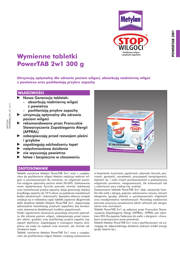 POWERTAB 2W1 Metylan PowerTAB 2w1 Wymienne tabletki PowerTAB 2w1 300 g METYLAN POWERTAB_2W1_KT_12.11 Utrzymują optymalny dla zdrowia poziom wilgoci, absorbują nadmierną wilgoć z powietrza oraz pochłaniają przykre zapachy WŁAŚCIWOŚCI Nowa Generacja tabletek: - absorbują nadmierną wilgoć z powietrza - pochłaniają przykre zapachy utrzymują optymalny dla zdrowia poziom wilgoci rekomendowane przez Francuskie Stowarzyszenie Zapobiegania Alergii (AFPRAL) zabezpieczają przed rozwojem pleśni i grzybów zapobiegają odchodzeniu tapet natychmiastowe działanie nie wysuszają powietrza łatwe i bezpieczne w stosowaniu ZASTOSOWANIE Tabletki wymienne Metylan PowerTAB 2w1 wraz z urządzeniem do pochłaniania wilgoci Metylan redukują nadmiar wilgoci w pomieszczeniach do momentu, aż wilgotność powietrza osiągnie optymalny poziom około 50-60%. Zastosowana nowa opatentowana formuła pozwala również redukować oraz neutralizować przykre zapachy, dając gwarancję redukcji brzydkiego zapachu do 70 % (dane na podstawie niezależnych badań jakościowych i ilościowych). Specjalny aktywny związek znajduje się w niebieskiej części tabletki zapewnia długotrwały efekt działania tabletki Metylan PowerTAB 2w1, zapewniając jednocześnie neutralizację przykrych zapachów, bez konieczności stosowania dodatkowych środków zapachowych. Dzięki regularnemu stosowaniu pozwalają utrzymać optymalny dla zdrowia poziom wilgoci, zabezpieczają przed rozwojem pleśni, grzybów oraz pochłaniają przykre zapachy (np. zapach stęchlizny). Zapobiegają w znaczącym stopniu skraplaniu się wody na szybach oraz ścianach, jak również odchodzeniu tapet. Tabletki wymienne Metylan PowerTAB 2w1 wraz z urządzeniem do pochłaniania wilgoci Metylan znajdują zastosowanie w łazienkach, kuchniach, sypialniach, salonach, biurach, piwnicach, garażach, warsztatach, przyczepach kempingowych, łodziach itp. i wielu innych pomieszczeniach o podwyższonej wilgotności powietrza, nieogrzewanych, źle izolowanych lub z nadmiarem pary wodnej (np. pralnie). Zastosowanie tabletek PowerTAB 2w1 daje rzeczywisty komfort dla osób z alergią, poprzez redukowanie rozwoju różnych alergenów (grzyby, pleśnie) w pomieszczeniach wilgotnych oraz nieodpowiednio wentylowanych. Pozwalają zredukować pierwsze przyczyny powstawania takich schorzeń jak alergia, astma oraz reumatyzm. Tabletki PowerTAB 2w1 są zalecane przez Francuskie Stowarzyszenie Zapobiegania Alergii (AFPRAL). AFPRAL jest członkiem EFA (Europejska Federacja do walki z alergiami i chorobami przenoszonymi przez powietrze). Tabletki Metylan PowerTAB 2w1 wraz z pochłaniaczem nie wymagają do odpowiedniego działania żadnych źródeł energii (prąd, baterie itp.). 1 UWAGA Nowa technologia z ultraaktywnymi kryształami soli w tabletkach PowerTAB 2w1, natychmiast redukuje nadmiar wilgoci w pomieszczeniu oraz pozwala zredukować przykre zapachy. Zamienia zebraną wilgoć w niebieski płynny roztwór soli, który następnie skrapla się w zbiorniku, umożliwiając przy tym bezpieczne (ochrona przed rozlaniem roztworu) opróżnienie zbiornika. Pierwsza kropla w pojemniku pojawia się po około 24 godzinach od momentu zastosowania pochłaniacza. Jedna tabletka PowerTAB 2w1 300 g wystarcza na około 2-3 miesiące w pomieszczeniach o powierzchni do 10 m² (25 m³) – w zależności od wilgotności powietrza oraz temperatury pomieszczenia. Poniżej znajduje się tabela pokazująca okres działania 1 tabletki PowerTAB 2w1. Higrometria (Wilgotność powietrza w %) Czas działania* 1 tabletki Metylan PowerTAB 2w1 w pomieszczenie 10 m2* * w zależności od poziomu wilgotności i temperatury pomieszczenia Temperatura poniżej 15°C Temperatura powyżej 15°C Poniżej 65% około 3-4 miesięcy około 2-3 miesięcy Powyżej 65% około 2 miesięcy około 1,5 miesięcy W przypadku większych pomieszczeń niż 10 m², należy zastosować więcej niż jedno urządzenie lub Metylan Pochłaniacz wilgoci 450 g. W przypadku mniejszego pomieszczenia czas działania wydłuży się. System Metylan PowerTAB 2w1 w pierwszym miesiącu pochłania więcej niż standardowe pochłaniacze wilgoci z wymiennymi wkładami. Tabletki Metylan PowerTAB 2w1 nadają się również do większości pochłaniaczy wilgoci dostępnych na rynku. INSTRUKCJA STOSOWANIA 1. Należy otworzyć saszetkę z tabletką Metylan PowerTAB 2w1, unikając kontaktu ze skórą. Zalecane jest stosowanie rękawiczek gumowych. 2. Umieścić tabletkę Metylan PowerTAB 2w1 w obudowie. 3. Po umieszczeniu tabletki jest w obudowie, należy zamknąć górną pokrywę. 4. W przypadku, kiedy tabletka PowerTAB 2w1 skropli się w całości, należy opróżnić zbiornik. W tym celu należy zdjąć zatyczkę z boku pochłaniacza i wylać powstały płyn do toalety. Ewentualne pozostałości tabletki Metylan PowerTAB 2w1 można usunąć poprzez dokładne płukanie pochłaniacza w ciepłej wodzie. Po zastosowaniu należy umyć ręce. W przypadku nagłego wzrostu temperatury lub w przypadku nagłego spadku wilgoci, płynny roztwór soli zebrany w zbiorniku może ulec zgęstnieniu lub nawet skrystalizowaniu. Zjawisko to jest normalne i wpływa niekorzystnie na działanie pochłaniacza. Henkel Polska Sp. z o.o. Należy unikać kontaktu PowerTAB 2w1 lub płynnego roztworu z powierzchniami złotymi, chromowanymi, skórzanymi, tkaninami, dywanami i innymi wykładzinami dywanowymi. W przypadku kontaktu, należy umyć ciepłą wodą z amoniakiem i następnie dokładnie wypłukać. Należy stosować w temperaturze powyżej +10°C. Działa drażniąco na oczy, nie wdychać pyłu. Unikać zanieczyszczenia skóry i oczu. Zanieczyszczone oczy przemyć natychmiast dużą ilością wody i zasięgnąć porady lekarza – pokaż opakowanie lub etykietę. Chronić przed dziećmi! ZALECENIA Producent gwarantuje jakość wyrobu, natomiast nie ma wpływu na warunki i sposób jego użycia. W przypadku wątpliwości należy wykonać własne próby stosowania