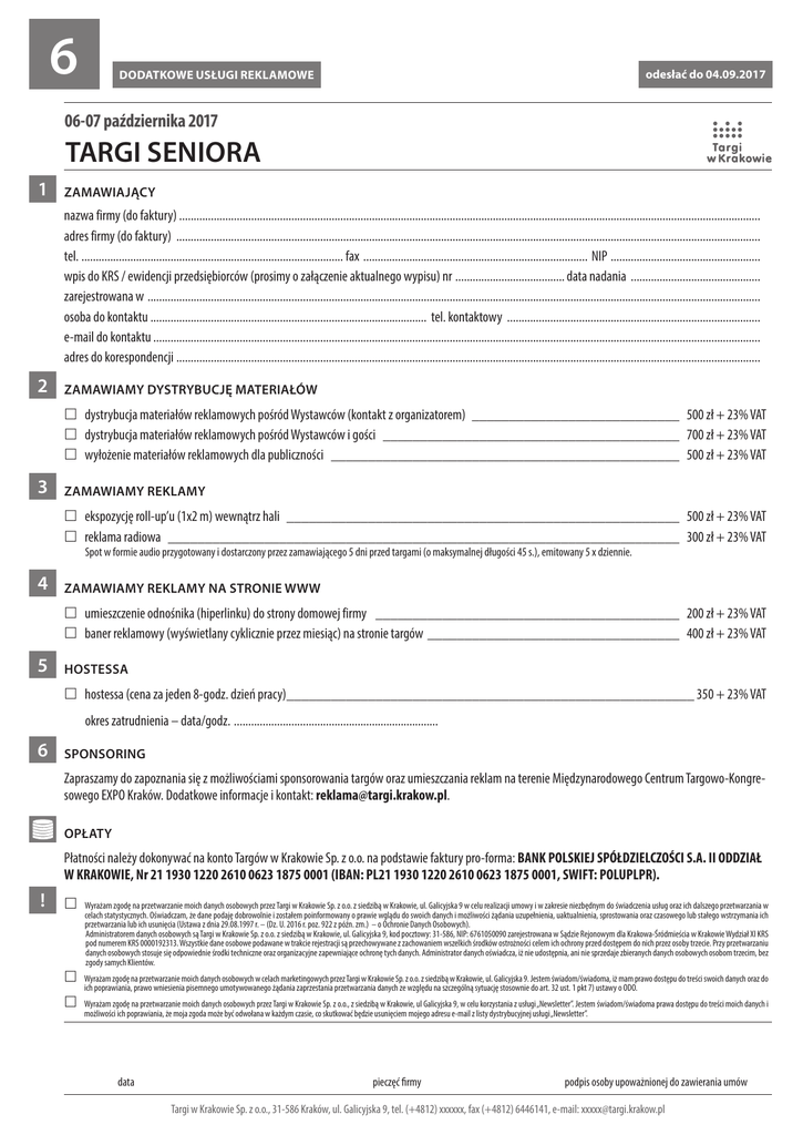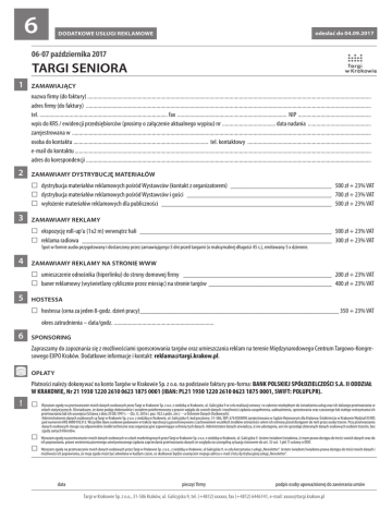6 odesłać do 04.09.2017 DODATKOWE USŁUGI REKLAMOWE 06-07 października 2017 TARGI SENIORA 1 ZAMAWIAJĄCY nazwa firmy (do faktury) ........................................................................................................................................................................................................... adres firmy (do faktury) ............................................................................................................................................................................................................ tel. ............................................................................................ fax ............................................................................... NIP ..................................................... wpis do KRS / ewidencji przedsiębiorców (prosimy o załączenie aktualnego wypisu) nr ....................................... data nadania ............................................. zarejestrowana w ...................................................................................................................................................................................................................... osoba do kontaktu ................................................................................................. tel. kontaktowy ......................................................................................... e-mail do kontaktu ................................................................................................................................................................................................................... adres do korespondencji ............................................................................................................................................................................................................ 2 ZAMAWIAMY DYSTRYBUCJĘ MATERIAŁÓW ££ dystrybucja materiałów reklamowych pośród Wystawców (kontakt z organizatorem) _____________________________ 500 zł + 23% VAT ££ dystrybucja materiałów reklamowych pośród Wystawców i gości _________________________________________ 700 zł + 23% VAT ££ wyłożenie materiałów reklamowych dla publiczności ________________________________________________ 500 zł + 23% VAT 3 ZAMAWIAMY REKLAMY ££ ekspozycję roll-up’u (1x2 m) wewnątrz hali ______________________________________________________ 500 zł + 23% VAT ££ reklama radiowa ______________________________________________________________________ 300 zł + 23% VAT Spot w formie audio przygotowany i dostarczony przez zamawiającego 5 dni przed targami (o maksymalnej długości 45 s.), emitowany 5 x dziennie. 4 ZAMAWIAMY REKLAMY NA STRONIE WWW ££ umieszczenie odnośnika (hiperlinku) do strony domowej firmy __________________________________________ 200 zł + 23% VAT ££ baner reklamowy (wyświetlany cyklicznie przez miesiąc) na stronie targów ___________________________________ 400 zł + 23% VAT 5 HOSTESSA ££ hostessa (cena za jeden 8-godz. dzień pracy)________________________________________________________ 350 + 23% VAT okres zatrudnienia – data/godz. ........................................................................ 6 SPONSORING Zapraszamy do zapoznania się z możliwościami sponsorowania targów oraz umieszczania reklam na terenie Międzynarodowego Centrum Targowo-Kongresowego EXPO Kraków. Dodatkowe informacje i kontakt: [email protected]. OPŁATY Płatności należy dokonywać na konto Targów w Krakowie Sp. z o.o. na podstawie faktury pro-forma: BANK POLSKIEJ SPÓŁDZIELCZOŚCI S.A. II ODDZIAŁ W KRAKOWIE, Nr 21 1930 1220 2610 0623 1875 0001 (IBAN: PL21 1930 1220 2610 0623 1875 0001, SWIFT: POLUPLPR). ! ££ Wyrażam zgodę na przetwarzanie moich danych osobowych przez Targi w Krakowie Sp. z o.o. z siedzibą w Krakowie, ul. Galicyjska 9 w celu realizacji umowy i w zakresie niezbędnym do świadczenia usług oraz ich dalszego przetwarzania w celach statystycznych. Oświadczam, że dane podaję dobrowolnie i zostałem poinformowany o prawie wglądu do swoich danych i możliwości żądania uzupełnienia, uaktualnienia, sprostowania oraz czasowego lub stałego wstrzymania ich przetwarzania lub ich usunięcia (Ustawa z dnia 29.08.1997 r. – (Dz. U. 2016 r. poz. 922 z późn. zm.) – o Ochronie Danych Osobowych). Administratorem danych osobowych są Targi w Krakowie Sp. z o.o. z siedzibą w Krakowie, ul. Galicyjska 9, kod pocztowy: 31-586, NIP: 6761050090 zarejestrowana w Sądzie Rejonowym dla Krakowa-Śródmieścia w Krakowie Wydział XI KRS pod numerem KRS 0000192313. Wszystkie dane osobowe podawane w trakcie rejestracji są przechowywane z zachowaniem wszelkich środków ostrożności celem ich ochrony przed dostępem do nich przez osoby trzecie. Przy przetwarzaniu danych osobowych stosuje się odpowiednie środki techniczne oraz organizacyjne zapewniające ochronę tych danych. Administrator danych oświadcza, iż nie udostępnia, ani nie sprzedaje zbieranych danych osobowych osobom trzecim, bez zgody samych Klientów. ££ Wyrażam zgodę na przetwarzanie moich danych osobowych w celach marketingowych przez Targi w Krakowie Sp. z o.o. z siedzibą w Krakowie, ul. Galicyjska 9. Jestem świadom/świadoma, iż mam prawo dostępu do treści swoich danych oraz do ich poprawiania, prawo wniesienia pisemnego umotywowanego żądania zaprzestania przetwarzania danych ze względu na szczególną sytuację stosownie do art. 32 ust. 1 pkt 7) ustawy o ODO. ££ Wyrażam zgodę na przetwarzanie moich danych osobowych przez Targi w Krakowie Sp. z o.o., z siedzibą w Krakowie, ul Galicyjska 9, w celu korzystania z usługi „Newsletter”. Jestem świadom/świadoma prawa dostępu do treści moich danych i możliwości ich poprawiania, że moja zgoda może być odwołana w każdym czasie, co skutkować będzie usunięciem mojego adresu e-mail z listy dystrybucyjnej usługi „Newsletter”. data p