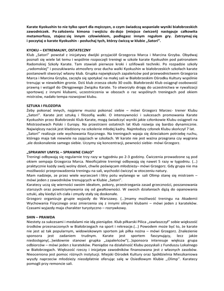 Karate Kyokushin to nie tylko sport dla mężczyzn, o czym świadczą wspaniałe wyniki białobrzeskich zawodniczek. Po założeniu kimona i wejściu do dojo (miejsce ćwiczeń) następuje całkowita metamorfoza, stajesz się innym człowiekiem, podlegasz innym regułom gry. Zatrzymaj się i poczytaj o karate Kyokushin - posłuchaj tych, którzy ćwiczą w klubie „Satori”. KYOKU – EXTREMALNY, OSTATECZNY Klub „Satori” powstał z inicjatywy dwójki przyjaciół Grzegorza Marca i Marcina Grzyba. Obydwaj poznali się wiele lat temu i wspólnie rozpoczęli treningi w szkole karate Kyokushin pod patronatem Radomskiej Szkoły Karate. Tam stawiali pierwsze kroki i szlifowali techniki. Po rozpadzie szkoły „radomskiej” i poszukiwaniu atmosfery oraz ducha walki Kyokushin w białobrzeskich szkołach karate postanowili stworzyć własny klub. Grupka największych zapaleńców pod przewodnictwem Grzegorza Marca i Marcina Grzyba, zaczęła się spotykać na małej sali w Białobrzeskim Ośrodku Kultury wspólnie trenując w niewielkim gronie. Dziś klub zrzesza około 30 osób. Białobrzeski Klub osiągnął osobowość prawną i wstąpił do Okręgowego Związku Karate. To otworzyło drogę do uczestnictwa w rywalizacji sportowej z innymi klubami, uczestniczenia w obozach o raz wspólnych treningach pod okiem mistrzów, nadało tempa rozwojowi klubu. SZTUKA I FILOZOFIA Żeby pokonać innych, najpierw musisz pokonać siebie – mówi Grzegorz Marzec- trener Klubu „Satori”. Karate jest sztuką i filozofią walki. O intensywności i sukcesach promowania Karate Kyokushin przez Białobrzeski Klub Karate, mogą świadczyć wyniki jakie członkowie Klubu osiągneli na Mistrzostwach Polski i Europy. Na przestrzeni ostatnich lat Klub rozwija się bardzo dynamicznie. Największy nacisk jest kładziony na szkolenie młodej kadry. Najmłodszy członek Klubu skończył 7 lat. „Satori” realizuje cele wychowania fizycznego. Na treningach wpaja się dzieciakom potrzebę ruchu, którego maja tak niewiele na zajęciach w szkołach. W karate nie jest ważna przegrana czy wygrana ,ale doskonalenie samego siebie. Uczymy się koncentracji, pewności siebie- mówi Grzegorz. „SPRAWNY UMYSŁ – SPRAWNE CIAŁO” Treningi odbywają się regularnie trzy razy w tygodniu po 2-3 godziny. Ćwiczenia prowadzone są pod okiem sempaja Grzegorza Marca. Nieoficjalnie treningi odbywają się nawet 5 razy w tygodniu. (…) praktycznie każdy swój wolny dzień, chwile poświęcam młodzieży– mówi Grzegorz. Gdy grupa nie ma możliwości przeprowadzenia treningu na sali, wychodzi ćwiczyć w otoczeniu natury. Mam nadzieje, ze przez wiele wyrzeczeń i litry potu wylanego w sali Olimp stanę się mistrzem – mówi jeden z zawodników trenujących w Klubie „Satori”. Karatecy uczą się wierności swoim ideałom, pokory, przestrzegania zasad grzeczności, poszanowania starszych oraz powstrzymywania się od gwałtowności. W swoich działaniach dążą do opanowania sztuki, aby kiedyś ich ciała i zmysły stały się doskonałe. Grzegorz organizuje grupie wyjazdy do Warszawy. (…)mamy możliwość treningu na Akademii Wychowania Fizycznego oraz zmierzenia się z innymi silnymi klubami – mówi jeden z karateków. Czasami wyjazdy maja charakter turystyczno – rozrywkowy. SHIN – PRAWDA Niestety za sukcesami i medalami nie idą pieniądze. Klub piłkarski Pilica „zawłaszczył” sobie większość środków przeznaczonych w Białobrzegach na sport i rekreacje.(…) Powodem może być to, że karate nie jest aż tak popularnym, widowiskowym sportem jak piłka nożna – mówi Grzegorz. Znalezienie sponsora jest zadaniem trudnym. Karate jest sportem fascynujący, lecz jakże niedostępny(…)widownie stanowi grupka „zapaleńców”(…)sponsora interesuje większa grupa odbiorców – mówi jeden z karateków. Pieniądze na działalność Klubu pozyskali z Funduszu Lokalnego w Białobrzegach. Większość rzeczy i inicjatyw zawodników finansowana jest z własnych zasobów. Nieoceniona jest pomoc różnych instytucji. Miejski Ośrodek Kultury oraz Spółdzielnia Mieszkaniowa wyszły naprzeciw młodzieży nieodpłatnie oferując salę w Osiedlowym Klubie ,,Olimp''. Karatecy pomogli przy remoncie sali. Większość dzieciaków jest w posiadaniu profesjonalnych strojów do treningu. Jest to wydatek niemały – 150zł jeden strój. Rodzice starają się aktywnie uczestniczyć w życiu klubu- podwożą na zawody, kibicują. Dorośli zawodnicy wraz z Grzegorzem obecnie adaptują pomieszczenie na siłownie. Będzie to alternatywa dla osób biorących sterydy oraz preferujących spędzanie czasu wolnego „pod blokiem”. Zjawisko jest to powszechne wśród dorastającej młodzieży. Media w Białobrzegach zaczęły dostrzegać sukcesy Klubu. W gazecie lokalnej znajdziemy kilka wzmianek o zdobytych medalach. Dzięki sukcesom na mistrzostwach Polski oraz Mistrzostwach Europy karatecy zapraszani są na różne imprezy w Polsce. Konrad i Filip – zawodnicy Klubu „Satori” zaprojektowali stroną internetową. Jeżeli chcesz poznać historie karate, zawodników oraz dowiedzieć się o aktualnych wydarzeniach w Klubie wejdź na stronę: kyokushinsatori.ovh.org. KAI – ZAWIĄZAĆ SIĘ, SPOTKAĆ SIĘ Największym marzeniem Karateków jest stworzenie klubu o mocnej pozycji, z odpowiednim zapleczem technicznym(…)Klubu, o którym będzie słychać w całej Polsce, (…) który będzie liczył 600 osób jak inne kluby np.: z Warszawy – mówi Grzegorz. Treningi Kyokushin i atmosfera dojo - tego trzeba doświadczyć, to trzeba przeżyć. Uwierz w siebie - zaanimuj swój klub karate Kyokushin! KONTAKT Białobrzeski Klub Kyokushin Karate "Satori" ul. Żeromskiego 72a/12 26-800 Białobrzegi [email protected] www.kyokushinsatori.ovh.org.