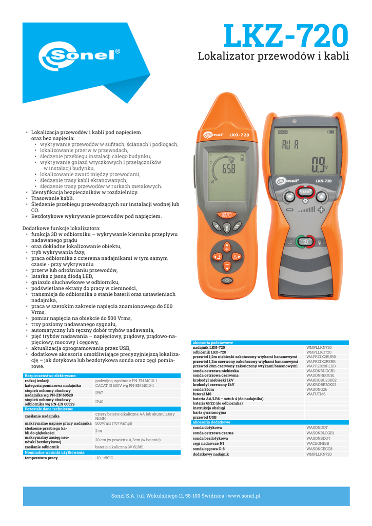 LKZ-720 Lokalizator przewodów i kabli • Lokalizacja przewodów i kabli pod napięciem oraz bez napięcia: • wykrywanie przewodów w sufitach, ścianach i podłogach, • lokalizowanie przerw w przewodach, • śledzenie przebiegu instalacji całego budynku, • wykrywanie gniazd wtyczkowych i przełączników w instalacji budynku, • lokalizowanie zwarć między przewodami, • śledzenie trasy kabli ekranowanych, • śledzenie trasy przewodów w rurkach metalowych. • Identyfikacja bezpieczników w rozdzielnicy. • Trasowanie kabli. • Śledzenie przebiegu przewodzących rur instalacji wodnej lub CO. • Bezdotykowe wykrywanie przewodów pod napięciem. Dodatkowe funkcje lokalizatora: • funkcja 3D w odbiorniku – wykrywanie kierunku przepływu nadawanego prądu • oraz dokładne lokalizowanie obiektu, • tryb wykrywania fazy, • praca odbiornika z czterema nadajnikami w tym samym czasie - przy wykrywaniu • przerw lub odróżnianiu przewodów, • latarka z jasną diodą LED, • gniazdo słuchawkowe w odbiorniku, • podświetlane ekrany do pracy w ciemności, • transmisja do odbiornika o stanie baterii oraz ustawieniach nadajnika, • praca w szerokim zakresie napięcia znamionowego do 500 Vrms, • pomiar napięcia na obiekcie do 500 Vrms, • trzy poziomy nadawanego sygnału, • automatyczny lub ręczny dobór trybów nadawania, • pięć trybów nadawania – napięciowy, prądowy, prądowo-napięciowy, mocowy i cęgowy, • aktualizacja oprogramowania przez USB, • dodatkowe akcesoria umożliwiające precyzyjniejszą lokalizację – jak dotykowa lub bezdotykowa sonda oraz cęgi pomiarowe. Bezpieczeństwo elektryczne: rodzaj izolacji kategoria pomiarowa nadajnika stopień ochrony obudowy nadajnika wg PN-EN 60529 stopień ochrony obudowy odbiornika wg PN-EN 60529 Pozostałe dane techniczne: zasilanie nadajnika maksymalne napięie pracy nadajnika śledzenie przebiegu kabli do głębokości maksymalny zasięg neonówki bezdotykowej zasilanie odbiornik Nominalne warunki użytkowania: temperatura pracy podwójna, zgodnie z PN-EN 61010-1 CACAT III 600V wg PN-EN 61010-1 IP67 IP40 cztery baterie alkaliczne AA lub akumulatory NiMH 500Vrms (707Vampl) 2m 20 cm (w powietrzu), 3cm (w betonie) bateria alkaliczna 9V 6LR61 -10...+50°C akcesoria podstawowe nadajnik LKN-720 odbiornik LKO-720 przewód 1,2m niebieski zakończony wtykami bananowymi przewód 1,2m czerwony zakończony wtykami bananowymi przewód 20m czerwony zakończony wtykami bananowymi sonda ostrzowa niebieska sonda ostrzowa czerwona krokodyl niebieski 1kV krokodyl czerwony 1kV sonda 26cm futerał M6 bateria AA/LR6 – sztuk 4 (do nadajnika) bateria 6F22 (do odbiornika) instrukcja obsługi karta gwarancyjna przewód USB akcesoria dodatkowe sonda dotykowa sonda ostrzowa czarna sonda bezdotykowa cęgi nadawcze N1 sonda cęgowa C-8 dodatkowy nadajnik Sonel S.A. | ul. Wokulskiego 11, 58-100 Świdnica | www.sonel.pl WMPLLKN720 WMPLLKO720 WAPRZ1X2BUBB WAPRZ1X2REBB WAPRZ020REBB WASONBUOGB1 WASONREOGB1 WAKROBU20K02 WAKRORE20K02 WASONG26 WAFUTM6 WASONDOT WASONBLOGB1 WASONBDOT WACEGN1BB WASONCEGC8 WMPLLKN720