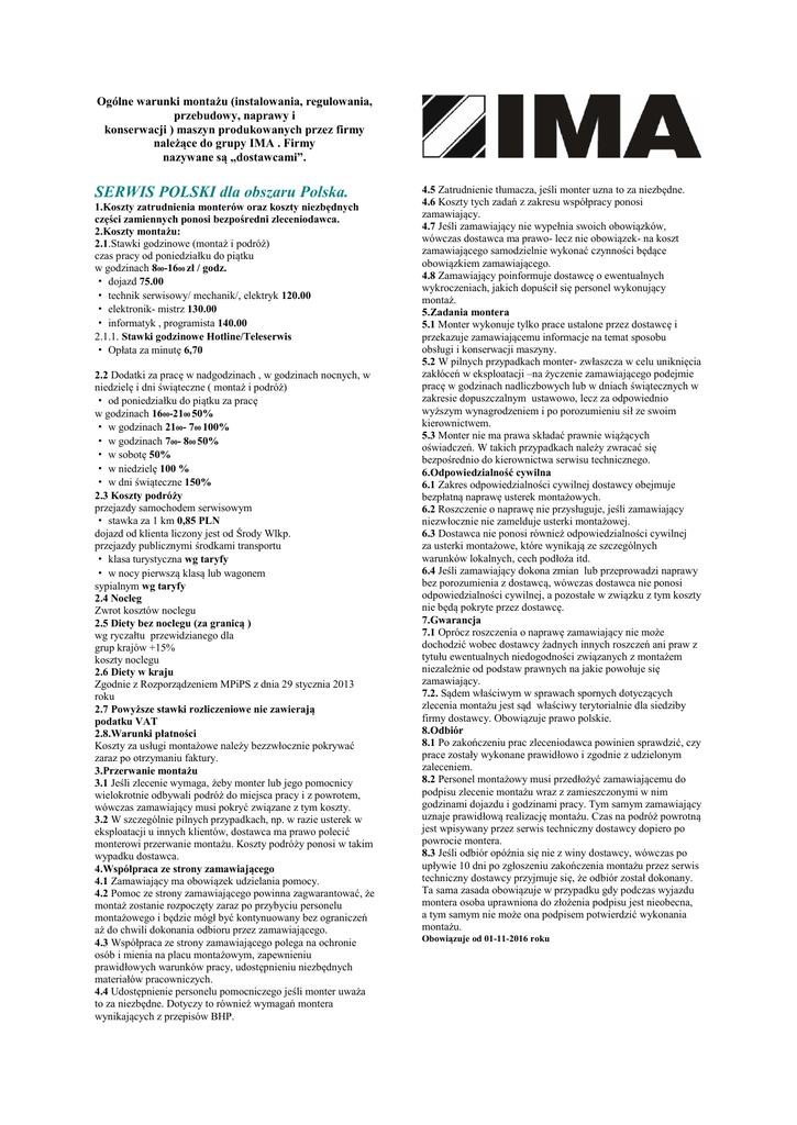 Ogólne warunki montażu (instalowania, regulowania, przebudowy, naprawy i konserwacji ) maszyn produkowanych przez firmy należące do grupy IMA . Firmy nazywane są „dostawcami”. SERWIS POLSKI dla obszaru Polska. 1.Koszty zatrudnienia monterów oraz koszty niezbędnych części zamiennych ponosi bezpośredni zleceniodawca. 2.Koszty montażu: 2.1.Stawki godzinowe (montaż i podróż) czas pracy od poniedziałku do piątku w godzinach 800-1600 zł / godz. ·dojazd 75.00 ·technik serwisowy/ mechanik/, elektryk 120.00 ·elektronik- mistrz 130.00 ·informatyk , programista 140.00 Stawki godzinowe Hotline/Teleserwis ·Opłata za minutę 6,70 2.2 Dodatki za pracę w nadgodzinach , w godzinach nocnych, w niedzielę i dni świąteczne ( montaż i podróż) ·od poniedziałku do piątku za pracę w godzinach 1600-2100 50% ·w godzinach 2100- 700 100% ·w godzinach 700- 800 50% ·w sobotę 50% ·w niedzielę 100 % ·w dni świąteczne 150% 2.3 Koszty podróży przejazdy samochodem serwisowym ·stawka za 1 km 0,85 PLN dojazd od klienta liczony jest od Środy Wlkp. przejazdy publicznymi środkami transportu ·klasa turystyczna wg taryfy ·w nocy pierwszą klasą lub wagonem sypialnym wg taryfy 2.4 Nocleg Zwrot kosztów noclegu 2.5 Diety bez noclegu (za granicą ) wg ryczałtu przewidzianego dla grup krajów +15% koszty noclegu 2.6 Diety w kraju Zgodnie z Rozporządzeniem MPiPS z dnia 29 stycznia 2013 roku 2.7 Powyższe stawki rozliczeniowe nie zawierają podatku VAT 2.8.Warunki płatności Koszty za usługi montażowe należy bezzwłocznie pokrywać zaraz po otrzymaniu faktury. 3.Przerwanie montażu 3.1 Jeśli zlecenie wymaga, żeby monter lub jego pomocnicy wielokrotnie odbywali podróż do miejsca pracy i z powrotem, wówczas zamawiający musi pokryć związane z tym koszty. 3.2 W szczególnie pilnych przypadkach, np. w razie usterek w eksploatacji u innych klientów, dostawca ma prawo polecić monterowi przerwanie montażu. Koszty podróży ponosi w takim wypadku dostawca. 4.Współpraca ze strony zamawiającego 4.1 Zamawiający ma obowiązek udzielania pomocy. 4.2 Pomoc ze strony zamawiającego powinna zagwarantować, że montaż zostanie rozpoczęty zaraz po przybyciu personelu montażowego i będzie mógł być kontynuowany bez ograniczeń aż do chwili dokonania odbioru przez zamawiającego. 4.3 Współpraca ze strony zamawiającego polega na ochronie osób i mienia na placu montażowym, zapewnieniu prawidłowych warunków pracy, udostępnieniu niezbędnych materiałów pracowniczych. 4.4 Udostępnienie personelu pomocniczego jeśli monter uważa to za niezbędne. Dotyczy to również wymagań montera wynikających z przepisów BHP. 4.5 Zatrudnienie tłumacza, jeśli monter uzna to za niezbędne. 4.6 Koszty tych zadań z zakresu współpracy ponosi zamawiający. 4.7 Jeśli zamawiający nie wypełnia swoich obowiązków, wówczas dostawca ma prawo- lecz nie obowiązek- na koszt zamawiającego samodzielnie wykonać czynności będące obowiązkiem zamawiającego. 4.8 Zamawiający poinformuje dostawcę o ewentualnych wykroczeniach, jakich dopuścił się personel wykonujący montaż. 5.Zadania montera 5.1 Monter wykonuje tylko prace ustalone przez dostawcę i przekazuje zamawiającemu informacje na temat sposobu obsługi i konserwacji maszyny. 5.2 W pilnych przypadkach monter- zwłaszcza w celu uniknięcia zakłóceń w eksploatacji –na życzenie zamawiającego podejmie pracę w godzinach nadliczbowych lub w dniach świątecznych w zakresie dopuszczalnym ustawowo, lecz za odpowiednio wyższym wynagrodzeniem i po porozumieniu sił ze swoim kierownictwem. 5.3 Monter nie ma prawa składać prawnie wiążących oświadczeń. W takich przypadkach należy zwracać się bezpośrednio do kierownictwa serwisu technicznego. 6.Odpowiedzialność cywilna 6.1 Zakres odpowiedzialności cywilnej dostawcy obejmuje bezpłatną naprawę usterek montażowych. 6.2 Roszczenie o naprawę nie przysługuje, jeśli zamawiający niezwłocznie nie zamelduje usterki montażowej. 6.3 Dostawca nie ponosi również odpowiedzialności cywilnej za usterki montażowe, które wynikają ze szczególnych warunków lokalnych, cech podłoża itd. 6.4 Jeśli zamawiający dokona zmian lub przeprowadzi naprawy bez porozumienia z dostawcą, wówczas dostawca nie ponosi odpowiedzialności cywilnej, a pozostałe w związku z tym koszty nie będą pokryte przez dostawcę. 7.Gwarancja 7.1 Oprócz roszczenia o naprawę zamawiający nie może dochodzić wobec dostawcy żadnych innych roszczeń ani praw z tytułu ewentualnych niedogodności związanych z montażem niezależnie od podstaw prawnych na jakie powołuje się zamawiający. 7.2. Sądem właściwym w sprawach spornych dotyczących zlecenia montażu jest sąd właściwy terytorialnie dla siedziby firmy dostawcy. Obowiązuje prawo polskie. 8.Odbiór 8.1 Po zakończeniu prac zleceniodawca powinien sprawdzić, czy prace zostały wykonane prawidłowo i zgodnie z udzielonym zaleceniem. 8.2 Personel montażowy musi przedłożyć zamawiającemu do podpisu zlecenie montażu wraz z zamieszczonymi w nim godzinami dojazdu i godzinami pracy. Tym samym zamawiający uznaje prawidłową realizację montażu. Czas na podróż powrotną jest wpisywany przez serwis techniczny dostawcy dopiero po powrocie montera. 8.3 Jeśli odbiór opóźnia się nie z winy dostawcy, wówczas po upływie 10 dni po zgłoszeniu zakończenia montażu przez serwis techniczny dostawcy przyjmuje się, że odbiór został dokonany. Ta sama zasada obowiązuje w przypadku gdy podczas wyjazdu montera osoba uprawniona do złożenia podpisu jest nieobecna, a tym samym nie może ona podpisem potwierdzić wykonania montażu. Obowiązuje od 01-11-2016 roku