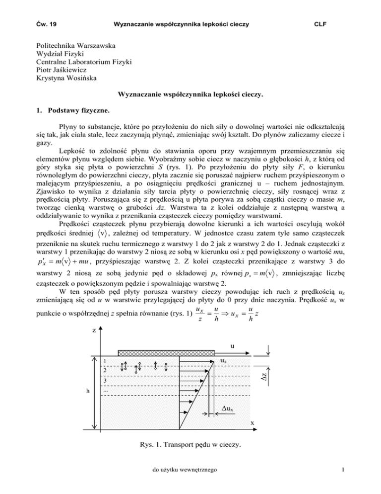 Ćw. 19 Wyznaczanie współczynnika lepkości cieczy CLF Politechnika Warszawska Wydział Fizyki Centralne Laboratorium Fizyki Piotr Jaśkiewicz Krystyna Wosińska Wyznaczanie współczynnika lepkości cieczy. 1. Podstawy fizyczne. Płyny to substancje, które po przyłożeniu do nich siły o dowolnej wartości nie odkształcają się tak, jak ciała stałe, lecz zaczynają płynąć, zmieniając swój kształt. Do płynów zaliczamy ciecze i gazy. Lepkość to zdolność płynu do stawiania oporu przy wzajemnym przemieszczaniu się elementów płynu względem siebie. Wyobraźmy sobie ciecz w naczyniu o głębokości h, z którą od góry styka się płyta o powierzchni S (rys. 1). Po przyłożeniu do płyty siły F, o kierunku równoległym do powierzchni cieczy, płyta zacznie się poruszać najpierw ruchem przyśpieszonym o malejącym przyśpieszeniu, a po osiągnięciu prędkości granicznej u – ruchem jednostajnym. Zjawisko to wynika z działania siły tarcia płyty o powierzchnię cieczy, siły rosnącej wraz z prędkością płyty. Poruszająca się z prędkością u płyta porywa za sobą cząstki cieczy o masie m, tworząc cienką warstwę o grubości Δz. Warstwa ta z kolei oddziałuje z następną warstwą a oddziaływanie to wynika z przenikania cząsteczek cieczy pomiędzy warstwami. Prędkości cząsteczek płynu przybierają dowolne kierunki a ich wartości oscylują wokół prędkości średniej v , zależnej od temperatury. W jednostce czasu zatem tyle samo cząsteczek przeniknie na skutek ruchu termicznego z warstwy 1 do 2 jak z warstwy 2 do 1. Jednak cząsteczki z warstwy 1 przenikając do warstwy 2 niosą ze sobą w kierunku osi x pęd powiększony o wartość mu, p ′x = m v + mu , przyśpieszając warstwę 2. Z kolei cząsteczki przenikające z warstwy 3 do warstwy 2 niosą ze sobą jedynie pęd o składowej px równej px = m v , zmniejszając liczbę cząsteczek o powiększonym pędzie i spowalniając warstwę 2. W ten sposób pęd płyty porusza warstwy cieczy powodując ich ruch z prędkością ux zmieniającą się od u w warstwie przylegającej do płyty do 0 przy dnie naczynia. Prędkość ux w u u u punkcie o współrzędnej z spełnia równanie (rys. 1) x = ⇒ u x = z h z h z u ux 1 Δz 2 3 h ... Δux x Rys. 1. Transport pędu w cieczy. do użytku wewnętrznego 1 Ćw. 19 Wyznaczanie współczynnika lepkości cieczy CLF Siła oporu doznawana przez płytę, czyli siła lepkości jest wprost proporcjonalna do powierzchni płyty S i do szybkości zmian prędkości warstw cieczy z odległością od płyty. Znak (-) wynika z faktu, że jest to siła hamująca zwrócona przeciwnie do prędkości: F = −η ⋅ S ⋅ ∂u x u = −η ⋅ S ⋅ ∂z h (1) gdzie współczynnik η oznacza dynamiczną lepkość płynu. ⎡ Ns ⎤ Jednostką lepkości jest zatem ⎢ 2 ⎥ lub [Pa ⋅ s] ⎣m ⎦ W miarę wzrostu gęstości płynu ρ i prędkości u oraz dla przypadków trójwymiarowych (np. kula zanurzona w płynie) zależności stają się bardzo skomplikowane. W przypadku trójwymiarowym zamiast o warstwach płynu mówimy o rurkach płynu, których kształt jest także trójwymiarowy. Opis ich zachowania wymaga zastosowania teorii chaosu. Szczególnym parametrem pozwalającym na przybliżone przewidywanie zachowania się rurek płynu jest liczba Reynolds’a, Re. Z zależności (1) wynika, że siła lepkości zależy od S prędkości płyty i parametru liniowego l = . Liczbę Reynolds’a definiujemy jako: h uρl Re = (2) η Dla małej prędkości u, małej gęstości płynu ρ i dużej jego lepkości η, Re << 1 a wtedy ruch płynu nazywamy laminarnym (bezwirowym). Gdy prędkość przepływu płynu lub prędkość ruchu ciała w nim zanurzonego przekroczy wartość krytyczną, kształt i rozmieszczenie przestrzenne rurek płynu z jednoznacznie dla danej prędkości określonego w czasie i przestrzeni zmienia się w układ wirów. Ruch płynu nazywamy wtedy turbulentnym. Rozważmy kulę o promieniu r i masie mk spadającą swobodnie w cieczy o gęstości ρc z prędkością v przy zachowaniu warunków przepływu laminarnego. Siłę oporu, zwaną siłą Stokesa, można przedstawić w postaci : FS = − αη v l (3) gdzie α oznacza współczynnik kształtu a l wymieniony wyżej parametr liniowy. Dla kuli α = 6π oraz l = r : F S = − 6 πη vr (4) Zależność ta nosi nazwę prawa Stokes’a. Na spadającą w cieczy kulkę działają trzy siły: siła grawitacji Q, wynikająca z prawa Archimedesa siła wyporu Fw oraz siła lepkości (oporu cieczy) FS (4): 4 (5) πr 3ρ c g 3 gdzie g oznacza wartość przyśpieszenia ziemskiego, ρc – gęstość cieczy, r – promień kulki, mk – masę kulki. Q = m k g; Fw = − do użytku wewnętrznego 2 Ćw. 19 Wyznaczanie współczynnika lepkości cieczy CLF FS FW Q Rys. 2. Siły działające na kulkę swobodnie spadającą w cieczy. Na kulkę działa zatem siła wypadkowa F = Q + Fw + FS a równanie ruchu kulki, zgodnie z drugą zasadą dynamiki można przedstawić w postaci: mk 4 dv = m k g − π r 3 ρ c g − 6πη r v 3 dt (6) FS rośnie wraz z prędkością kulki v aż do chwili, w której siły Q, Fw oraz FS zrównoważą się a wartość wypadkowej siły F będzie równa zeru. Rozwiązanie tego równania dla warunku początkowego v(t = 0) = 0 ma postać następującą: 6 πη r ⎛ − t ⎜ 2r g (ρ k − ρ c ) ⋅ ⎜ 1 − e m k v( t ) = 9η ⎜ ⎝ 2 ⎞ ⎟ ⎟ ⎟ ⎠ (7) gdzie ρk oznacza gęstość materiału, z którego wykonana jest kulka. Dla t → ∞, v(t) dąży do vgr: 6 πη r ⎛ ⎛ − t ⎜ 2 ⎜ m r g 2 (ρ k − ρ c ) ⋅ ⎜ 1 − e k v gr = lim ⎜ ⎜ t → ∞ ⎜ 9η ⎜ ⎜ ⎝ ⎝ ⎞⎞ ⎟⎟ 2 ⎟ ⎟ = 2 r g (ρ k − ρ c ) 9η ⎟⎟ ⎟⎟ ⎠⎠ (8) Zależność (8) została wyprowadzona dla przypadku nieograniczonej objętości cieczy. Jeżeli kulka porusza się wzdłuż osi cylindra o promieniu R a wysokość słupa cieczy wynosi h, do wzoru na prędkość graniczną należy 