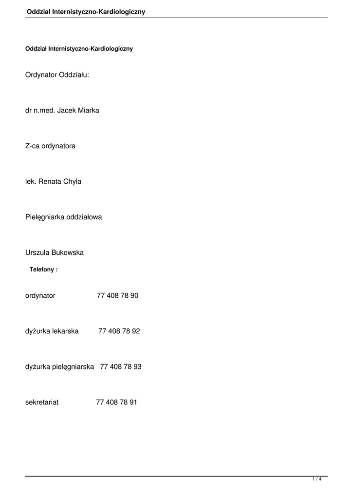 Oddział Internistyczno-Kardiologiczny Oddział Internistyczno-Kardiologiczny Ordynator Oddziału: dr n.med. Jacek Miarka Z-ca ordynatora lek. Renata Chyła Pielęgniarka oddziałowa Urszula Bukowska Telefony : ordynator 77 408 78 90 dyżurka lekarska 77 408 78 92 dyżurka pielęgniarska 77 408 78 93 sekretariat 77 408 78 91 1/4 Oddział Internistyczno-Kardiologiczny W Oddziale Internistyczno-Kardiologicznym wykonywane są: - Echokardiografia Próby wysiłkowe 24 godziny zapis EKG metodą Holtera 24 godzinny zapis RR Badanie EKG Zakładanie worka drenażu worka osierdziowego Wprowadzenie elektrody wewnątrzsercowej do stymulacji zewnętrznej Testy pochylniowe Kardiowersja elektryczna Defibrylacja Zakładanie wkłucia do żyły centralnej Intubacja dotchawicza Rektoskopia Kolonoskopia Gastroskopia Biopsja cienkoigłowa wątroby, trzustki, tarczycy USG jamy brzusznej, tarczycy Płukanie żołądka Nakłucie jamy opłucnowej, jamy brzusznej ZADANIA ODDZIAŁU INTERNISTYCZNO-KARDIOLOGICZNEGO Do zadań Oddziału w szczególności należy: 1. Wykonywanie procedur medycznych: - Echokardiografia Próby wysiłkowe 24 godziny zapis EKG metodą Holtera 24 godzinny zapis RR Badanie EKG Nakłucie worka worka osierdziowego z ewakuacją płynu. Wprowadzenie elektrody wewnątrzsercowej do stymulacji zewnętrznej Testy pochylniowe Kardiowersja elektryczna 2/4 Oddział Internistyczno-Kardiologiczny - Defibrylacja - Zakładanie wkłucia do żyły centralnej - Intubacja dotchawicza - Rektoskopia - Kolonoskopia - Gastroskopia - Biopsja cienkoigłowa wątroby, trzustki, tarczycy - USG jamy brzusznej, przestrzeni pozaotrzewnej, układu moczowego, tarczycy, narządów powierzchownych - Płukanie żołądka - Nakłucie jamy opłucnowej z ewakuacją płynu - Nakłucie jamy otrzewnej z ewakuacją płynu 2. Diagnostyka i leczenie pacjentów ze schorzeniami w zakresie chorób wewnętrznych 3. Diagnostyka i leczenie pacjentów ze schorzeniami ukladu krążenia 4. Monitorowanie i leczenie chorych z niestabilną chorobą wieńcową i niewydolnością krążeniowo-oddechową 5. Monitorowanie i leczenie chorych hospitalizowanych z powodu ostrych zespołów wieńcowych w okresie po zabiegu (zabiegi na naczyniach wieńcowych) 6. Monitorowanie i leczenie chorych z groźnymi dla życia zaburzeniami rytmu serca 7. Konsultowanie pacjentów we wszystkich oddziałach szpitalnych 8. Szkolenie personelu medycznego Oddziału i innych oddziałów. 9. Prowadzenie obowiązującej dokumentacji. 3/4 Oddział Internistyczno-Kardiologiczny 4/4