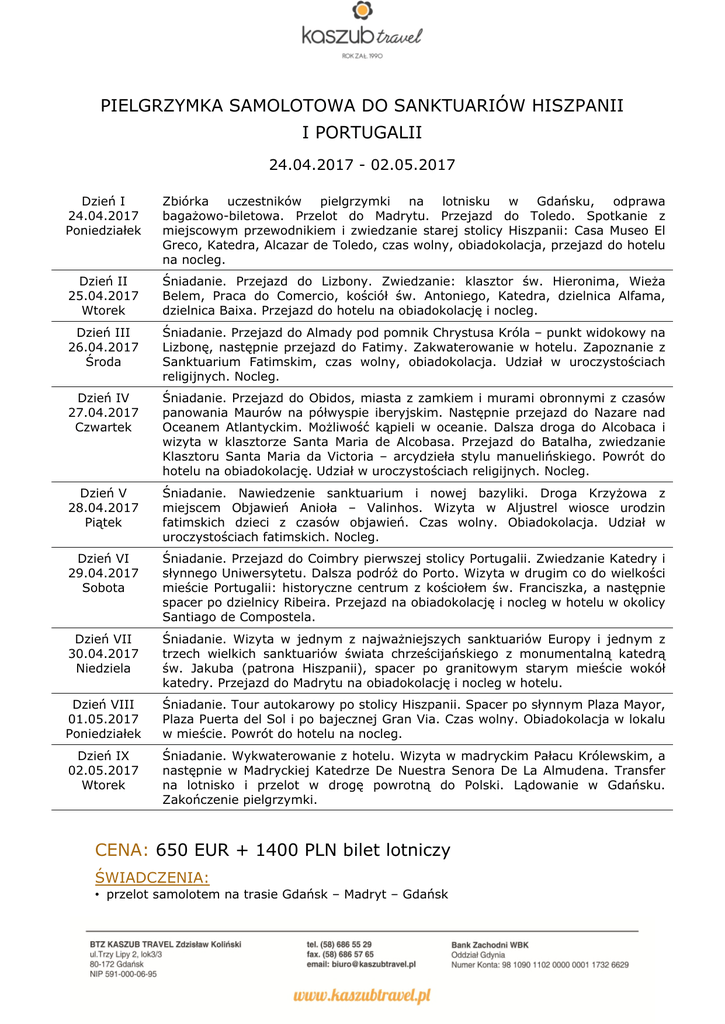 PIELGRZYMKA SAMOLOTOWA DO SANKTUARIÓW HISZPANII I PORTUGALII 24.04.2017 - 02.05.2017 Dzień I 24.04.2017 Poniedziałek Zbiórka uczestników pielgrzymki na lotnisku w Gdańsku, odprawa bagażowo-biletowa. Przelot do Madrytu. Przejazd do Toledo. Spotkanie z miejscowym przewodnikiem i zwiedzanie starej stolicy Hiszpanii: Casa Museo El Greco, Katedra, Alcazar de Toledo, czas wolny, obiadokolacja, przejazd do hotelu na nocleg. Dzień II 25.04.2017 Wtorek Śniadanie. Przejazd do Lizbony. Zwiedzanie: klasztor św. Hieronima, Wieża Belem, Praca do Comercio, kościół św. Antoniego, Katedra, dzielnica Alfama, dzielnica Baixa. Przejazd do hotelu na obiadokolację i nocleg. Dzień III 26.04.2017 Środa Śniadanie. Przejazd do Almady pod pomnik Chrystusa Króla – punkt widokowy na Lizbonę, następnie przejazd do Fatimy. Zakwaterowanie w hotelu. Zapoznanie z Sanktuarium Fatimskim, czas wolny, obiadokolacja. Udział w uroczystościach religijnych. Nocleg. Dzień IV 27.04.2017 Czwartek Śniadanie. Przejazd do Obidos, miasta z zamkiem i murami obronnymi z czasów panowania Maurów na półwyspie iberyjskim. Następnie przejazd do Nazare nad Oceanem Atlantyckim. Możliwość kąpieli w oceanie. Dalsza droga do Alcobaca i wizyta w klasztorze Santa Maria de Alcobasa. Przejazd do Batalha, zwiedzanie Klasztoru Santa Maria da Victoria – arcydzieła stylu manuelińskiego. Powrót do hotelu na obiadokolację. Udział w uroczystościach religijnych. Nocleg. Dzień V 28.04.2017 Piątek Śniadanie. Nawiedzenie sanktuarium i nowej bazyliki. Droga Krzyżowa z miejscem Objawień Anioła – Valinhos. Wizyta w Aljustrel wiosce urodzin fatimskich dzieci z czasów objawień. Czas wolny. Obiadokolacja. Udział w uroczystościach fatimskich. Nocleg. Dzień VI 29.04.2017 Sobota Śniadanie. Przejazd do Coimbry pierwszej stolicy Portugalii. Zwiedzanie Katedry i słynnego Uniwersytetu. Dalsza podróż do Porto. Wizyta w drugim co do wielkości mieście Portugalii: historyczne centrum z kościołem św. Franciszka, a następnie spacer po dzielnicy Ribeira. Przejazd na obiadokolację i nocleg w hotelu w okolicy Santiago de Compostela. Dzień VII 30.04.2017 Niedziela Śniadanie. Wizyta w jednym z najważniejszych sanktuariów Europy i jednym z trzech wielkich sanktuariów świata chrześcijańskiego z monumentalną katedrą św. Jakuba (patrona Hiszpanii), spacer po granitowym starym mieście wokół katedry. Przejazd do Madrytu na obiadokolację i nocleg w hotelu. Dzień VIII 01.05.2017 Poniedziałek Śniadanie. Tour autokarowy po stolicy Hiszpanii. Spacer po słynnym Plaza Mayor, Plaza Puerta del Sol i po bajecznej Gran Via. Czas wolny. Obiadokolacja w lokalu w mieście. Powrót do hotelu na nocleg. Dzień IX 02.05.2017 Wtorek Śniadanie. Wykwaterowanie z hotelu. Wizyta w madryckim Pałacu Królewskim, a następnie w Madryckiej Katedrze De Nuestra Senora De La Almudena. Transfer na lotnisko i przelot w drogę powrotną do Polski. Lądowanie w Gdańsku. Zakończenie pielgrzymki. CENA: 650 EUR + 1400 PLN bilet lotniczy ŚWIADCZENIA: • przelot samolotem na trasie Gdańsk – Madryt – Gdańsk • (bagaż podręczny – 1 sztuka do 8 kg o wymiarach 55 x 40 x 23 cm oraz bagaż rejestrowany – 1 sztuka do 23 kg, suma wymiarów bagażu nie może przekroczyć 158 cm (długość + szerokość + głębokość) • przejazd autokarem turystycznym zgodnie z trasą pielgrzymki • 8 noclegów w pokojach 2 osobowych z WC i łazienką • śniadania zgodnie z programem • obiadokolacje zgodnie z programem • ubezpieczenie KL, NNW i bagażu w Signal Iduna– obejmuje choroby przewlekłe • opieka pilota na całej trasie • przewodnicy miejscowi zgodnie z programem CENA NIE ZAWIERA: • biletów wstępów do zwiedzanych obiektów • indywidualnego nagłośnienia • napoi do obiadokolacji UWAGI: • każdego dnia Msza św. w miejscu uzgodnionym z opiekunem duchowym • zastrzega się możliwość zmiany kolejności zwiedzanych obiektów • organizator nie odpowiada za nieprzewidziane zmiany niezależne od niego