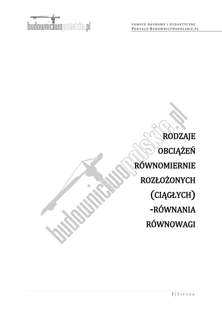 POMOCE NAUKOWE I DYDAKTYCZNE PORTALU BUDOWNICTWOPOLSKIE.PL RODZAJE OBCIĄŻEŃ RÓWNOMIERNIE ROZŁOŻONYCH (CIĄGŁYCH) -RÓWNANIA RÓWNOWAGI 1|Strona POMOCE NAUKOWE I DYDAKTYCZNE PORTALU BUDOWNICTWOPOLSKIE.PL Obciążenie równomiernie rozłożone (ciągłe) na rzut poziomy ukośnego pręta: Równania równowagi: z powyższych równań otrzymujemy: z 1. z 3. z 2. 2|Strona POMOCE NAUKOWE I DYDAKTYCZNE PORTALU BUDOWNICTWOPOLSKIE.PL Obciążenie równomiernie rozłożone (ciągłe) na długości pręta ukośnego: Równania równowagi: z powyższych równań otrzymujemy: z 1. z 3. z 2. 3|Strona POMOCE NAUKOWE I DYDAKTYCZNE PORTALU BUDOWNICTWOPOLSKIE.PL Obciążenie równomiernie rozłożone (ciągłe) prostopadłe do osi pręta ukośnego: Równania równowagi: z powyższych równań otrzymujemy: z 1. z 3. z 2. 4|Strona POMOCE NAUKOWE I DYDAKTYCZNE PORTALU BUDOWNICTWOPOLSKIE.PL Obciążenie trójkątne (ciągłe) prostopadłe do osi pręta ukośnego: Równania równowagi: z powyższych równań otrzymujemy: z 1. z 3. z 2. 5|Strona