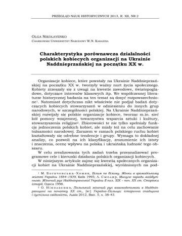 PRZEGLĄD NAUK HISTORYCZNYCH 2013, R. XII, NR 2 OLGA NIKOLAYENKO CHARKOWSKI UNIWERSYTET NARODOWY W.N. KARAZINA Charakterystyka porównawcza działalności polskich kobiecych organizacji na Ukrainie Naddnieprzańskiej na początku ХХ w. Organizacje kobiece, które powstały na Ukrainie Naddnieprzańskiej na początku ХХ w. tworzyły ważny nurt życia społecznego. Kobiety zrzeszały się z uwagi na kwestie zawodowe, światopoglądowe, dotyczące interesów klasowych itp. We współczesnej literaturze historycznej badania na ten temat są dosyć rozpowszechnione1. Natomiast dotychczas nikt właściwie nie podjął badań dotyczących kobiecych stowarzyszeń w odniesieniu do innych grup narodowych, w szczególności polskiej. Na Ukrainie Naddnieprzańskiej rozwijały się polskie organizacje kobiece, tworząc m.in. sieć kół pomocy wzajemnej, towarzystwa wsparcia sztuki i kultury, stowarzyszenia religijne2. Zbiorowości te nie tylko spełniały funkcję jednoczenia polskich kobiet, ale miały też na celu zachowanie tożsamości narodowej. Zarazem w ramach polskiego ruchu kobiet kształtowały się odrębne tendencje i grupy. Wymaga to dokładnej analizy, co pozwoli na ich klasyfikację, zrozumienie ich istoty i znaczenia, ocenę wpływu na polską i ukraińską ludność tego obszaru. W celu zrealizowania tych zadań trzeba przeanalizować programowe cele i kierunki działania polskich organizacji kobiecych. W niniejszym artykule zajmę się kwestią społecznych organizacji kobiet na Ukrainie Naddnieprzańskiej, wyróżnionych na pod1 М. Б о г а ч е в с ь к а - Х о м я к, Білим по білому. Жінки в громадському житті України 1884–1939, Київ 1995; Л. С м о л я р, Минуле заради майбутнього. Жіночий рух Наддніпрянської України ІІ пол. ХІХ – поч. ХХ ст. Сторінки історії, Одеса 1998. 2 О. Н і к о л а є н к о, Польський жіночий рух взаємодопомоги в Наддніпрянщині на початку ХХ ст., [w:] Україна–Польща: історична спадщина і суспільна свідомість, Львів 2012, Вип. 5, s. 38–43. 254 OLGA NIKOLAYENKO stawie płciowej i narodowej identyfikacji, których uczestniczki pragnęły artykułować i bronić swoich interesów. Zadaniem, jakie przed sobą postawiłam jest porównanie działalności dwóch polskich organizacji kobiecych – w Kijowie i Odessie – które w programowych celach podkreślały konieczność obrony interesów polskich kobiet, wyznaczały zasady funkcjonowania stowarzyszeń i ich zadania. Niestety, dotąd organizacje te nie wzbudzały zainteresowania historyków, marginalnie tylko wspominano o nich w niektórych pracach poświęconych historii polskiej wspólnoty na Ukrainie Naddnieprzańskiej3. Głównymi źródłami wykorzystanymi w analizie są dokumenty zachowane w Centralnym Państwowym Historycznym Archiwum m. Kijowa [dalej: CDIAUK] i w Państwowym Archiwum Odeskiego Obwodu [dalej: DAOO]. Oprócz statutów oparto się na korespondencji z miejscową władzą i żandarmami, sprawozdaniach i tym podobnych dokumentach. Do tego, nieco wiadomości o społecznej działalności Polek zawierają też miejscowe periodyki. W roku 1907 w Kijowie powstało stowarzyszenie o nazwie Koło Kobiet Polskich Kijowa. Celem organizacji było niesienie pomocy Polakom na polu kultury, moralności i gospodarki4. W związku z tym organizacja ta zamierzała przeprowadzać wykłady dla kobiet, poprawiać system żeńskiej edukacji, dostosowując ją do współczesnych wymogów uzyskania należytego zarobku, podtrzymywać „kobiece” rzemiosła i wytwórczość, pośredniczyć w znajdowaniu przez kobiety pracy5. Rozumiejąc konieczność pomocy kobietom mającym dzieci, organizacja zakładała w Statucie stworzenie własnych sklepów i kas zapomogowych, co powinno zmniejszyć wydatki rodzin. Planowano zorganizowanie kursów dla biednych kobiet, przysposabiających do wykonywania różnych zajęć6. Działalność koła powinna być skierowana na różne grupy ludności zarówno miejskie, jak i wiejskie. W przypadku kobiet z tej pierwszej grupy zakładano „podniesienie ich religijnego i moralnego poziomu”, zapobieganie ich moralnemu upadkowi (widocznie 3 О.М. Б і л о б р о в е ц ь, Суспільно-політичний рух поляків Правобережної України у 1863–1914 рр. [Текст]: дис... канд. іст. наук: 07.00.01 / Білобровець Ольга Матвіївна; Київський національний лінгвістичний ун-т., Київ 2005, 230 арк., арк. 189–191. 4 CDIAUK, F. 274, Оp. 1, S. 2982, cz. 2, ark. 591. 5 „Kraj” [Sankt-Petersburg] 1907, № 11. 6 „Kresy” [Kijow] 1907, № 26. Charakterystyka porównawcza działalności… 255 brana była pod uwagę prostytucja) i walka z alkoholizmem. Do drugiej – wykłady na temat prowadzenia gospodarstwa, wiejskiej techniki, promowania aptek, łaźni, zapewnienia pomocy położniczej7. Nowo utworzona organizacja zadeklarowała w Statucie swoje pragnienie „bycia poza dowolnymi politycznymi kierunkami” i głosiłа też wolność myśli. Członkiniami mogły zostać pełnoletnie, zdolne do działania kobiety, którym przyznano prawo głosu. Decyzje podejmowano na ogólnych zebraniach, bądź czynił to Zarząd wybrany na zebraniach z udziałem wszystkich członków. Środki gromadzono ze składek członkowskich w wysokości pięciu rubli rocznie, a dla kobiet, które zarabiały na życie własną pracą – jednego rubla. Do tego koło zapraszało prelegentów z płatnymi wykładami, a zgromadzone pieniądze kierowano na konto organizacji8. Była to pierwsza polska organizacja stawiająca sobie za cel obronę interesów kobiet. W przeciwieństwie do p