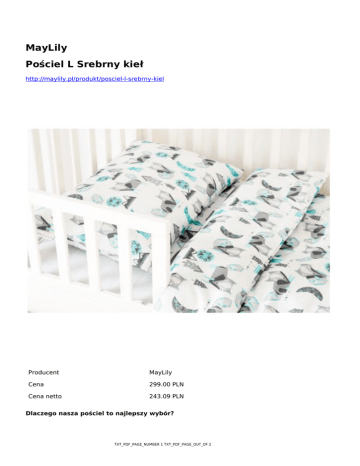 MayLily Pościel L Srebrny kieł http://maylily.pl/produkt/posciel-l-srebrny-kiel Producent MayLily Cena 299.00 PLN Cena netto 243.09 PLN Dlaczego nasza pościel to najlepszy wybór? TXT_PDF_PAGE_NUMBER 1 TXT_PDF_PAGE_OUT_OF 2 jest piękna i doskonała jakościowo została wykonana z utkanej w Polsce na nasze zamówienie bambawełny (50% bambus, 50% bawełna) - łączy antybakteryjne i termoregulacyjne właściwości bambusa z wytrzymałością i naturalnością bawełny jest bardzo przyjemna w dotyku, przypomina nieco delikatną flanelę została ozdobiona autorskim, narysowanym specjalnie dla nas wzorem jest zasuwana na zamek ma rozmiar 140x200 cm i poszewkę na poduszkę 50x60 cm (uniwersalne wymiary, umożliwiające dopasowanie dowolnego wypełnienia) w naszej ofercie znajdują się także wypełnienia - kołderki i poduszki Cechy produktu Skład 50% bambus, 50% bawełna Czy można prać w pralce? 1 TXT_PDF_PAGE_NUMBER 2 TXT_PDF_PAGE_OUT_OF 2