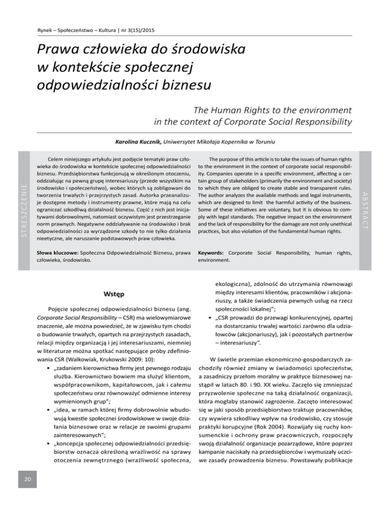 Rynek – Społeczeństwo – Kultura | nr 3(15)/2015 Prawa człowieka do środowiska w kontekście społecznej odpowiedzialności biznesu The Human Rights to the environment in the context of Corporate Social Responsibility Celem niniejszego artykułu jest podjęcie tematyki praw człowieka do środowiska w kontekście społecznej odpowiedzialności biznesu. Przedsiębiorstwa funkcjonują w określonym otoczeniu, oddziałując na pewną grupę interesariuszy (przede wszystkim na środowisko i społeczeństwo), wobec których są zobligowani do tworzenia trwałych i przejrzystych zasad. Autorka przeanalizuje dostępne metody i instrumenty prawne, które mają na celu ograniczać szkodliwą działalność biznesu. Część z nich jest inicjatywami dobrowolnymi, natomiast oczywistym jest przestrzeganie norm prawnych. Negatywne oddziaływanie na środowisko i brak odpowiedzialności za wyrządzone szkody to nie tylko działania nieetyczne, ale naruszanie podstawowych praw człowieka. The purpose of this article is to take the issues of human rights to the environment in the context of corporate social responsibility. Companies operate in a specific environment, affecting a certain group of stakeholders (primarily the environment and society) to which they are obliged to create stable and transparent rules. The author analyzes the available methods and legal instruments, which are designed to limit the harmful activity of the business. Some of these initiatives are voluntary, but it is obvious to comply with legal standards. The negative impact on the environment and the lack of responsibility for the damage are not only unethical practices, but also violation of the fundamental human rights. Słowa kluczowe: Społeczna Odpowiedzialność Biznesu, prawa człowieka, środowisko. Keywords: Corporate Social Responsibility, human rights, environment. Wstęp Pojęcie społecznej odpowiedzialności biznesu (ang. Corporate Social Responsibility – CSR) ma wielowymiarowe znaczenie, ale można powiedzieć, że w zjawisku tym chodzi o budowanie trwałych, opartych na przejrzystych zasadach, relacji między organizacją i jej interesariuszami, niemniej w literaturze można spotkać następujące próby zdefiniowania CSR (Walkowiak, Krukowski 2009: 10): • „zadaniem kierownictwa firmy jest pewnego rodzaju służba. Kierownictwo bowiem ma służyć klientom, współpracownikom, kapitałowcom, jak i całemu społeczeństwu oraz równoważyć odmienne interesy wymienionych grup”; • „idea, w ramach której firmy dobrowolnie wbudowują kwestie społecznei środowiskowe w swoje działania biznesowe oraz w relacje ze swoimi grupami zainteresowanych”; • „koncepcja społecznej odpowiedzialności przedsiębiorstw oznacza określoną wrażliwość na sprawy otoczenia zewnętrznego (wrażliwość społeczna, 20 ekologiczna), zdolność do utrzymania równowagi między interesami klientów, pracowników i akcjonariuszy, a także świadczenia pewnych usług na rzecz społeczności lokalnej”; • „CSR prowadzi do przewagi konkurencyjnej, opartej na dostarczaniu trwałej wartości zarówno dla udziałowców (akcjonariuszy), jak i pozostałych partnerów – interesariuszy”. W świetle przemian ekonomiczno‑gospodarczych zachodziły również zmiany w świadomości społeczeństw, a zasadniczy przełom moralny w praktyce biznesowej nastąpił w latach 80. i 90. XX wieku. Zaczęło się zmniejszać przyzwolenie społeczne na taką działalność organizacji, która mogłaby stanowić zagrożenie. Zaczęto interesować się w jaki sposób przedsiębiorstwo traktuje pracowników, czy wywiera szkodliwy wpływ na środowisko, czy stosuje praktyki korupcyjne (Rok 2004). Rozwijały się ruchy konsumenckie i ochrony praw pracowniczych, rozpoczęły swoją działalność organizacje pozarządowe, które poprzez kampanie naciskały na przedsiębiorców i wymuszały uczciwe zasady prowadzenia biznesu. Powstawały publikacje ABSTRACT STRESZCZENIE Karolina Kucznik, Uniwersytet Mikołaja Kopernika w Toruniu Karolina Kucznik – Prawa człowieka do... odsłaniające praktyki korporacji, które kosztem klientów, pracowników i środowiska maksymalizowały swoje zyski, co powodowało utratę zaufania opinii publicznej wobec światowego biznesu. Organizacje musiały więc podjąć wyzwanie, żeby utrzymać (bądź przywrócić) dobrą reputację. Przedstawiciele świata biznesu zaczęli dążyć do samoregulacji. Uznano bowiem, że takie dobrowolne inicjatywy nie tylko uzupełniają minimalne standardy obowiązujących przepisów krajowych czy międzynarodowych, ale propagują określone kanony etyki w biznesie. Jest to także swego rodzaju manifest, że rzetelne i uczciwe zarządzanie daje swoistą przewagę konkurencyjną. Społecznie odpowiedzialnie przedsiębiorstwo buduje zaufanie klientów, zainteresowanie inwestorów i jest przyczyną dumy oraz swoistym motywatorem pracowników, dlatego samoregulacje mają przeciwdziałać stratom przedsiębiorstw. CSR stał się zjawiskiem globalnym. W wielu miejscach na świecie pojawiają się inicjatywy angażujące liderów biznesu, przedstawicieli władz państwowych i samorządowych oraz organizacje pozarządowe (Rok 2004). Społeczna odpowiedzialność biznesu to efektywna strategia zarządzania, która przyczynia się do wzrostu konkurencyjności i kształtuje korzystne warunki rozwoju społecznego i ekonomicznego poprzez prowadzenie dialogu z otoczeniem (Rok 2004). Przedsiębiorstwa realizują projekty dotyczące wprowadzenia przejrzystych zasad, rzetelnej komunikacji, budowania lepszych relacji ze swoimi klientami, partnerami biznesowymi i społecznymi (Rok, Kuraszko, i inni 2007). Należy stwierdzić, że firmy starają się jak najlepiej dopasować swoje projekty do turbulentnie zmieniającej się rzeczywistości rynkowej. Etyczne i odpowiedzialne działania sprzyjają sukcesom w biznesie, podnoszą kulturę organizacyjną, przyciągają cennych pracowników or