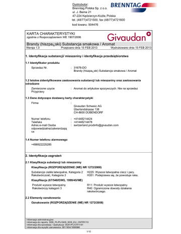 Dystrybutor: Brenntag Polska Sp. z o.o. ul. J. Bema 21 47-224 Kędzierzyn-Koźle, Polska tel. (48/77)4721500, fax (48/77)4721600 kod towaru: 504476 KARTA CHARAKTERYSTYKI zgodnie z Rozporządzeniem WE 1907/2006 Brandy (hiszpa¿ski) Substancja smakowa / Aromat Wersja 1.0 Przejrzano dnia 15 FEB 2013 Wydrukowano dnia 15 FEB 2013 1. Identyfikacja substancji/ mieszaniny i identyfikacja przedsiębiorstwa 1.1 Identyfikator produktu Sprzedaz Nr. : 31678-DO Brandy (hiszpa¿ski) Substancja smakowa / Aromat 1.2 Istotne zidentyfikowane zastosowania substancji lub mieszaniny oraz zastosowania odradzane Zamierzone uzycie Przyprawy : Aromat do artykulow spozywczych. Nie na sprzedaz 1.3 Dane dotyczące dostawcy karty charakterystyki Firma : Givaudan Schweiz AG Überlandstrasse 138 CH-8600 DÜBENDORF Numer telefonu Telefaks Adres e-mail Osoba odpowiedzialna/zatwierdzają ca : +41448214424 : +41448214478 : [email protected] 1.4 Numer telefonu alarmowego +496922225285 2. Identyfikacja zagrożeń 2.1 Klasyfikacja substancji lub mieszaniny Klasyfikacja (ROZPORZĄDZENIE (WE) NR 1272/2008) Substancje ciekłe łatwopalne, Kategoria 2 Rakotwórczość, Kategoria 2 H225: Wysoce łatwopalna ciecz i pary. H351: Podejrzewa się, że powoduje raka. Klasyfikacja (67/548/EWG, 1999/45/WE) Produkt wysoce łatwopalny Rakotwórczy kategorii 3 R11: Produkt wysoce łatwopalny. R40: Ograniczone dowody działania rakotwórczego. 2.2 Elementy oznakowania Oznakowanie (ROZPORZĄDZENIE (WE) NR 1272/2008) Informacje administracyjne: Informacja do raportu: SDS_PL/PL/GHS_SDS_EU_CNTRY/10 Informacja dla sprzedazy / dystrybucji: DU01/FL/CH11/01 Informacja dla wysylki zamowienia: 5811854/1899986 1/15 KARTA CHARAKTERYSTYKI zgodnie z Rozporządzeniem WE 1907/2006 Brandy (hiszpa¿ski) Substancja smakowa / Aromat Wersja 1.0 Przejrzano dnia 15 FEB 2013 Piktogramy określające rodzaj zagrożenia : Hasło ostrzegawcze : Niebezpieczeństwo Zwroty wskazujące rodzaj zagrożenia : H225 H351 Zwroty wskazujące środki ostrożności : Zapobieganie: P201 Wydrukowano dnia 15 FEB 2013 Wysoce łatwopalna ciecz i pary. Podejrzewa się, że powoduje raka. P210 P233 P281 Przed użyciem zapoznać się ze specjalnymi środkami ostrożności. Przechowywać z dala od źródeł ciepła/iskrzenia/otwartego ognia/gorących powierzchni. Palenie wzbronione. Przechowywać pojemnik szczelnie zamknięty. Stosować wymagane środki ochrony indywidualnej. Reagowanie: P303 + P361 + P353 W PRZYPADKU KONTATKU ZE SKÓRĄ (lub z włosami): Natychmiast usunąć/ zdjąć całą zanieczyszczoną odzież. Spłukać skórę pod strumieniem wody/ prysznicem. P370 + P378 W przypadku pożaru: Do gaszenia stosować suchy piasek, chemiczne środki gaśnicze lub pianę alkoholoodporną. Niebezpieczne składniki muszą być wymienione na etykiecie: 75-07-0 • acetaldehyd Oznakowanie zgodne z Dyrektywami UE (67/548/EWG, 1999/45/WE) Piktogramy określające rodzaj zagrożenia : Produkt wysoce łatwopalny Produkt szkodliwy Zwrot(y) R : R11 R40 Produkt wysoce łatwopalny. Ograniczone dowody działania rakotwórczego. Zwrot(y) S : S9 Przechowywać pojemnik w miejscu dobrze Informacje administracyjne: Informacja do raportu: SDS_PL/PL/GHS_SDS_EU_CNTRY/10 Informacja dla sprzedazy / dystrybucji: DU01/FL/CH11/01 Informacja dla wysylki zamowienia: 5811854/1899986 2/15 KARTA CHARAKTERYSTYKI zgodnie z Rozporządzeniem WE 1907/2006 Brandy (hiszpa¿ski) Substancja smakowa / Aromat Wersja 1.0 Wydrukowano dnia 15 FEB 2013 Przejrzano dnia 15 FEB 2013 wentylowanym. Nie przechowywać w pobliżu źródeł zapłonu - nie palić tytoniu. Zastosować środki ostrożności zapobiegające wyładowaniom elektrostatycznym. Nosić odpowiednią odzież ochronną i odpowiednie rękawice ochronne. Produkt i opakowanie usuwać jako odpad niebezpieczny. S16 S33 S36/37 S60 Niebezpieczne składniki muszą być wymienione na etykiecie: 75-07-0 • acetaldehyd 2.3 Inne zagrożenia brak dostępnych danych 3. Skład/ informacja o składnikach 3.2 Mieszaniny Składniki niebezpieczne Nazwa Chemiczna Nr CAS Nr WE Numer rejestru 3-methylbutan-1-ol 123-51-3 204-633-5 octan etylowy 141-78-6 205-500-4 Klasyfikacja Klasyfikacja Stężenie [%] (67/548/EWG) (ROZPORZĄDZ ENIE (WE) NR 1272/2008) R66-R10 Flam. Liq. 3; >= 1 - < 5 Xn; R20 H226 Xi; R37 STOT SE 3; H335 4; H332 F; R11 Xi; R36 R66 R67 Informacje administracyjne: Informacja do raportu: SDS_PL/PL/GHS_SDS_EU_CNTRY/10 Informacja dla sprzedazy / dystrybucji: DU01/FL/CH11/01 Informacja dla wysylki zamowienia: 5811854/1899986 3/15 Flam. Liq. 2; H225 Eye Irrit. 2; H319 STOT SE 3; H336 >= 1 - < 5 KARTA CHARAKTERYSTYKI zgodnie z Rozporządzeniem WE 1907/2006 Brandy (hiszpa¿ski) Substancja smakowa / Aromat Wersja 1.0 Przejrzano dnia 15 FEB 2013 acetaldehyd Substancja NDS : alkohol etylowy Wydrukowano dnia 15 FEB 2013 75-07-0 200-836-8 F+; R12 Carc.Cat.3; R40 Xi; R36/37 Flam. Liq. 1; H224 Carc. 2; H351 Eye Irrit. 2; H319 STOT SE 3; H335 >= 1 - < 5 64-17-5 200-578-6 F; R11 Flam. Liq. 2; H225 >= 5 - < 10 01-2119457610-430098 01-2119457610-43 Pełen tekst zwrotów R zawartych w tej Sekcji umieszczonow w Sekcji 16. Pełny tekst zwrotów H przytoczonych w tej Sekcji znajduje się w Sekcji 16. Węglowodory : 0% 4. Środki pierwszej pomocy 4.1 Opis środków pierwszej pomocy Porady ogólne : Usunąć z zagrożonej strefy. Przedstawić lekarzowi dołączoną Kartę Charakterystyki Substancji Niebezpiecznej. Nie pozostawiać osoby poszkodowanej bez opieki. W przypadku wdychania : Osobie nieprzytomnej zapewnić wygodną pozycję i zasięgnąć porady medycznej. Jeśli objawy utrzymują się, wezwać lekarza. W przypadku kontaktu ze skórą : W przypadku zanieczyszczenia skóry - dobrze spłukać wodą. W przypadku zanieczyszczenia ubrania - zdjąć ubranie. W przypadku kontaktu z oczami : Zapobiegawczo przemyć oczy wodą. Usunąć szkła (szkło) kontaktowe. Zabezpieczyć nieuszkodzone oko. W trakcie przemywania należy szeroko otwierać oczy. Jeśli podrażnienie oczu utrzymuje się, skonsultowa
