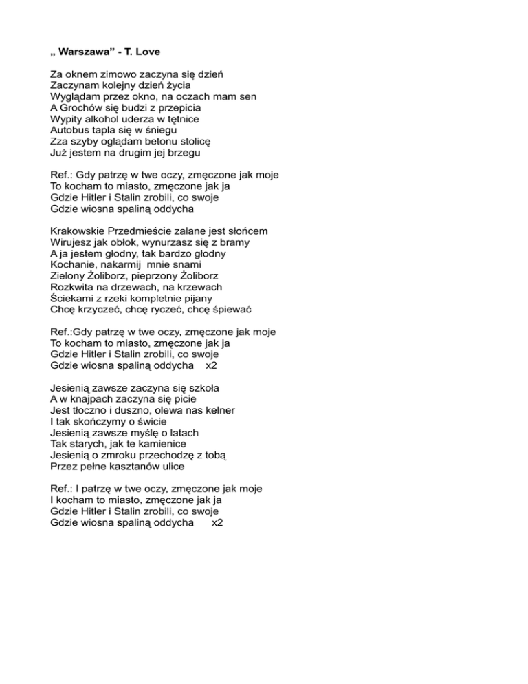 „ Warszawa” - T. Love Za oknem zimowo zaczyna się dzień Zaczynam kolejny dzień życia Wyglądam przez okno, na oczach mam sen A Grochów się budzi z przepicia Wypity alkohol uderza w tętnice Autobus tapla się w śniegu Zza szyby oglądam betonu stolicę Już jestem na drugim jej brzegu Ref.: Gdy patrzę w twe oczy, zmęczone jak moje To kocham to miasto, zmęczone jak ja Gdzie Hitler i Stalin zrobili, co swoje Gdzie wiosna spaliną oddycha Krakowskie Przedmieście zalane jest słońcem Wirujesz jak obłok, wynurzasz się z bramy A ja jestem głodny, tak bardzo głodny Kochanie, nakarmij mnie snami Zielony Żoliborz, pieprzony Żoliborz Rozkwita na drzewach, na krzewach Ściekami z rzeki kompletnie pijany Chcę krzyczeć, chcę ryczeć, chcę śpiewać Ref.:Gdy patrzę w twe oczy, zmęczone jak moje To kocham to miasto, zmęczone jak ja Gdzie Hitler i Stalin zrobili, co swoje Gdzie wiosna spaliną oddycha x2 Jesienią zawsze zaczyna się szkoła A w knajpach zaczyna się picie Jest tłoczno i duszno, olewa nas kelner I tak skończymy o świcie Jesienią zawsze myślę o latach Tak starych, jak te kamienice Jesienią o zmroku przechodzę z tobą Przez pełne kasztanów ulice Ref.: I patrzę w twe oczy, zmęczone jak moje I kocham to miasto, zmęczone jak ja Gdzie Hitler i Stalin zrobili, co swoje Gdzie wiosna spaliną oddycha x2