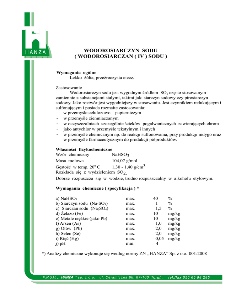 WODOROSIARCZYN SODU ( WODOROSIARCZAN ( IV ) SODU ) Wymagania ogólne Lekko żółta, przeźroczysta ciecz. Zastosowanie Wodorosiarczyn sodu jest wygodnym źródłem SO2 często stosowanym zamiennie z substancjami stałymi, takimi jak: siarczyn sodowy czy pirosiarczyn sodowy. Jako roztwór jest wygodniejszy w stosowaniu. Jest czynnikiem redukującym i sulfonującym i posiada rozmaite zastosowania: - w przemyśle celulozowo – papierniczym - w przemyśle ziemniaczanym - w oczyszczalniach szczególnie ścieków pogalwanicznych zawierających chrom - jako antychlor w przemyśle tekstylnym i innych - w przemyśle chemicznym np. do reakcji sulfonowania, przy produkcji indygo oraz w przemyśle farmaceutycznym do produkcji półproduktów. Własności fizykochemiczne Wzór chemiczny NaHSO3 Masa molowa 104,07 g/mol 0 Gęstość w temp. 20 C 1,30 - 1,40 g/cm3 Rozkłada się z wydzieleniem SO2. Dobrze rozpuszcza się w wodzie, trudno rozpuszczalny w alkoholu etylowym. Wymagania chemiczne ( specyfikacja ) * a) NaHSO3 b) Siarczyn sodu (Na2SO3) c) Siarczan sodu (Na2SO4) d) Żelazo (Fe) e) Metale ciężkie (jako Pb) f) Arsen (As) g) Ołów (Pb) h) Selen (Se) i) Rtęć (Hg) j) pH max. max. max. max. max. max. max. max. max. min. 40 1 1,5 10 10 1,0 2,0 2,0 0,05 4 % % % mg/kg mg/kg mg/kg mg/kg mg/kg mg/kg *) Analizy chemiczne wykonuje się według normy ZN-„HANZA” Sp. z o.o.-001:2008 P.P.U.H. „ HANZA ” s p. z o.o. ul. Ceramic zna 6h, 87-100 T Przechowywanie Przechowuje się w zbiornikach ze stali kwasoodpornej lub ze stali węglowej z wykładziną gumową oraz w pojemnikach z polietylenu. Transport Przewozi się w cysternach kolejowych , autocysternach lub pojemnikach polietylenowych . Można przewozić środkami transportu kolejowego lub drogowego. Klasyfikacja RID i ADR : Klasa 8 Grupa pakowania III PRZEPISY BEZPIECZEŃSTWA Obchodzenie się z produktem Przy pracy z wodorosiarczynem nosić okulary ochronne i rękawice gumowe szczególnie w przypadku dużych ilości. Nie przechowywać w jednym pomieszczeniu z kwasami i środkami utleniającymi. Niebezpieczeństwa Wodorosiarczyn sodowy jest średnio korodujący. Nie jest substancją toksyczną ani palną ale może rozkładać się w ogniu z wydzieleniem toksycznego SO2 . Toksyczność Wodorosiarczyn sodowy nie jest trucizną. Ogrzewany rozkłada się jednak z wydzieleniem trującego SO2.Wydzielający się dwutlenek siarki jest drażniący dla oczu, nosa, skóry i układu oddechowego. W czasie wdychania powoduje podrażnienie dróg oddechowych , kaszel i duszności. W przypadku spożycia powoduje pieczenie przełyku i ust. Stężenie wyczuwalne SO 2 – 0,8 mg /m3, stężenie dopuszczalne SO2 – 2 mg/m3. Własności palne oraz zalecenia ppoż. Jest niepalny. Pożary w obecności wodorosiarczynu sodowego można gasić wszystkimi środkami gaśniczymi. Pierwsza pomoc Oczy : przemyć natychmiast dużą ilością wody Usta : płukać wodą , podać wodę lub mleko do picia Skóra : spłukać wodą Przy wdychaniu : poszkodowanego wynieść na świeże powietrze , zapewnić ciepło, nie stosować sztucznego oddychania. Zapewnić opiekę lekarską szczególnie gdy objawy nie ustępują . Wyciek W przypadku wycieku zabezpieczyć przed rozprzestrzenianiem się ziemią lub piaskiem. Rozcieńczyć wodą, spłukiwać wodą z dodatkiem sody lub wapna. P.P.U.H. „ HANZA ” s p. z o.o. ul. Ceramic zna 6h, 87-100 T