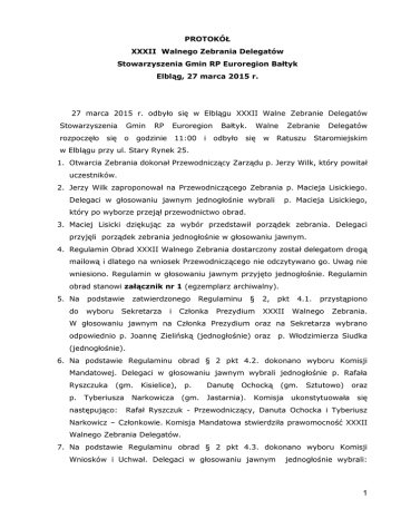 PROTOKÓŁ XXXII Walnego Zebrania Delegatów Stowarzyszenia Gmin RP Euroregion Bałtyk Elbląg, 27 marca 2015 r. 27 marca 2015 r. odbyło się w Elblągu XXXII Walne Zebranie Delegatów Stowarzyszenia Gmin rozpoczęło o się RP Euroregion godzinie 11:00 Bałtyk. i odbyło Walne się Zebranie Delegatów w Ratuszu Staromiejskim w Elblągu przy ul. Stary Rynek 25. 1. Otwarcia Zebrania dokonał Przewodniczący Zarządu p. Jerzy Wilk, który powitał uczestników. 2. Jerzy Wilk zaproponował na Przewodniczącego Zebrania p. Macieja Lisickiego. Delegaci w głosowaniu jawnym jednogłośnie wybrali p. Macieja Lisickiego, który po wyborze przejął przewodnictwo obrad. 3. Maciej Lisicki dziękując za wybór przedstawił porządek zebrania. Delegaci przyjęli porządek zebrania jednogłośnie w głosowaniu jawnym. 4. Regulamin Obrad XXXII Walnego Zebrania dostarczony został delegatom drogą mailową i dlatego na wniosek Przewodniczącego nie odczytywano go. Uwag nie wniesiono. Regulamin w głosowaniu jawnym przyjęto jednogłośnie. Regulamin obrad stanowi załącznik nr 1 (egzemplarz archiwalny). 5. Na do podstawie wyboru zatwierdzonego Sekretarza i Regulaminu Członka § Prezydium 2, pkt XXXII 4.1. przystąpiono Walnego Zebrania. W głosowaniu jawnym na Członka Prezydium oraz na Sekretarza wybrano odpowiednio p. Joannę Zielińską (jednogłośnie) oraz p. Włodzimierza Siudka (jednogłośnie). 6. Na podstawie Regulaminu obrad § 2 pkt 4.2. dokonano wyboru Komisji Mandatowej. Delegaci w głosowaniu jawnym wybrali jednogłośnie p. Rafała Ryszczuka p. (gm. Tyberiusza następująco: Kisielice), Narkowicza p. (gm. Danutę Ochocką Jastarnia). (gm. Komisja Sztutowo) ukonstytuowała oraz się Rafał Ryszczuk - Przewodniczący, Danuta Ochocka i Tyberiusz Narkowicz – Członkowie. Komisja Mandatowa stwierdziła prawomocność XXXII Walnego Zebrania Delegatów. 7. Na podstawie Regulaminu obrad § 2 pkt 4.3. dokonano wyboru Komisji Wniosków i Uchwał. Delegaci w głosowaniu jawnym jednogłośnie wybrali: 1 p. Kamil Szarag (mgm. Młynary), p. Krystyna Murawska (gm. Elbląg) i p. Janusz Wysocki (gm. Mikołajki Pomorskie). Komisja ukonstytuowała się następująco: p. Kamil Szarag - Przewodniczący, p. Krystyna Murawska i p. Janusz Wysocki – Członkowie. 8. Prezentację nt. ERB oraz z posiedzenia Prezydium ERB z dnia 12 lutego 2015 r. w Elblągu przedstawił Sebastian Magier - Szef Stałego Międzynarodowego Sekretariatu. Na początku powiedział o powstaniu ERB w 1998 roku, podając kraje, członków, powierzchnię i liczbę ludności. Omówił strukturę organizacyjną, cele działania ERB. W agendzie Euroregionu Bałtyk mówił o wartości dodanej, wskazał na takie obszary priorytetowe jak lobbing, działania strategiczne oraz wymianę wiedzy i informacji, strategii UE dla Regionu Morza Bałtyckiego, silnym przywództwie i Dorocznym Forum Interesariuszy ERB. Odnośnie posiedzenia Prezydium ERB z dnia 12 lutego 2015 r. w Elblągu Pan Sebastian Magier podkreślił przekazanie Prezydentury ERB z Litwy do Polski i zmiany w Radzie Młodzieżowej ERB. Pan Wiesław Byczkowski, Wicemarszałek Województwa Pomorskiego został wybrany nowym Prezydentem ERB. Nowym Przewodniczącym Rady Młodzieżowej ERB został Pan Mateusz Kryżba. Prezydium ERB zatwierdziło dla dalszego wsparcia przez Grupę Zadaniową następujące pomysły projektowe: Bitwy Morskie, Starożytne Domy Mierzei Kurońskiej i Dom Bałtyku. Prezydium ERB zatwierdziło dwóch kandydatów jako reprezentantów ERB do wspólnej delegacji Euroregionów w obecnym i przyszłym Komitecie Monitorującym Program Południowy Bałtyk. Wspomniał o zmianach w Statucie ERB. Nowymi członkami Prezydium ERB zostali Panie: Anna Fransson i Britt-Louise Berndtsson z Regionu Kronoberg oraz Pan Gustaw Marek Brzezin z Warmii i Mazur. 9. Sprawozdanie Przewodniczący z działalności Zarządu Stowarzyszenia Stowarzyszenia p. za rok Jerzy 2014 Wilk. przedstawił Sprawozdanie z działalności Stowarzyszenia za rok 2014 stanowi załącznik nr 2 (egz. archiwalny uczestnicy otrzymali drogą elektroniczną). 10. Wiceprzewodniczący Komisji Rewizyjnej, p. Janusz Goliński odczytał protokół Komisji Rewizyjnej z dnia 20 marca 2015r. z Wnioskiem o udzielenie absolutorium Przewodniczący ustępującemu zebrania Zarządowi. zapytał Po delegatów odczytaniu czy Protokółu są pytania do przedstawionego protokółu. Nikt z delegatów nie zadał żadnego pytania. Protokół Komisji Rewizyjnej stanowi załącznik nr 3 (egz. archiwalny). 2 11. Przewodniczący Komisji Wniosków i Uchwał, p. Kamil Szarag przedstawił projekty Uchwał wraz z załącznikami: -/ Uchwała nr 1 w sprawie przyjęcia sprawozdania z działalności Stowarzyszenia za rok 2014; -/ Uchwała nr 2 w sprawie przyjęcia sprawozdania finansowego za rok 2014; -/ Uchwała nr 3 w sprawie ustalenia kierunków działalności Stowarzyszenia w roku 2015; Przewodniczący Zebrania p. M. Lisicki zaprosił zebranych do dyskusji nad projektami przedstawionych uchwał oraz ich załącznikami. Nikt z delegatów nie zabrał głosu w sprawie przedstawionych uchwał. Przystąpiono do głosowania przedstawionych Uchwał: • Uchwała nr 1 w sprawie przyjęcia sprawozdania z działalności Stowarzyszenia za rok 2014: 28 głosów za, 0 głosów sprzeciw, 0 głos wstrzymujący się. • Uchwała nr 2 w przyjęcia sprawozdania finansowego za rok 2014: 28 głosów za, 0 głosów sprzeciw, 0 wstrzymujących się. • Uchwała nr 3 w sprawie w sprawie ustalenia kierunków działalności Stowarzyszenia w roku 2015; 28 głosów za, 0 sprzeciw, 0 wstrzymujących się. 12. Przewodniczący Komisji Wniosków i Uchwał p. Kamil Szarag przedstawił projekt Uchwały nr 4 w sprawie udzielenia absolutorium Zarządowi Stowarzyszenia. Po przedstawieniu uchwały przystąpiono do głosowania za przyjęciem uchwały nr 4 i udzielono absolutorium Zarządowi STG za rok 2014 głosami 28 – za, 0- wstrzymujących się , 0 - sprzeciw. Podjęcie uchwa