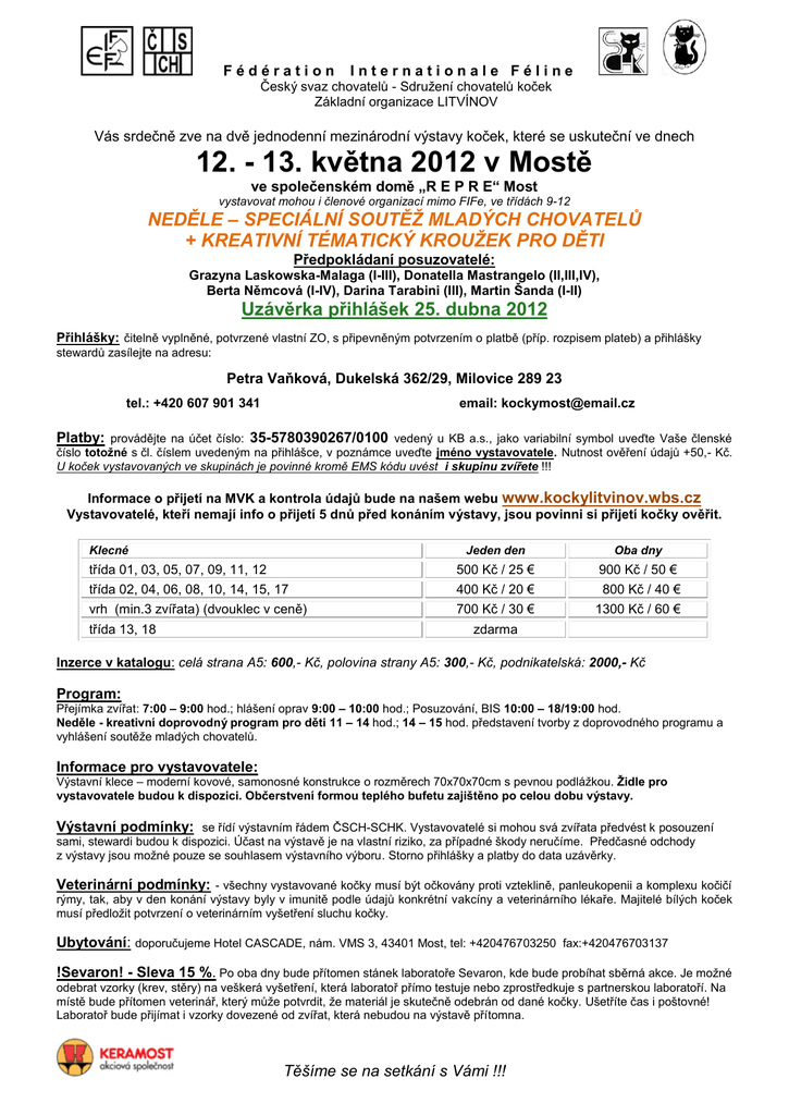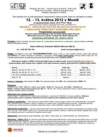 Fédération Internationale Féline Český svaz chovatelů - Sdružení chovatelů koček Základní organizace LITVÍNOV Vás srdečně zve na dvě jednodenní mezinárodní výstavy koček, které se uskuteční ve dnech 12. - 13. května 2012 v Mostě ve společenském domě „R E P R E“ Most vystavovat mohou i členové organizací mimo FIFe, ve třídách 9-12 NEDĚLE – SPECIÁLNÍ SOUTĚŽ MLADÝCH CHOVATELŮ + KREATIVNÍ TÉMATICKÝ KROUŽEK PRO DĚTI Předpokládaní posuzovatelé: Grazyna Laskowska-Malaga (I-III), Donatella Mastrangelo (II,III,IV), Berta Němcová (I-IV), Darina Tarabini (III), Martin Šanda (I-II) Uzávěrka přihlášek 25. dubna 2012 Přihlášky: čitelně vyplněné, potvrzené vlastní ZO, s připevněným potvrzením o platbě (příp. rozpisem plateb) a přihlášky stewardů zasílejte na adresu: Petra Vaňková, Dukelská 362/29, Milovice 289 23 tel.: +420 607 901 341 email: [email protected] Platby: provádějte na účet číslo: 35-5780390267/0100 vedený u KB a.s., jako variabilní symbol uveďte Vaše členské číslo totoţné s čl. číslem uvedeným na přihlášce, v poznámce uveďte jméno vystavovatele. Nutnost ověření údajů +50,- Kč. U koček vystavovaných ve skupinách je povinné kromě EMS kódu uvést i skupinu zvířete !!! Informace o přijetí na MVK a kontrola údajů bude na našem webu www.kockylitvinov.wbs.cz Vystavovatelé, kteří nemají info o přijetí 5 dnů před konáním výstavy, jsou povinni si přijetí kočky ověřit. Klecné Jeden den Oba dny třída 01, 03, 05, 07, 09, 11, 12 500 Kč / 25 € 900 Kč / 50 € třída 02, 04, 06, 08, 10, 14, 15, 17 400 Kč / 20 € 800 Kč / 40 € vrh (min.3 zvířata) (dvouklec v ceně) 700 Kč / 30 € 1300 Kč / 60 € třída 13, 18 zdarma Inzerce v katalogu: celá strana A5: 600,- Kč, polovina strany A5: 300,- Kč, podnikatelská: 2000,- Kč Program: Přejímka zvířat: 7:00 – 9:00 hod.; hlášení oprav 9:00 – 10:00 hod.; Posuzování, BIS 10:00 – 18/19:00 hod. Neděle - kreativní doprovodný program pro děti 11 – 14 hod.; 14 – 15 hod. představení tvorby z doprovodného programu a vyhlášení soutěže mladých chovatelů. Informace pro vystavovatele: Výstavní klece – moderní kovové, samonosné konstrukce o rozměrech 70x70x70cm s pevnou podlážkou. Ţidle pro vystavovatele budou k dispozici. Občerstvení formou teplého bufetu zajištěno po celou dobu výstavy. Výstavní podmínky: se řídí výstavním řádem ČSCH-SCHK. Vystavovatelé si mohou svá zvířata předvést k posouzení sami, stewardi budou k dispozici. Účast na výstavě je na vlastní riziko, za případné škody neručíme. Předčasné odchody z výstavy jsou možné pouze se souhlasem výstavního výboru. Storno přihlášky a platby do data uzávěrky. Veterinární podmínky: - všechny vystavované kočky musí být očkovány proti vzteklině, panleukopenii a komplexu kočičí rýmy, tak, aby v den konání výstavy byly v imunitě podle údajů konkrétní vakcíny a veterinárního lékaře. Majitelé bílých koček musí předložit potvrzení o veterinárním vyšetření sluchu kočky. Ubytování: doporučujeme Hotel CASCADE, nám. VMS 3, 43401 Most, tel: +420476703250 fax:+420476703137 !Sevaron! - Sleva 15 %. Po oba dny bude přítomen stánek laboratoře Sevaron, kde bude probíhat sběrná akce. Je možné odebrat vzorky (krev, stěry) na veškerá vyšetření, která laboratoř přímo testuje nebo zprostředkuje s partnerskou laboratoří. Na místě bude přítomen veterinář, který může potvrdit, že materiál je skutečně odebrán od dané kočky. Ušetříte čas i poštovné! Laboratoř bude přijímat i vzorky dovezené od zvířat, která nebudou na výstavě přítomna. Těšíme se na setkání s Vámi !!!