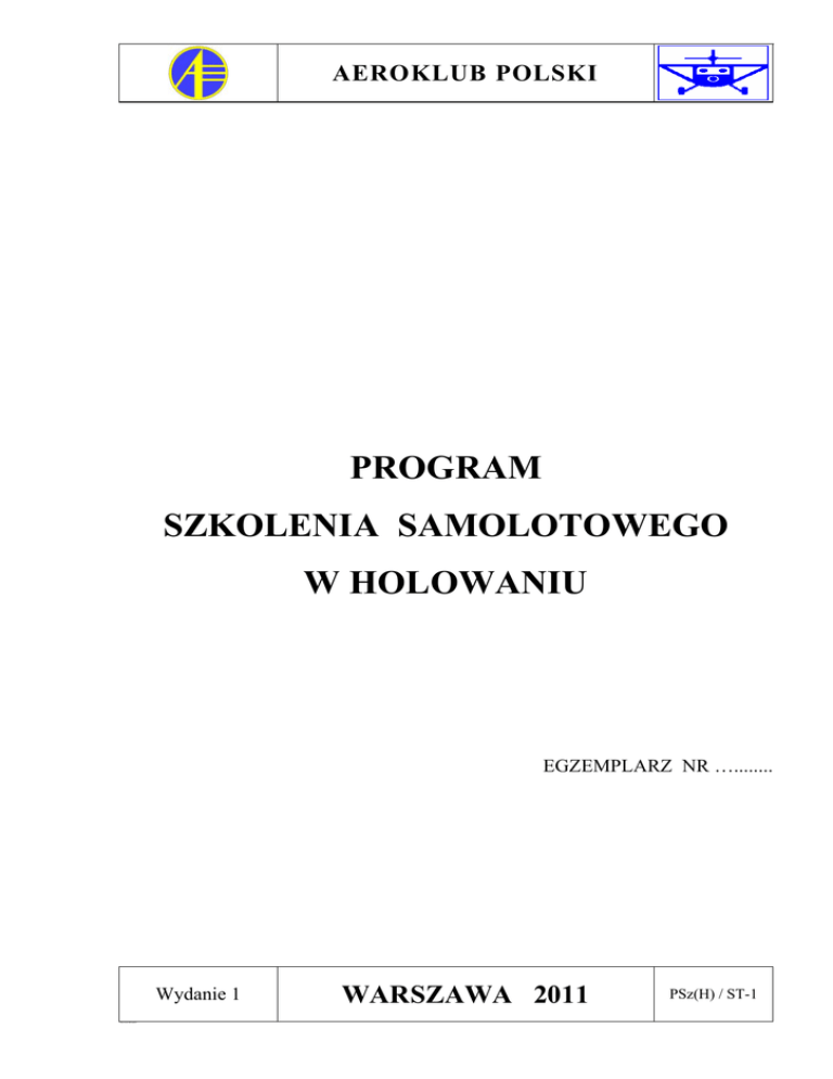 AEROKLUB POLSKI PROGRAM SZKOLENIA SAMOLOTOWEGO W HOLOWANIU EGZEMPLARZ NR …........ Wydanie 1 © Ryszard Michalski WARSZAWA 2011 PSz(H) / ST-1 ROZDZIAŁ 0 PROGRAM SZKOLENIA SAMOLOTOWEGO W HOLOWANIU AEROKLUB POLSKI POŚWIADCZENIE ZATWIERDZENIA PROGRAMU Na podstawie § 11 ust. 1 rozporządzenia Ministra Infrastruktury z dnia 3 września 2003 r. w sprawie licencjonowania personelu lotniczego (D.U. Nr 165 poz. 1603) POŚWIADCZENIE WPROWADZENIA PROGRAMU SZKOLENIA DO UŻYTKU SŁUŻBOWEGO Niniejszy PROGRAM SZKOLENIA SAMOLOTOWEGO W HOLOWANIU został wprowadzony do użytku Zarządzeniem Sekretarza Generalnego Aeroklubu Polskiego. PSz(H) / SZ-2 KARTA ZATWIERDZEŃ Wydanie 1 / 2011 Zmiana Nr 0 © Ryszard Michalski AEROKLUB POLSKI PROGRAM SZKOLENIA SAMOLOTOWEGO W HOLOWANIU KARTA ZMIAN ZMIANA NR 1 do PROGRAMU SZKOLENIA SAMOLOTOWEGO w HOLOWANIU AEROKLUBU POLSKIEGO została zatwierdzona przez Prezesa Urzędu Lotnictwa Cywilnego. Pismo .................................................................... z dnia .................................................................... (m.p) ........................................................................ (pieczęć i podpis osoby uprawnionej) ZMIANA NR 2 do PROGRAMU SZKOLENIA SAMOLOTOWEGO w HOLOWANIU AEROKLUBU POLSKIEGO została zatwierdzona przez Prezesa Urzędu Lotnictwa Cywilnego. Pismo .................................................................... z dnia .................................................................... (m.p) ........................................................................ (pieczęć i podpis osoby uprawnionej) ZMIANA NR 3 PROGRAMU SZKOLENIA SAMOLOTOWEGO w HOLOWANIU AEROKLUBU POLSKIEGO została zatwierdzona przez Prezesa Urzędu Lotnictwa Cywilnego. Pismo .................................................................... z dnia .................................................................... (m.p) ........................................................................ (pieczęć i podpis osoby uprawnionej) ZMIANA NR 4 PROGRAMU SZKOLENIA SAMOLOTOWEGO w HOLOWANIU AEROKLUBU POLSKIEGO w została zatwierdzona przez Prezesa Urzędu Lotnictwa Cywilnego. Pismo .................................................................... z dnia .................................................................... (m.p) ........................................................................ (pieczęć i podpis osoby uprawnionej) Wydanie 1 / 2011 Zmiana Nr 0 © Ryszard Michalski KARTA ZMIAN PSz(H) / KZ-1 KARTA ZMIAN PROGRAM SZKOLENIA SAMOLOTOWEGO W HOLOWANIU AEROKLUB POLSKI ZMIANA NR 5 do PROGRAMU SZKOLENIA SAMOLOTOWEGO w HOLOWANIU AEROKLUBU POLSKIEGO została zatwierdzona przez Prezesa Urzędu Lotnictwa Cywilnego. Pismo .................................................................... z dnia .................................................................... (m.p) ........................................................................ (pieczęć i podpis osoby uprawnionej) ZMIANA NR 6 PROGRAMU SZKOLENIA SAMOLOTOWEGO w HOLOWANIU AEROKLUBU POLSKIEGO została zatwierdzona przez Prezesa Urzędu Lotnictwa Cywilnego. Pismo .................................................................... z dnia .................................................................... (m.p) ........................................................................ (pieczęć i podpis osoby uprawnionej) ZMIANA NR 7 PROGRAMU SZKOLENIA SAMOLOTOWEGO w HOLOWANIU AEROKLUBU POLSKIEGO została zatwierdzona przez Prezesa Urzędu Lotnictwa Cywilnego. Pismo .................................................................... z dnia .................................................................... (m.p) ........................................................................ (pieczęć i podpis osoby uprawnionej) ZMIANA NR 8 PROGRAMU SZKOLENIA SAMOLOTOWEGO w HOLOWANIU AEROKLUBU POLSKIEGO została zatwierdzona przez Prezesa Urzędu Lotnictwa Cywilnego. Pismo .................................................................... z dnia .................................................................... (m.p) ........................................................................ (pieczęć i podpis osoby uprawnionej) PSz(H) / KZ-2 KARTA ZMIAN Wydanie 1 / 2011 Zmiana Nr 0 © Ryszard Michalski AEROKLUB POLSKI PROGRAM SZKOLENIA SAMOLOTOWEGO W HOLOWANIU ROZDZIAŁ 0 ROZDZIAŁ 0 ADMINISTROWANIE PROGRAMEM 0.1 ZAKRES SZKOLENIA LOTNICZEGO, KTÓREGO PROGRAM DOTYCZY 0.1.1 Program Szkolenia Samolotowego na Holowaniu, określa zakres wymaganego dodatkowego szkolenia teoretycznego i praktycznego dla kandydatów ubiegających się o uzyskanie kwalifikacji pilotażowych w lotach połączonych z holowaniem szybowców i innych przedmiotów (transparentów, banerów). 0.1.2 Zakres stosowania Programu. 1. Program przewidziany jest do stosowania w Organizacji Szkolenia Aeroklubu Polskiego oraz innych ośrodkach. 2. Wszyscy użytkownicy Programu zobowiązani są w trakcie szkolenia do ścisłego przestrzegania jego wymogów oraz postępowania zgodnego z obowiązującymi przepisami lotniczymi. Znajomość treści Programu jest obowiązkiem wszystkich osób prowadzących szkolenie oraz osób szkolonych zgodnie z jego wymogami. 0.1.3 Użycie nazw i numeracja: 1. Niniejszy Program Szkolenia Samolotowego w Holowaniu, nazywany również dalej Programem lub w skrócie PSz(H). 2. Organizacja Szkolenia Lotniczego Aeroklubu Polskiego lub Ośrodek nazywany jest w dalszym tekście organizacją / ośrodkiem. 3. Numeracja ZADAŃ Programu powiązana jest z literami alfabetu H, I. 4. Numeracja ĆWICZEŃ powiązana jest z literą alfabetu i cyframi np. ĆW. H/1. ------------------ Wydanie 1 /2011 Zmiana Nr 0 © Ryszard Michalski ADMINISTROWANIE PSz(H) / 0-1 ROZDZIAŁ 0 0.2 AEROKLUB POLSKI PROGRAM SZKOLENIA SAMOLOTOWEGO W HOLOWANIU OŚWIADCZENIE SZEFA SZKOLENIA AEROKLUBU POLSKIEGO 0.2.1 Oświadczenie o zgodności Programu z wszystkimi przepisami mającymi zastosowanie oraz zobowiązanie do jej utrzym